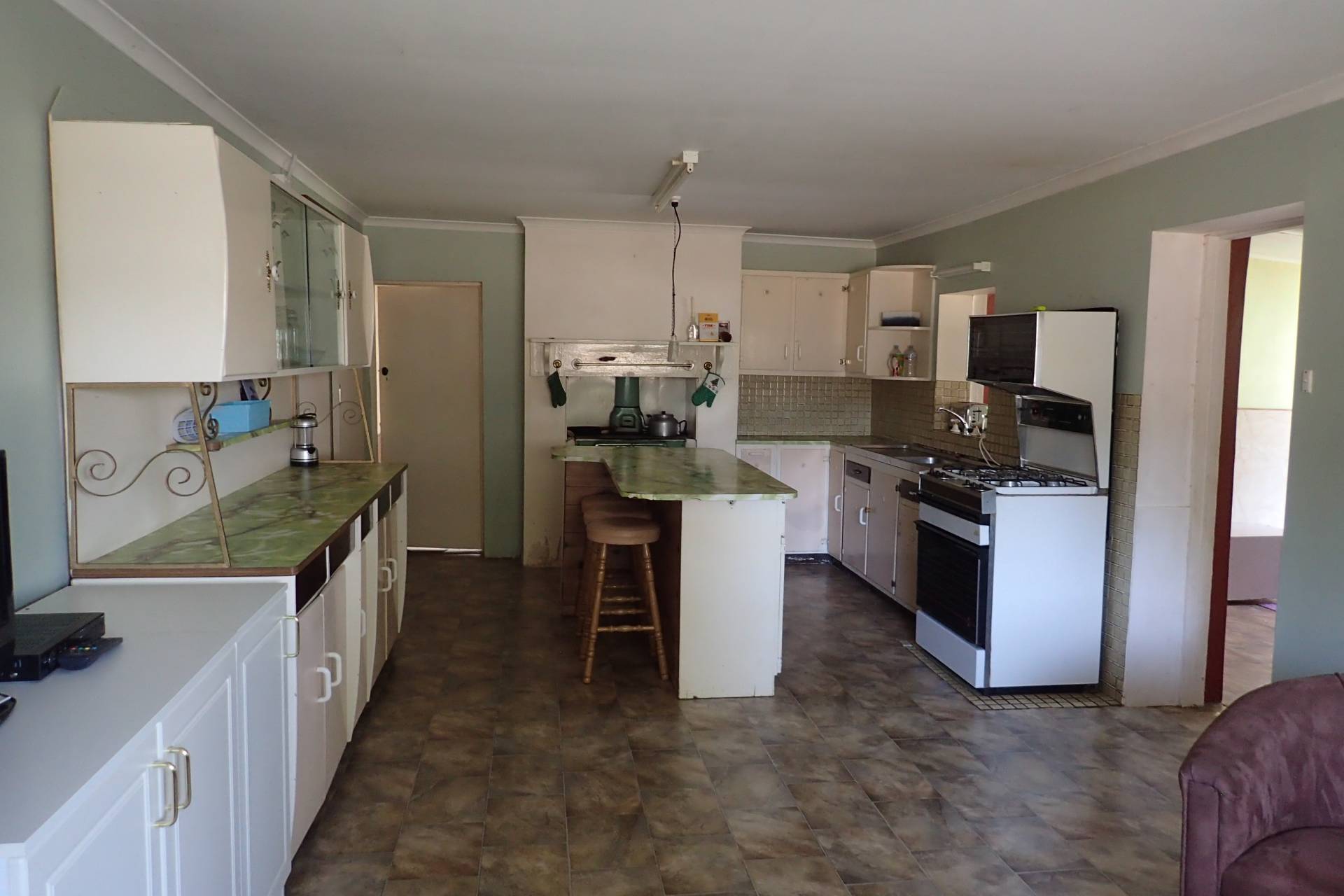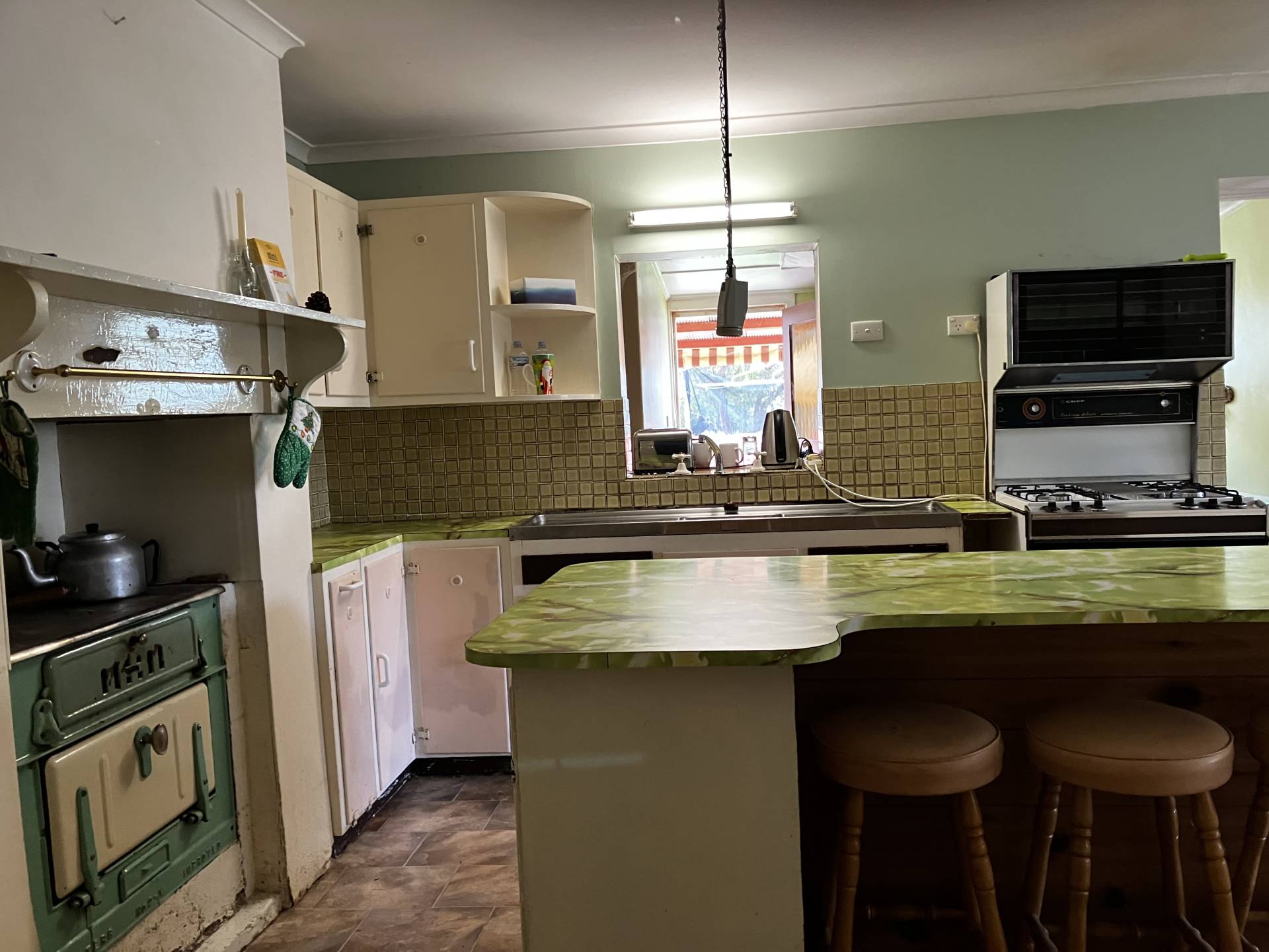 • Kitchen is a traditional country layout with large bench space and central island bench, lino floor, freestanding gas cooktop/oven with original Metters wood stove