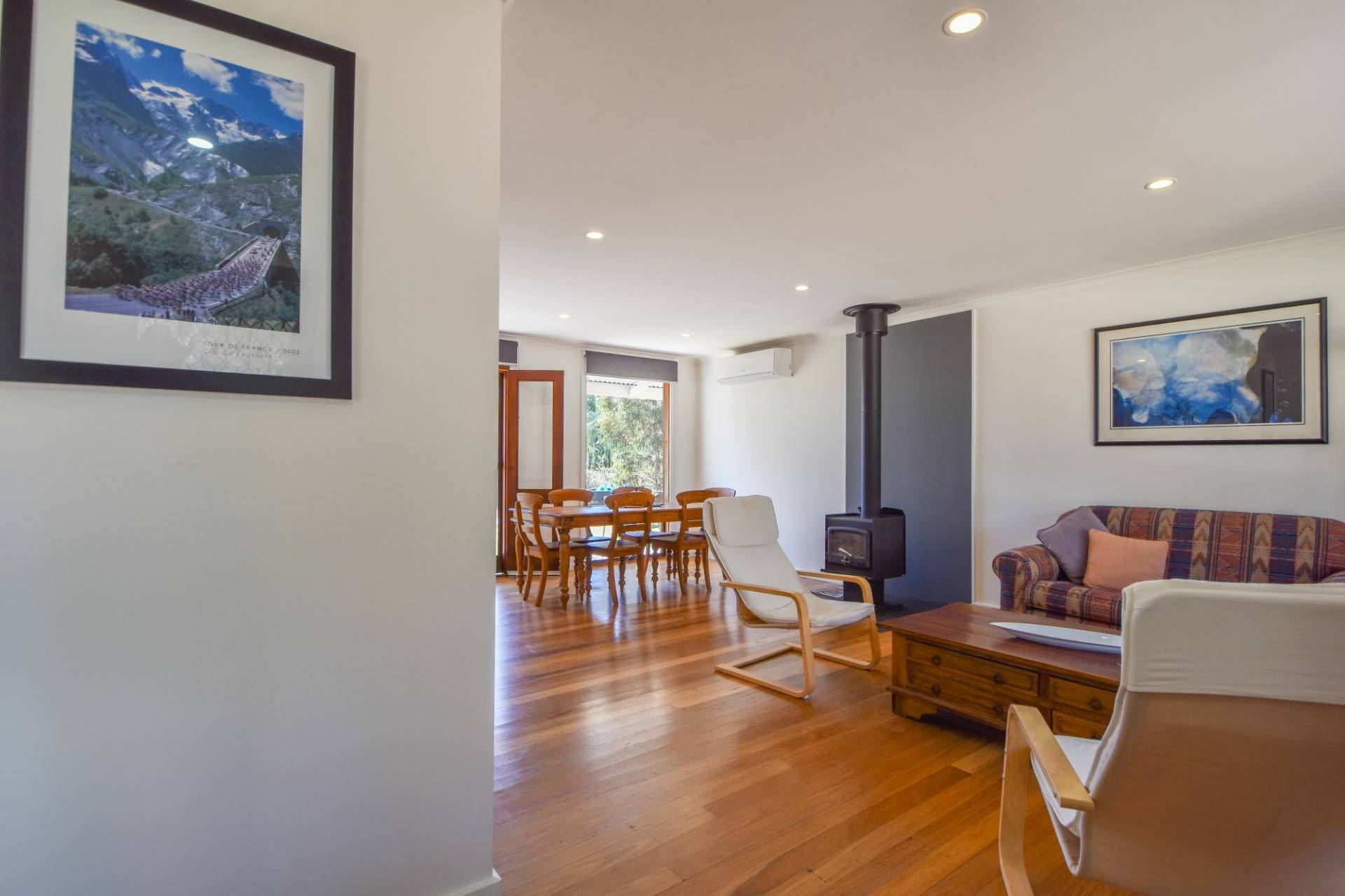 • The open plan living and dining area feature Australian hardwood floors flowing down the hallway, french doors to the back yard, combustion wood heater and split system air conditioner.