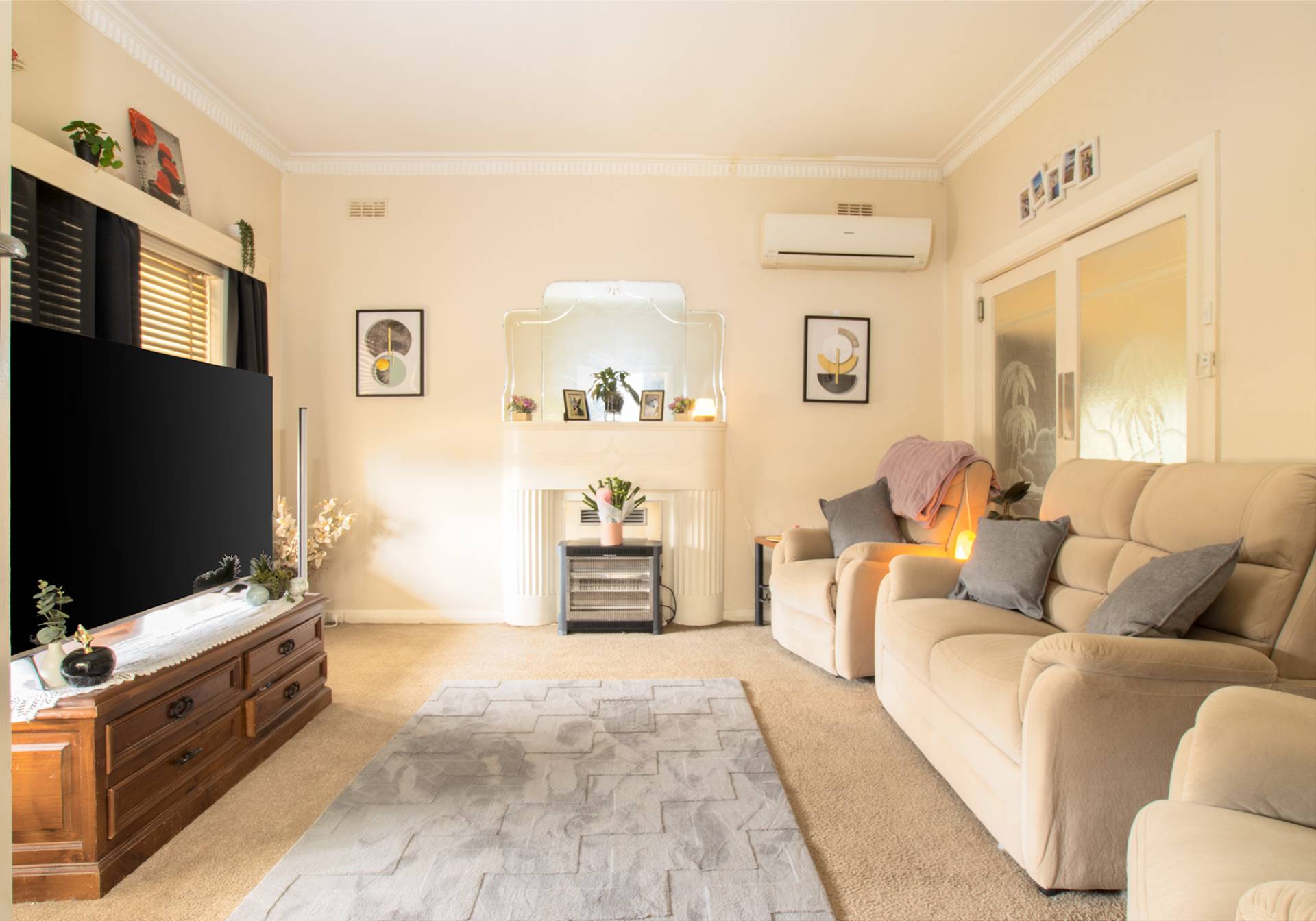 Lounge room with split system air conditioner and ceiling fan. Recently updated kitchen and dining room with modern flooring throughout.