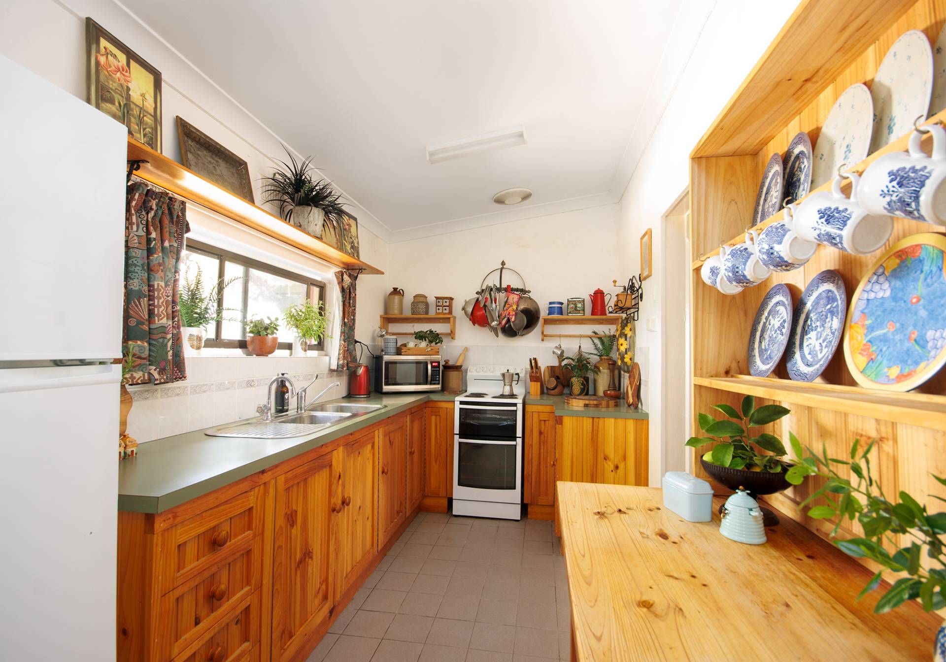 Renovated Kitchen: The modern, renovated kitchen is equipped timber cupboards, electric stove, double sink and a window view to the garden
