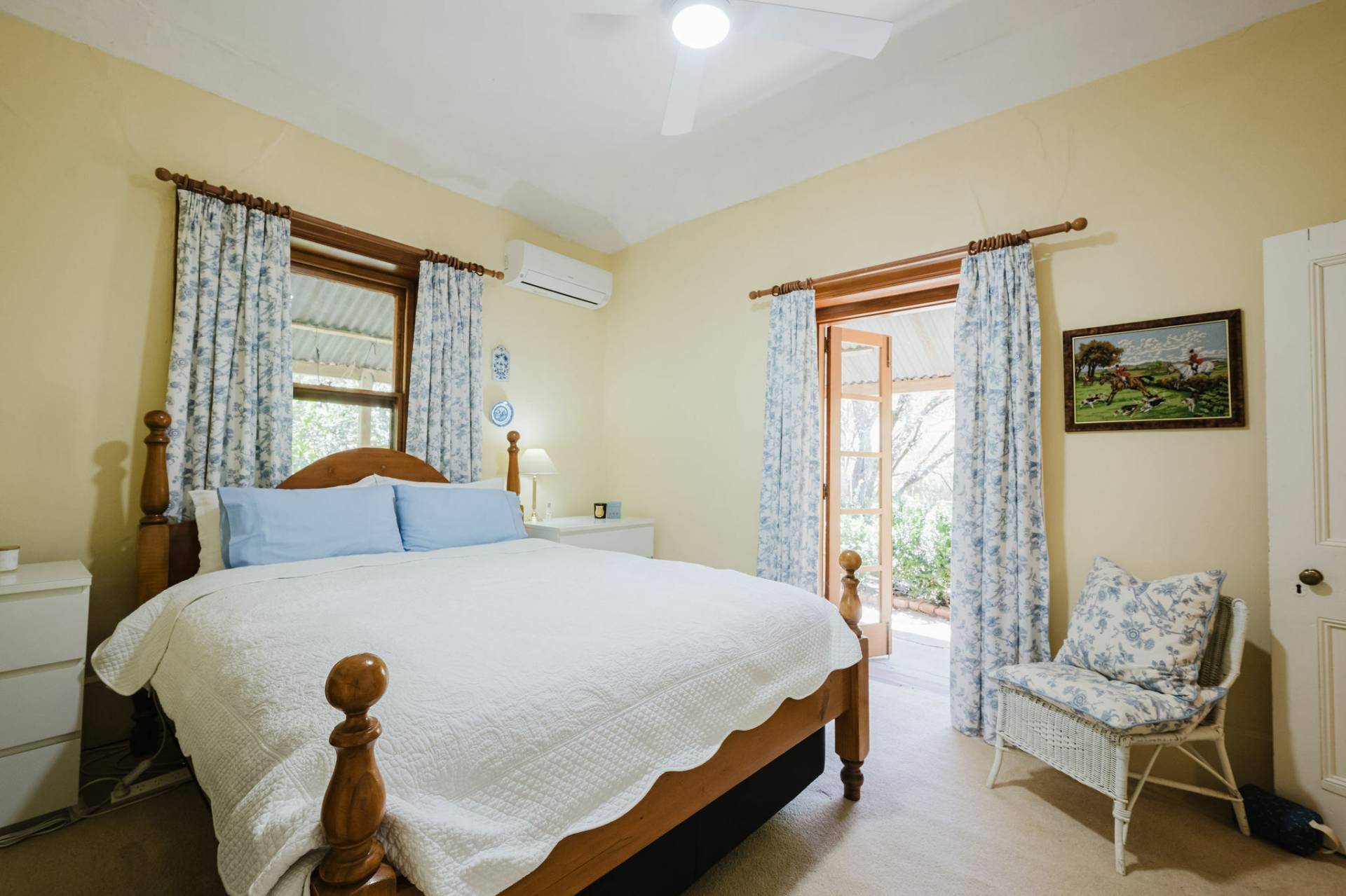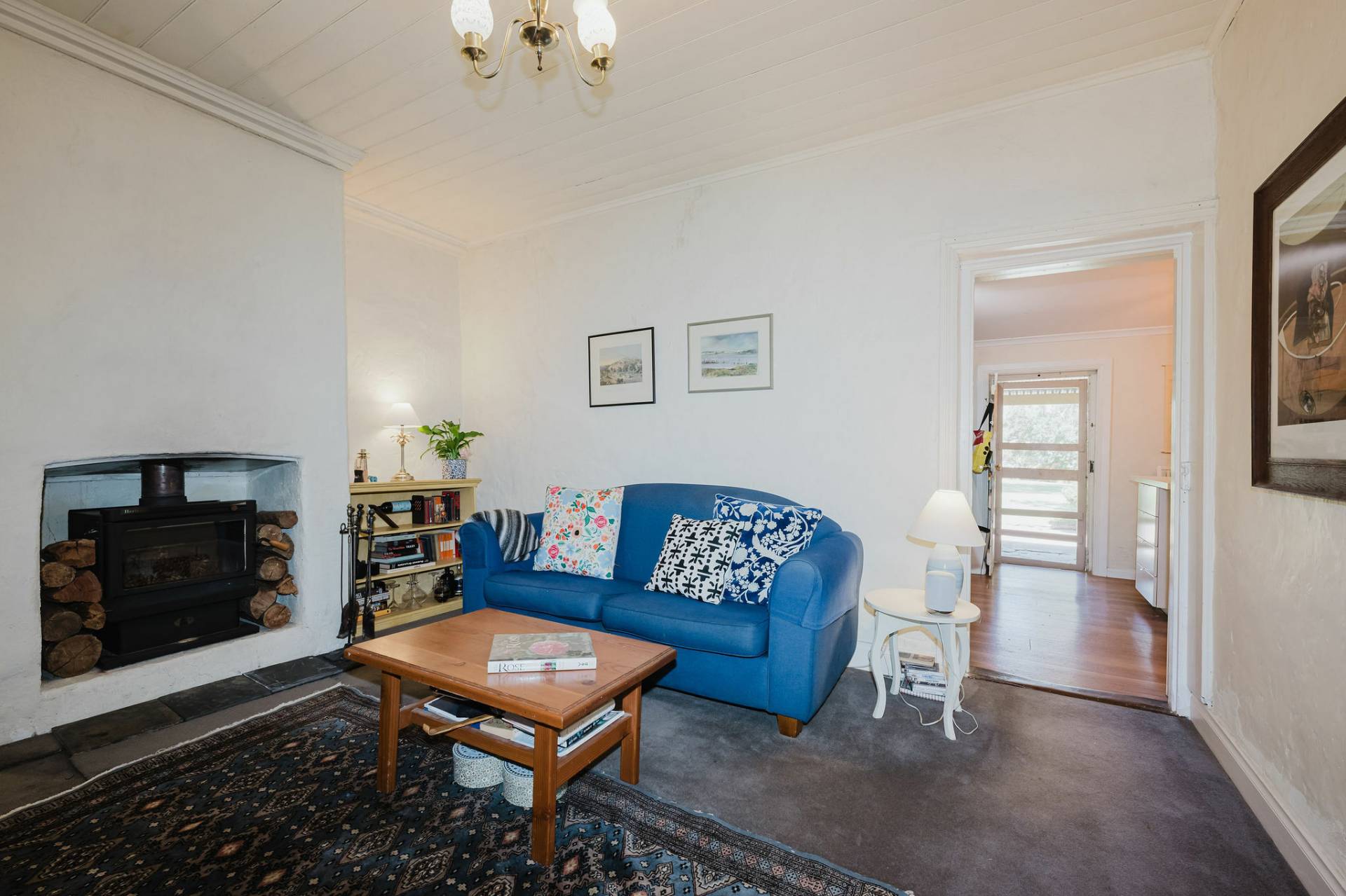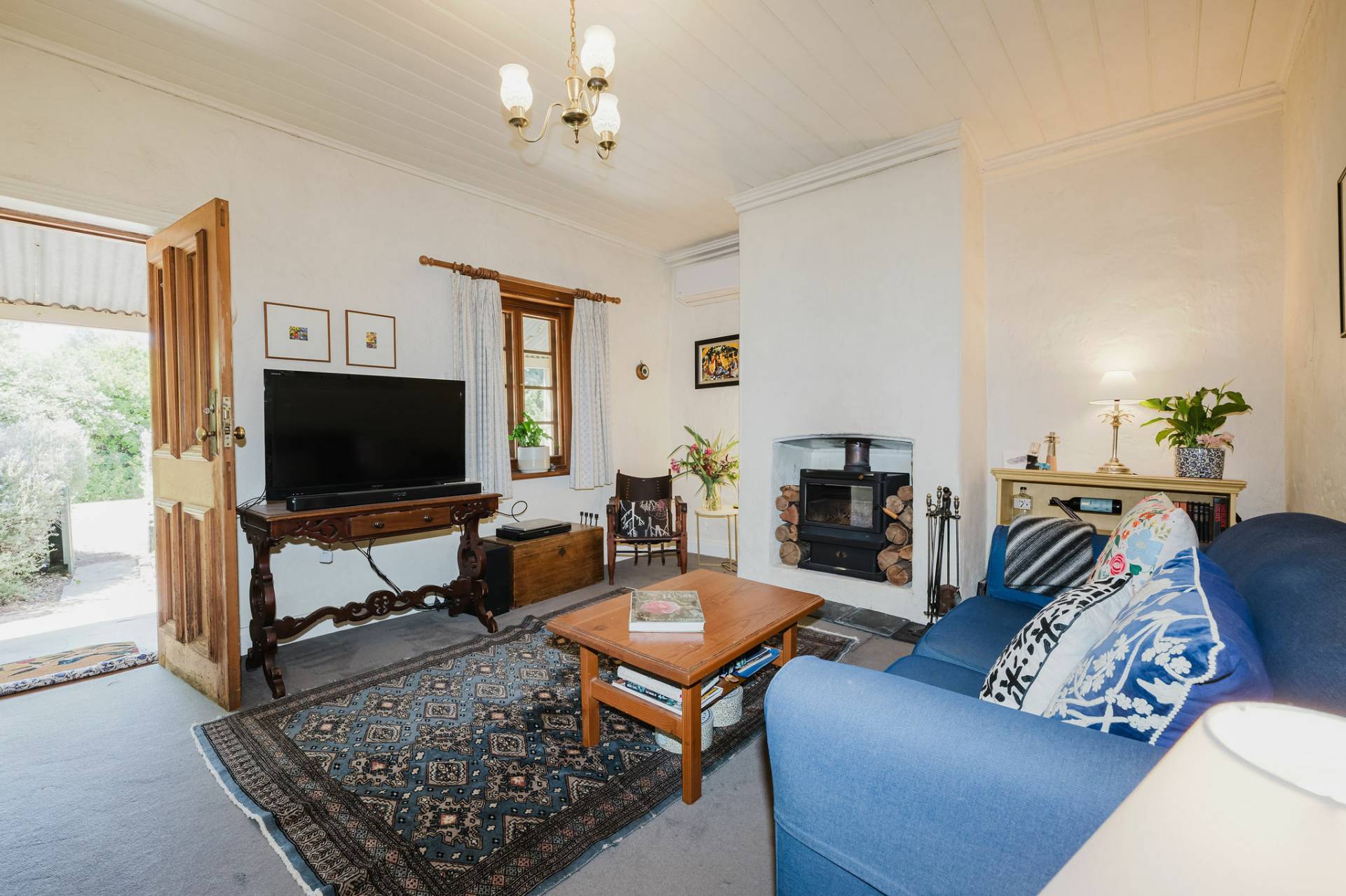 Featuring two spacious bedrooms with timber windows and French doors plus a modern bathroom which adds convenience. The cosy lounge features matchboard ceilings and is comforted by combustion heater and split system.  A country-style kitchen, complete with wood oven, is ideal for relaxed living. Outside, the manicured garden provides a serene outdoor space, and the home is surrounded by front, side and rear verandahs. In addition, there is a dual gravel driveway, lawn areas, fruit trees and vegetable patch.