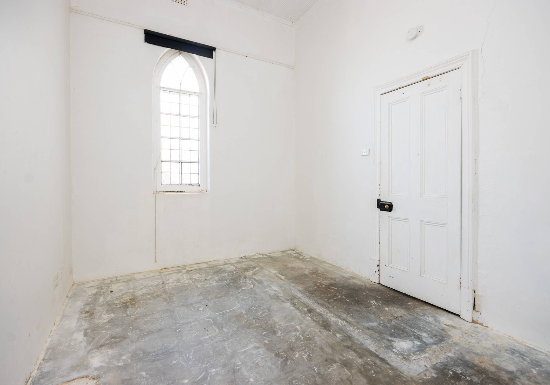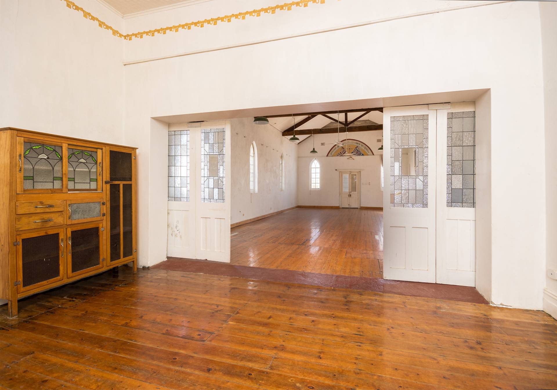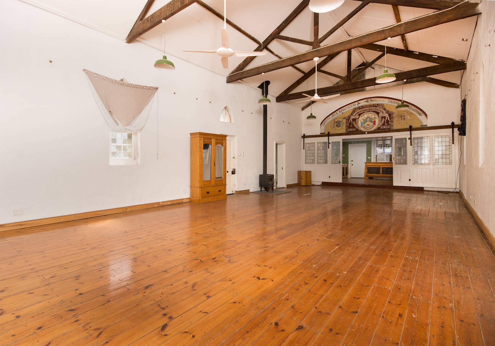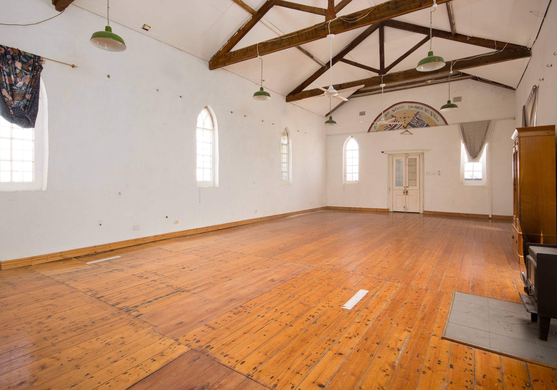 Through the lobby doors, youre welcomed by polished floorboards stretching the length of the hall and former sacristy. The architecture boasts stunning pointed lead-light arch windows and original exposed beams. Ceiling fans and suspended lighting enhance the ambiance, while a cozy combustion wood heater warms the space, flanked by timeless artwork that adds an artistic touch to both ends of the hall.