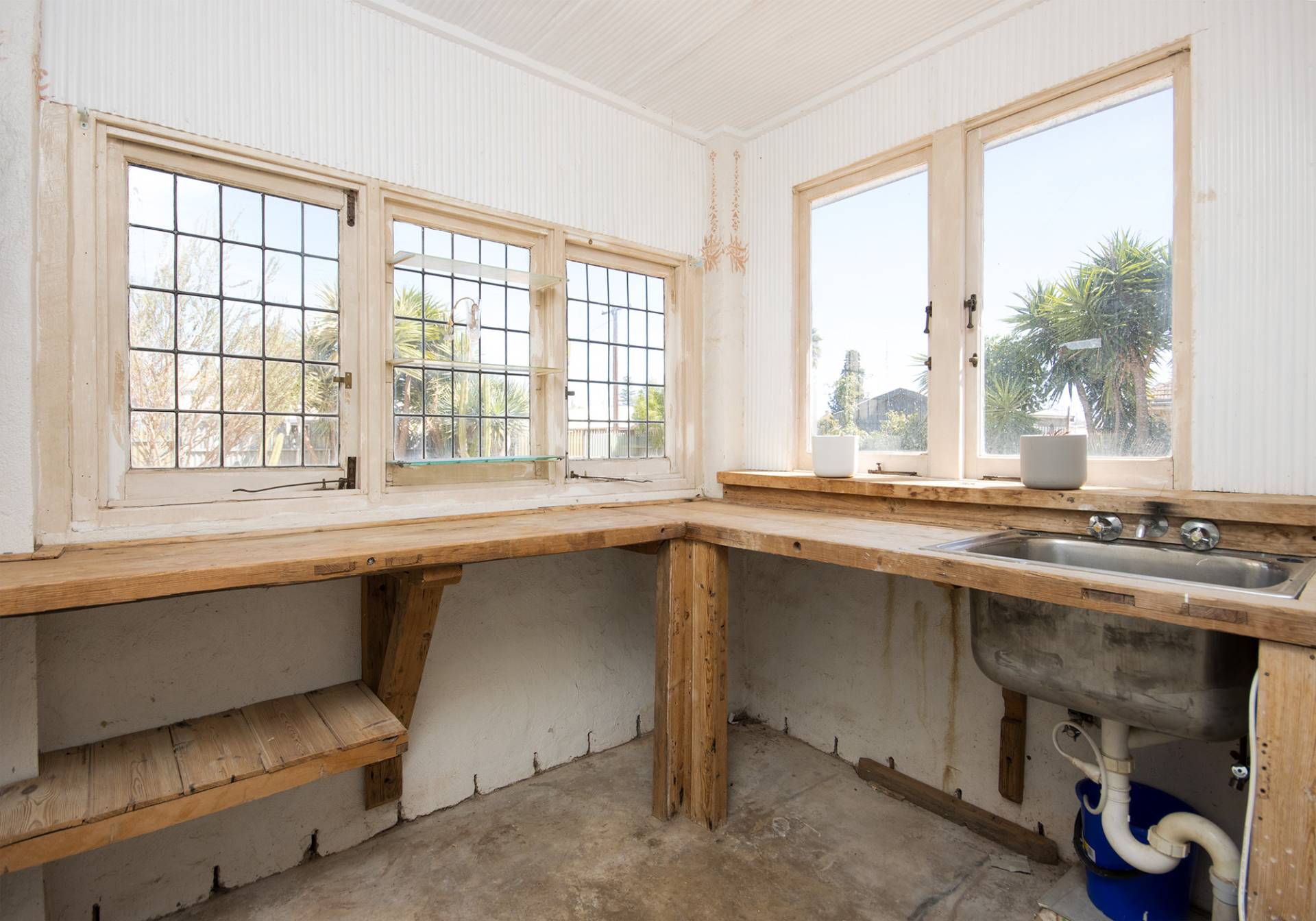 Sliding barn-style doors with lead-light accents lead into the kitchen, where charm meets functionality. Polished floors continue here, complementing the modern amenities: electric cooking, twin sinks, wall-mounted heating and cooling, and a ceiling fan. This space opens to a rear verandah, offering a peaceful retreat.