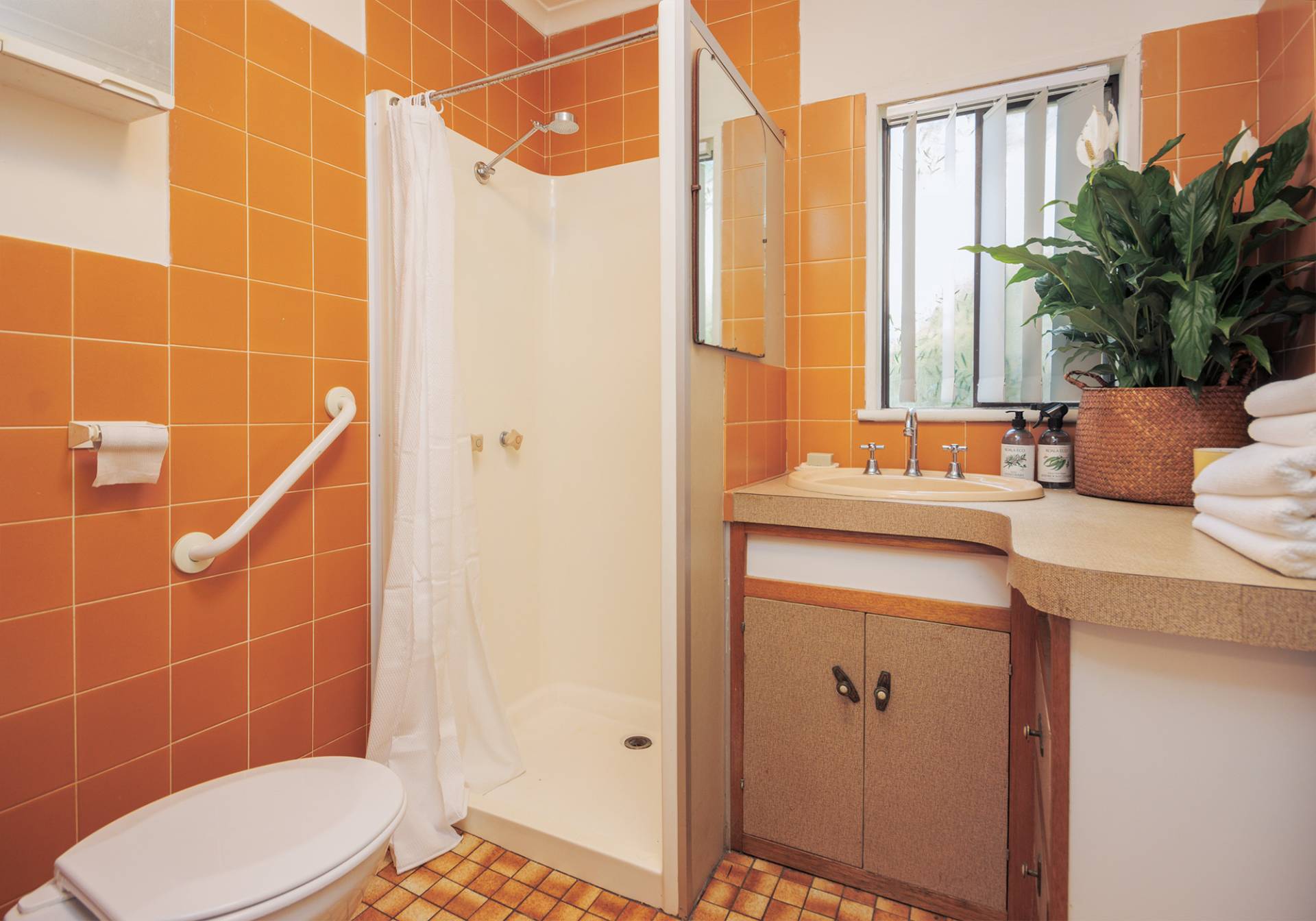 The compact yet functional bathroom includes a shower, vanity, and toilet, making it ideal for relaxing after a day at the beach.