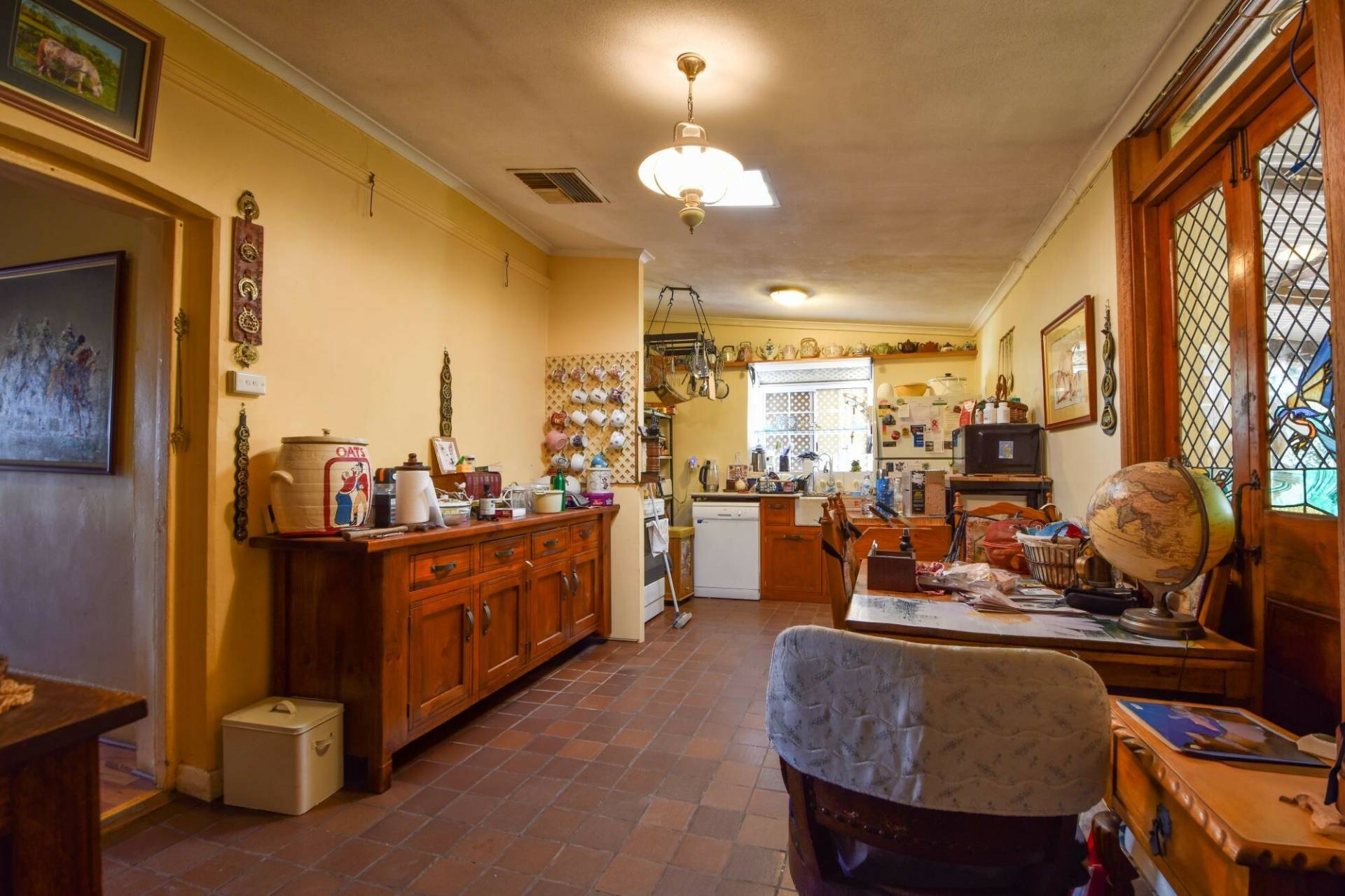 The main residence boasts three spacious bedrooms, a central hallway leading to a cosy lounge room, and a kitchen/meals area adorned with stained glass French doors. The kitchen is equipped with modern conveniences such as electric stove, dishwasher, and walk in pantry. A quaint bathroom with a stained glass window over the bath, a separate shower, and a timber vanity adds a touch of elegance. The functional laundry with storage and separate toilet complete the home's practical layout.