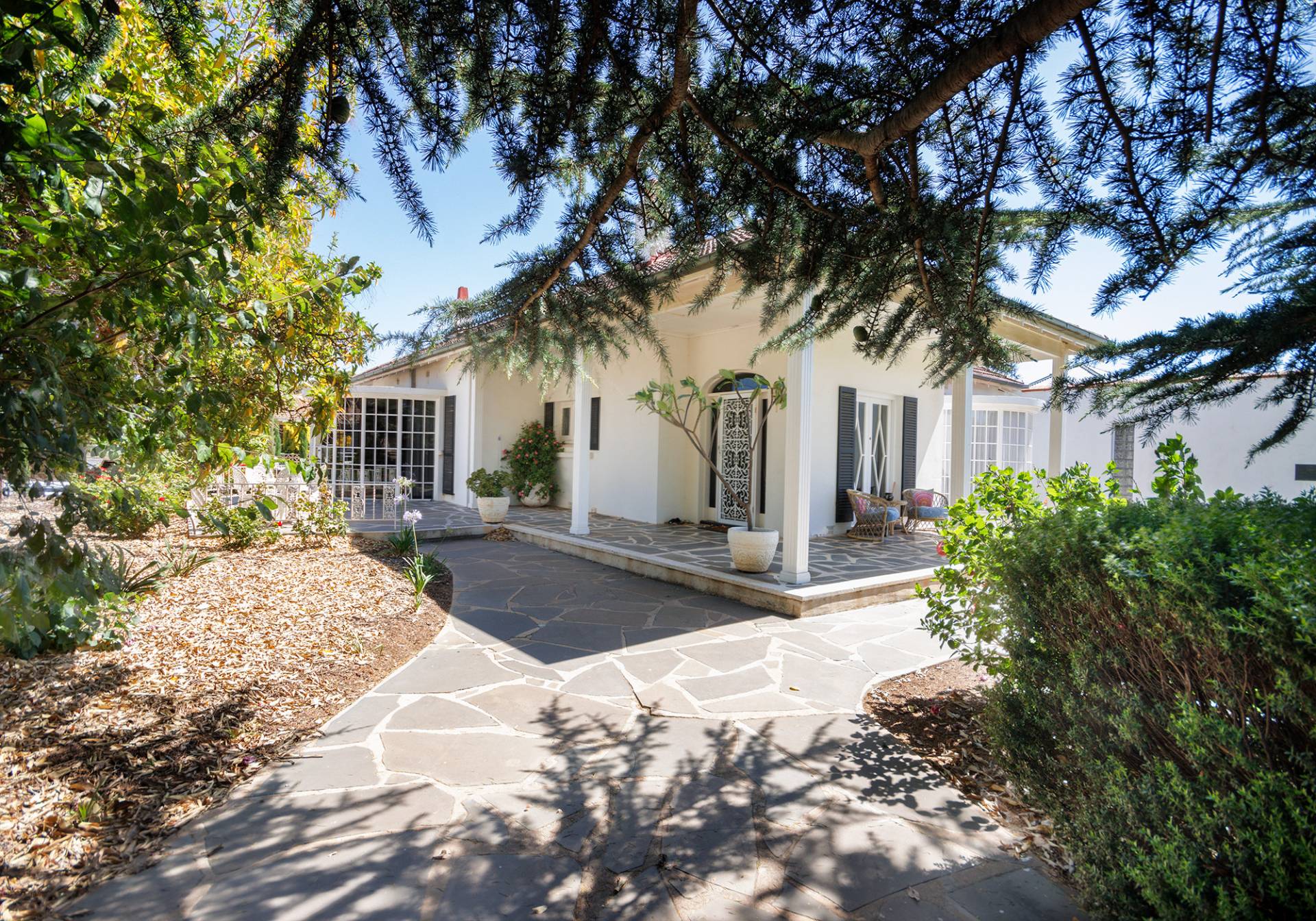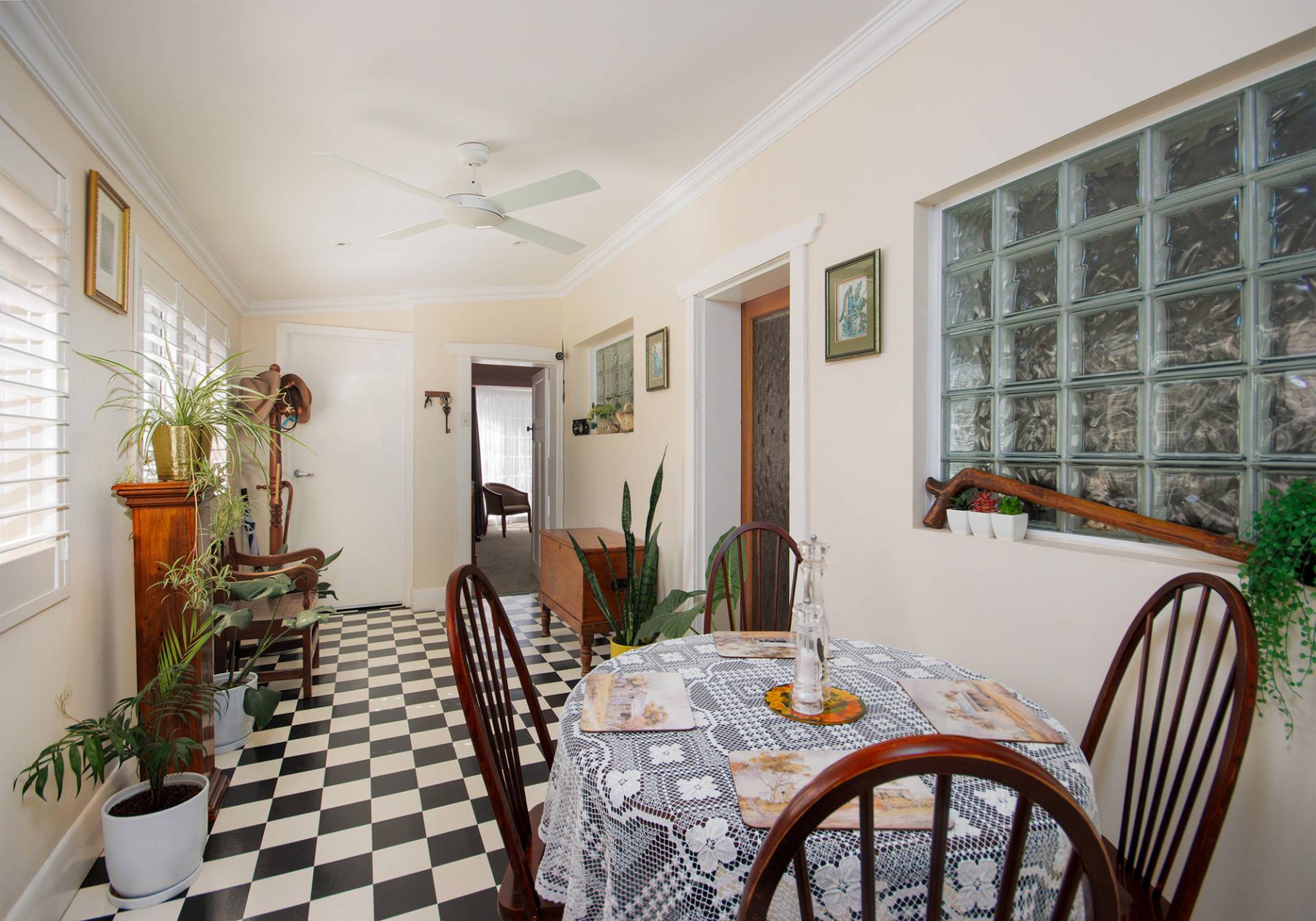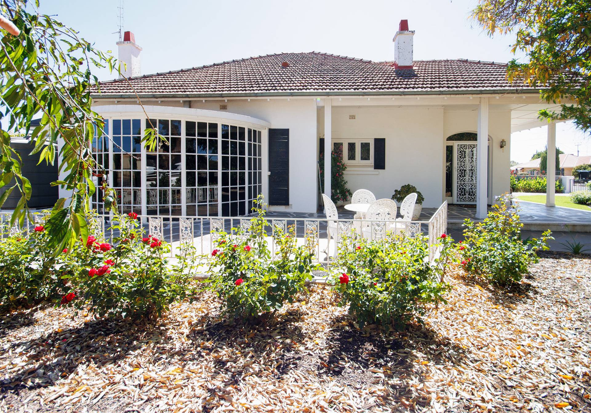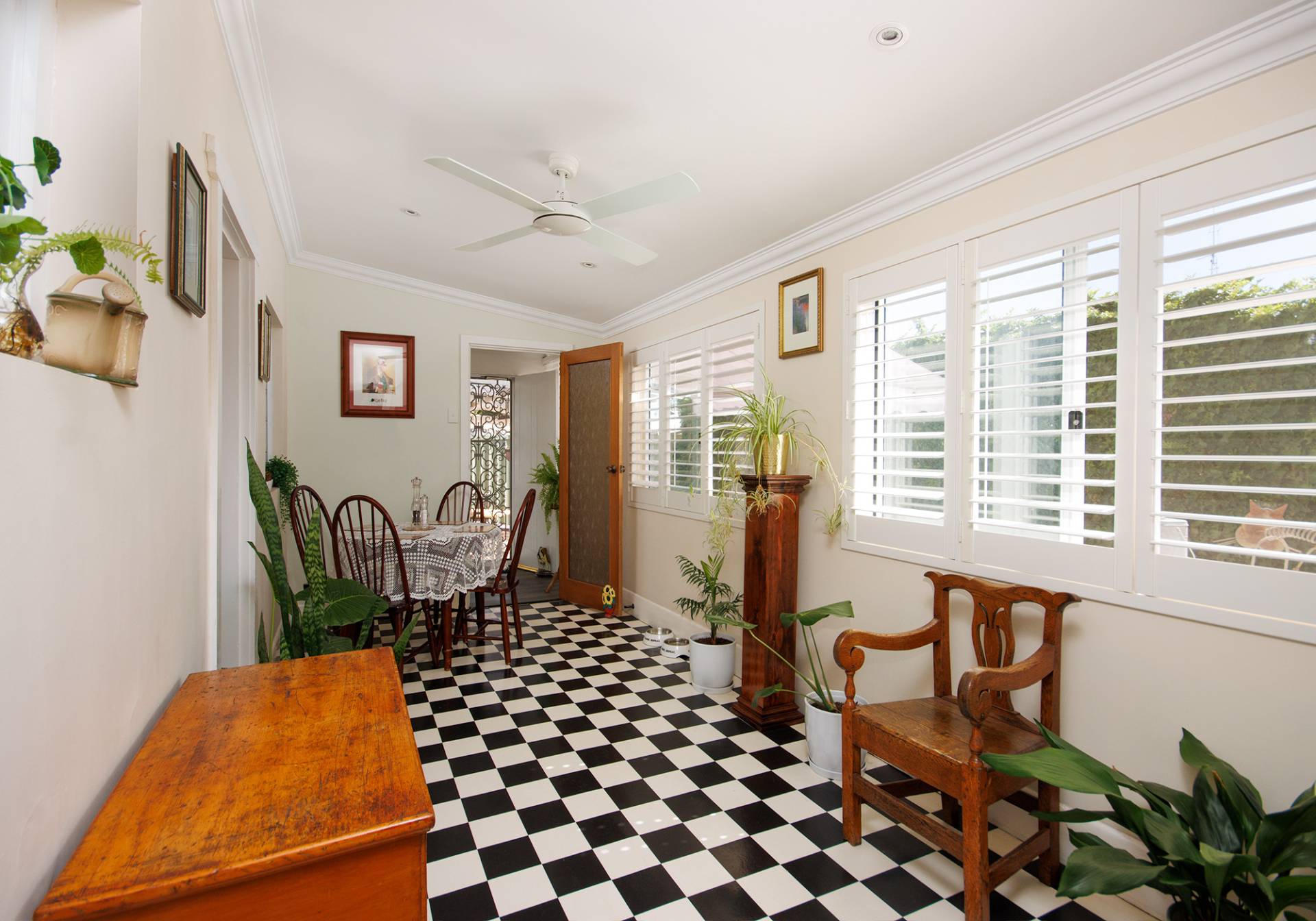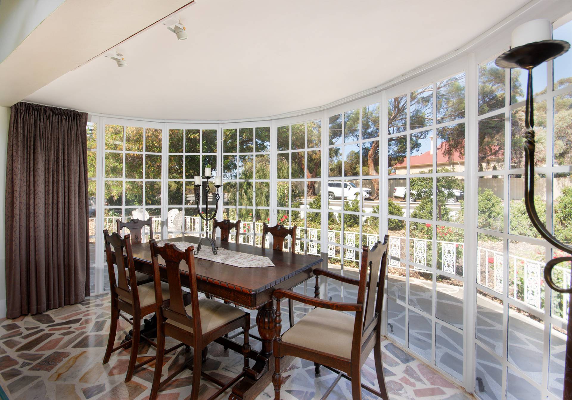 The dining area has been beautifully restored to its former glory, with Terrazzo flooring, and the phenomenal views out into the lush gardens via the large bay window. The window glass is tinted and provides privacy from the exterior of the home, just another touch of comfort to the home.