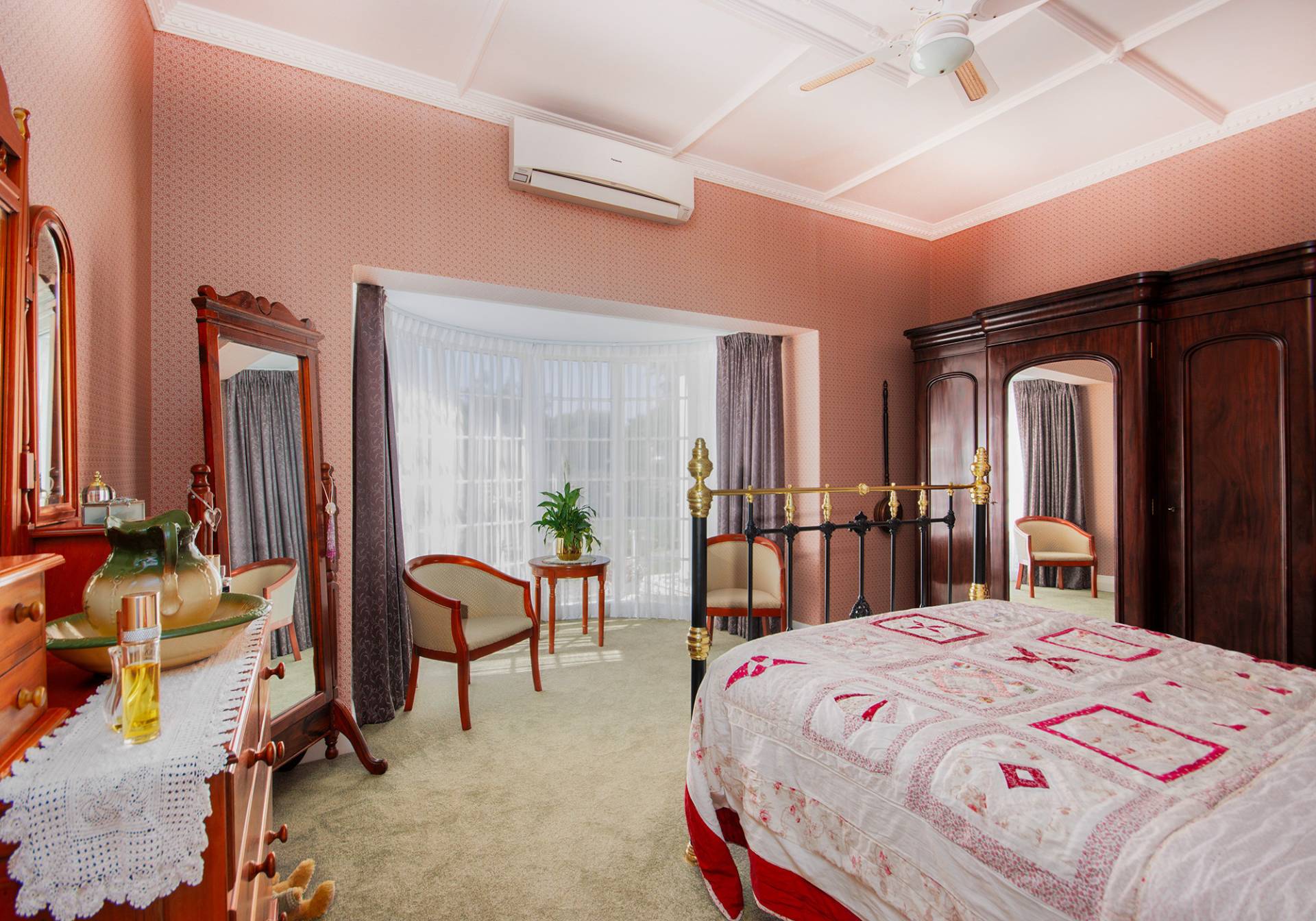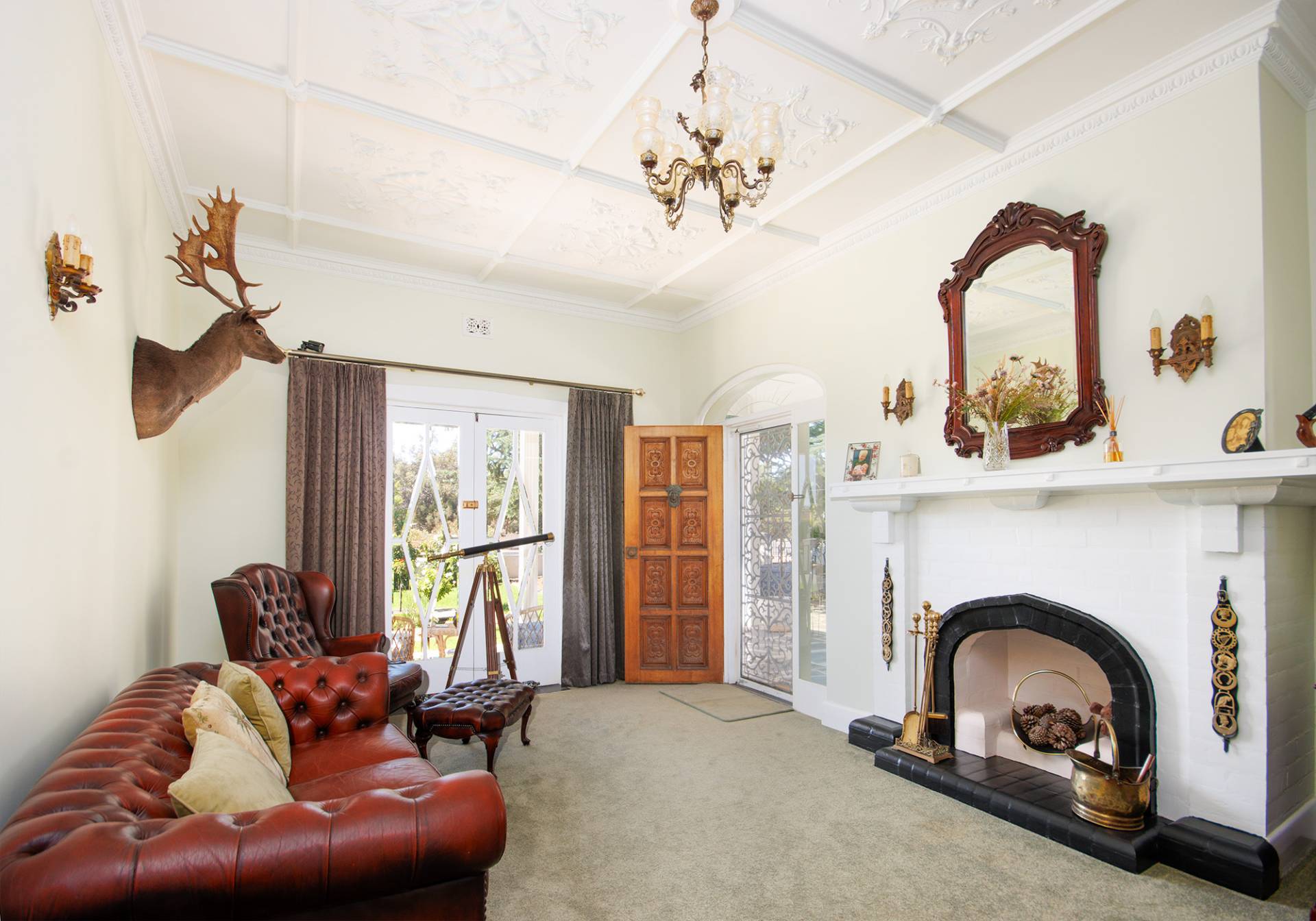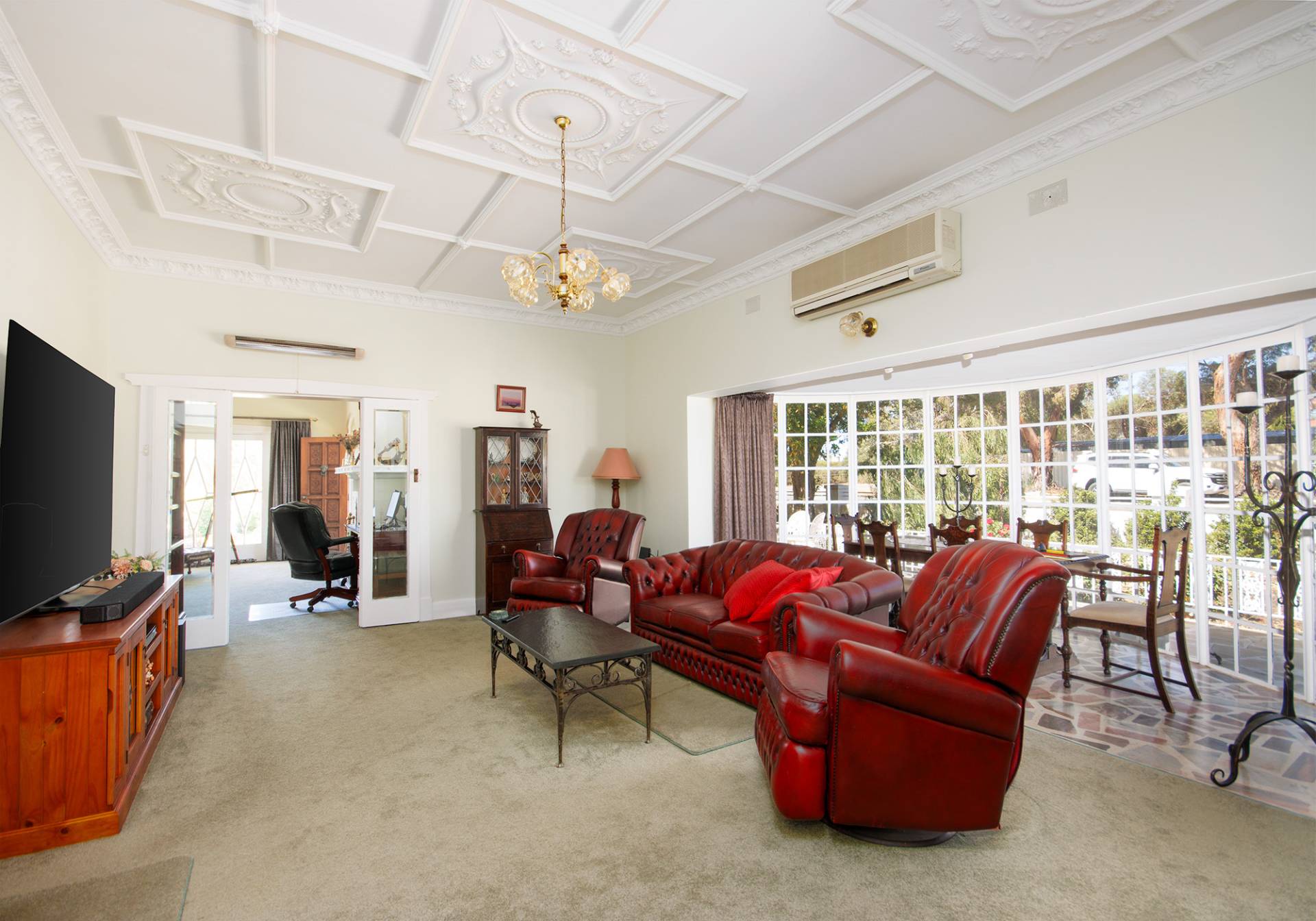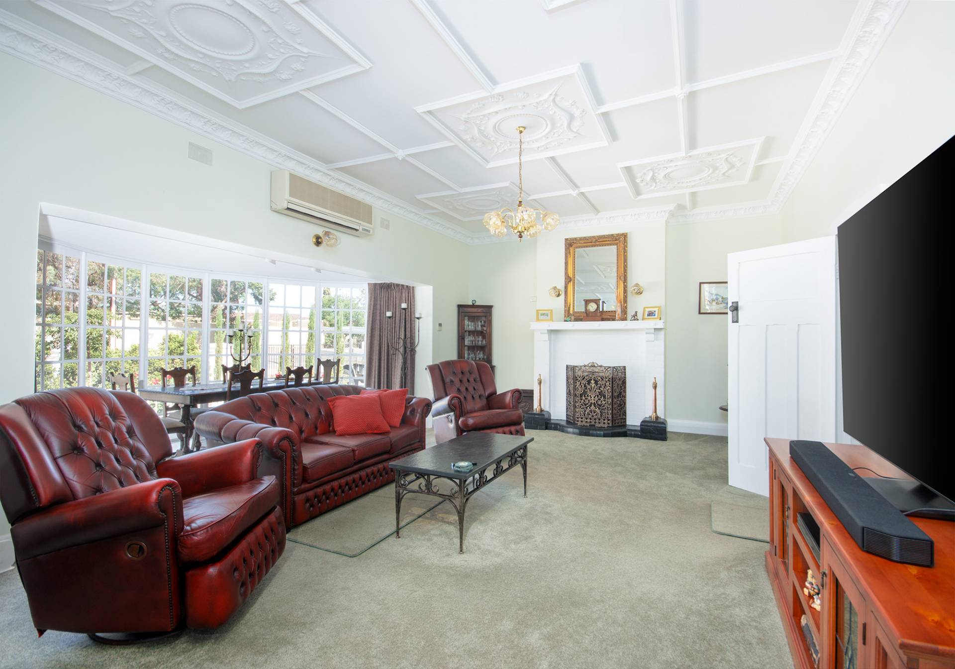 Entering the front of the home you’re welcomed into the formal lounge room with striking ornate ceilings, classy brick fireplace and mantel piece, step through the original bi-fold doors into the large lounge and dining area, ornate ceilings again present along with a second brick fireplace and mantlepiece with slow combustion heater and a large split system air conditioner comfortably services the entire area for all year climate control.