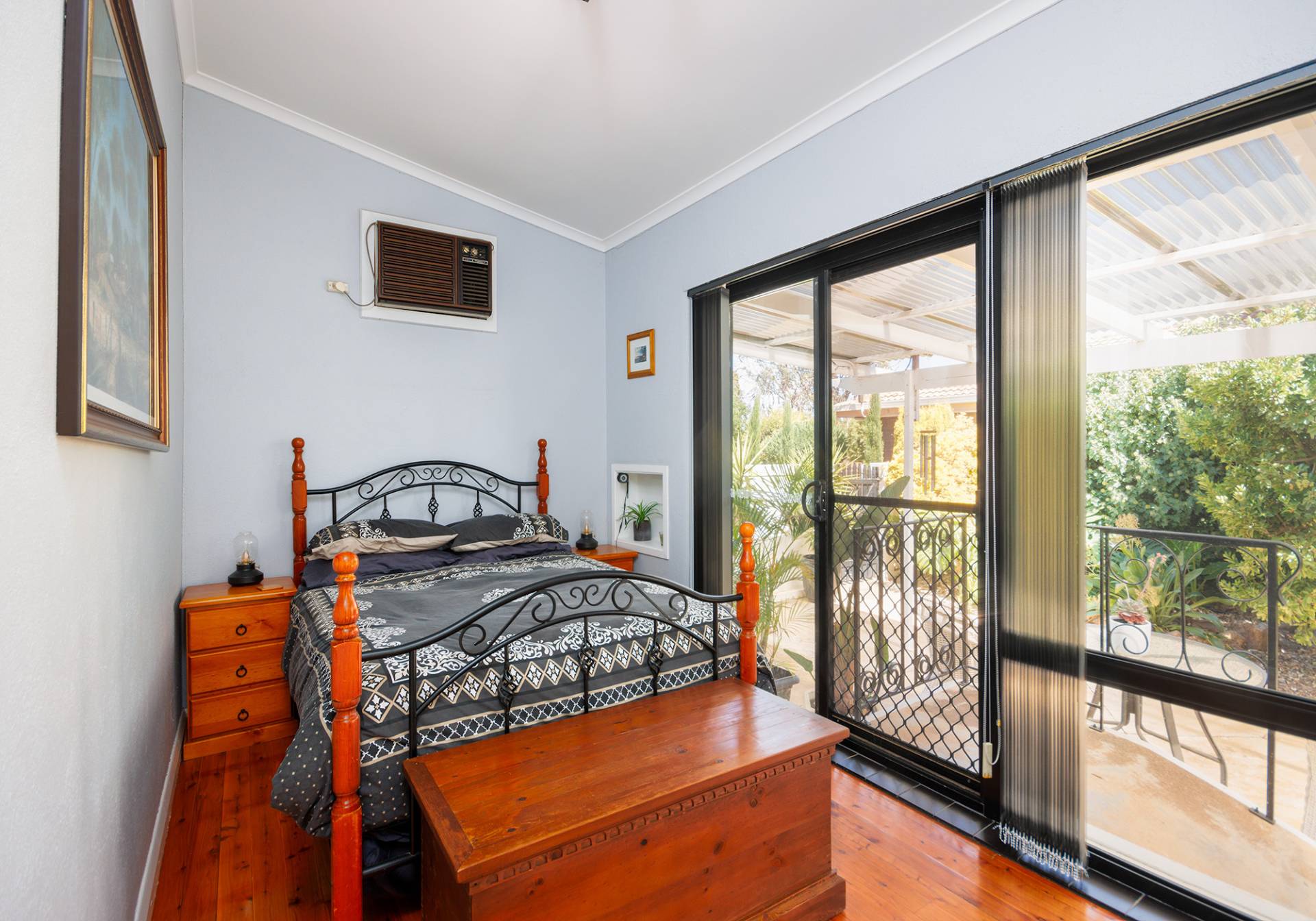 Primary bedroom is spacious, providing a ceiling fan and split system air conditioner and a continuation of the Art Deco theme with an inviting south facing bay window looking out towards the front yard. Second bedroom has dual access doors, whilst third bedroom has walk in robe, split system air conditioner and external access door making it the perfect room for a teenage retreat where they can come and go as they please.