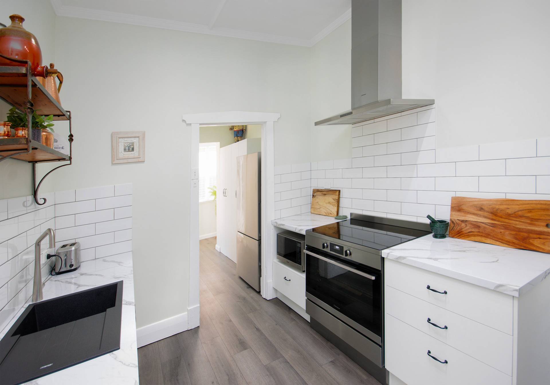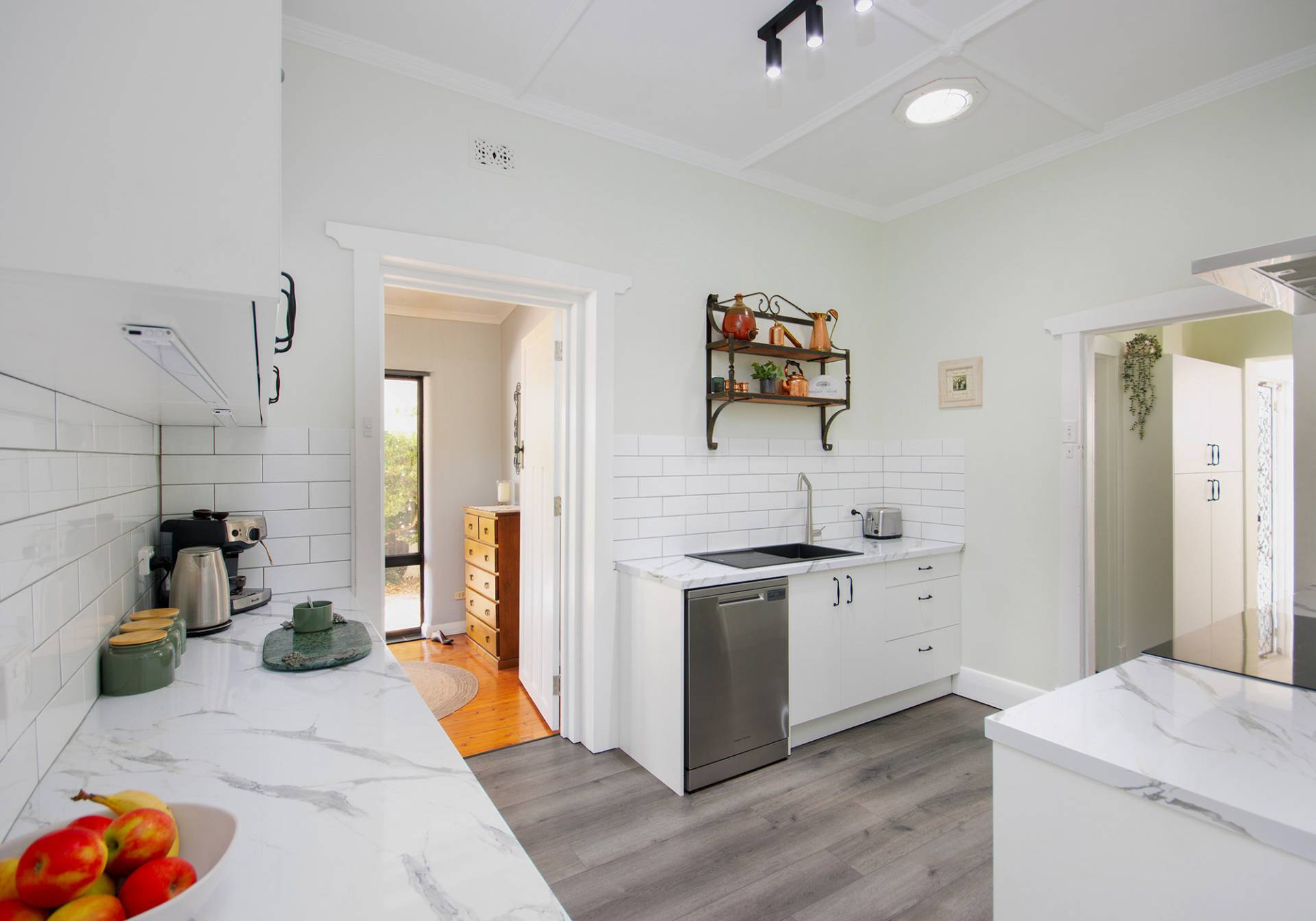 Proving that a touch of modernity can tastefully compliment a home like this is the recently refurbished kitchen, featuring white subway tiles, quality benchtops, large electric oven and cooktop, plentiful storage, a dishwasher, and a walk-through pantry just off the kitchen, this area of the home provides the strong heartbeat that every home with this much character requires.