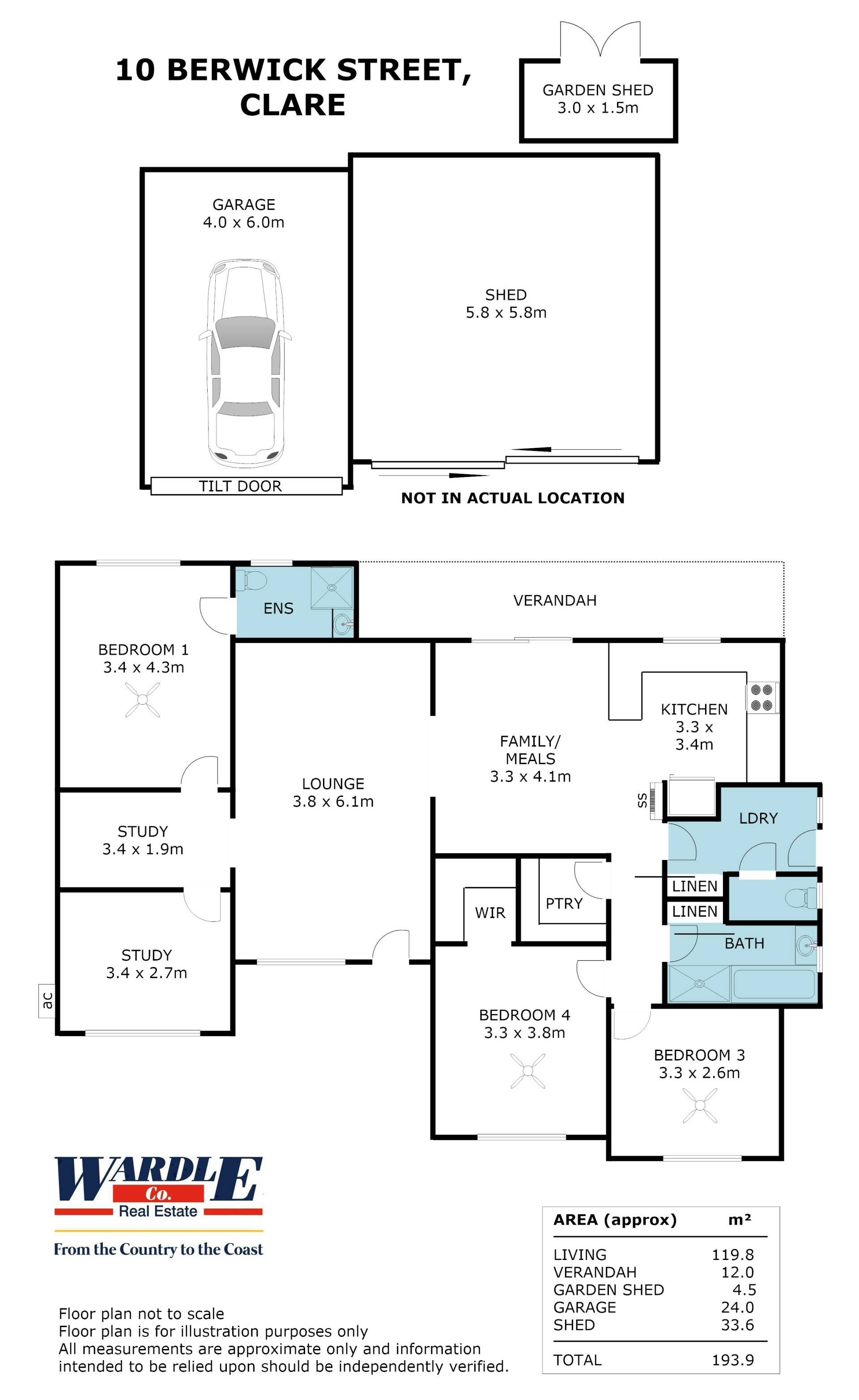 Quality fixtures and fittings throughout the home and split system air conditioning for year-round comfort.  Rear verandah for entertaining.   The outdoor areas include a secure 4m x 6m* garage, a 5.8m x 5.8m* rumpus/workshop or studio and a garden shed for storing tools.  Fully fenced, with established fruit trees and garden areas. 6.56kW* solar power.