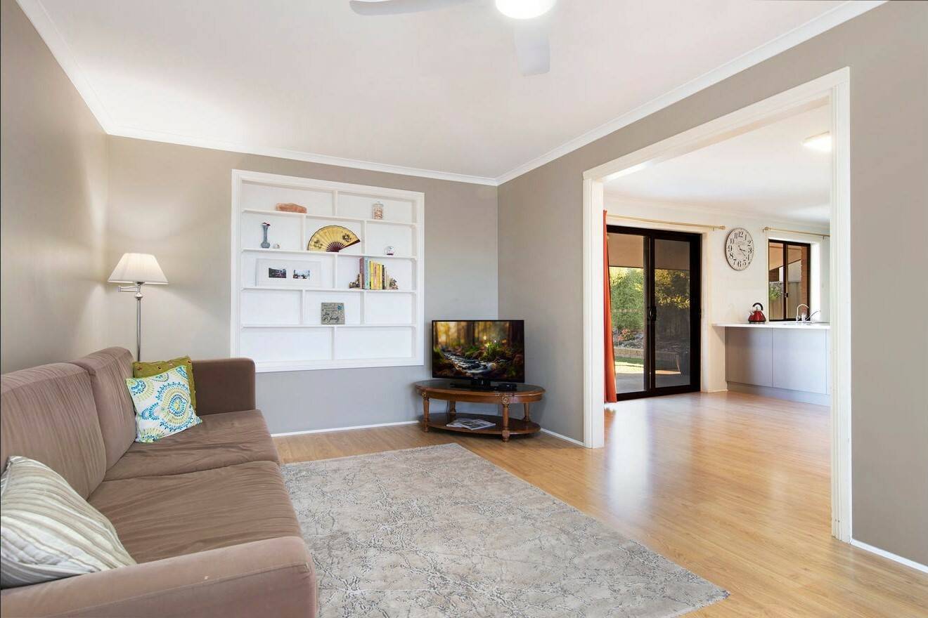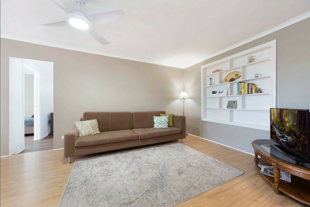 The lounge room features a display/bookshelf and floating flooring throughout the home for ease of maintaining and comfort.