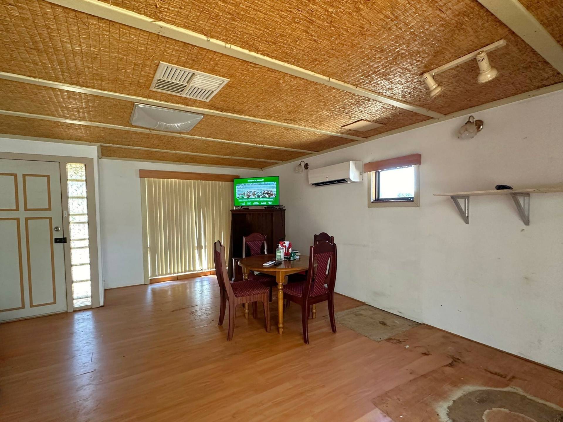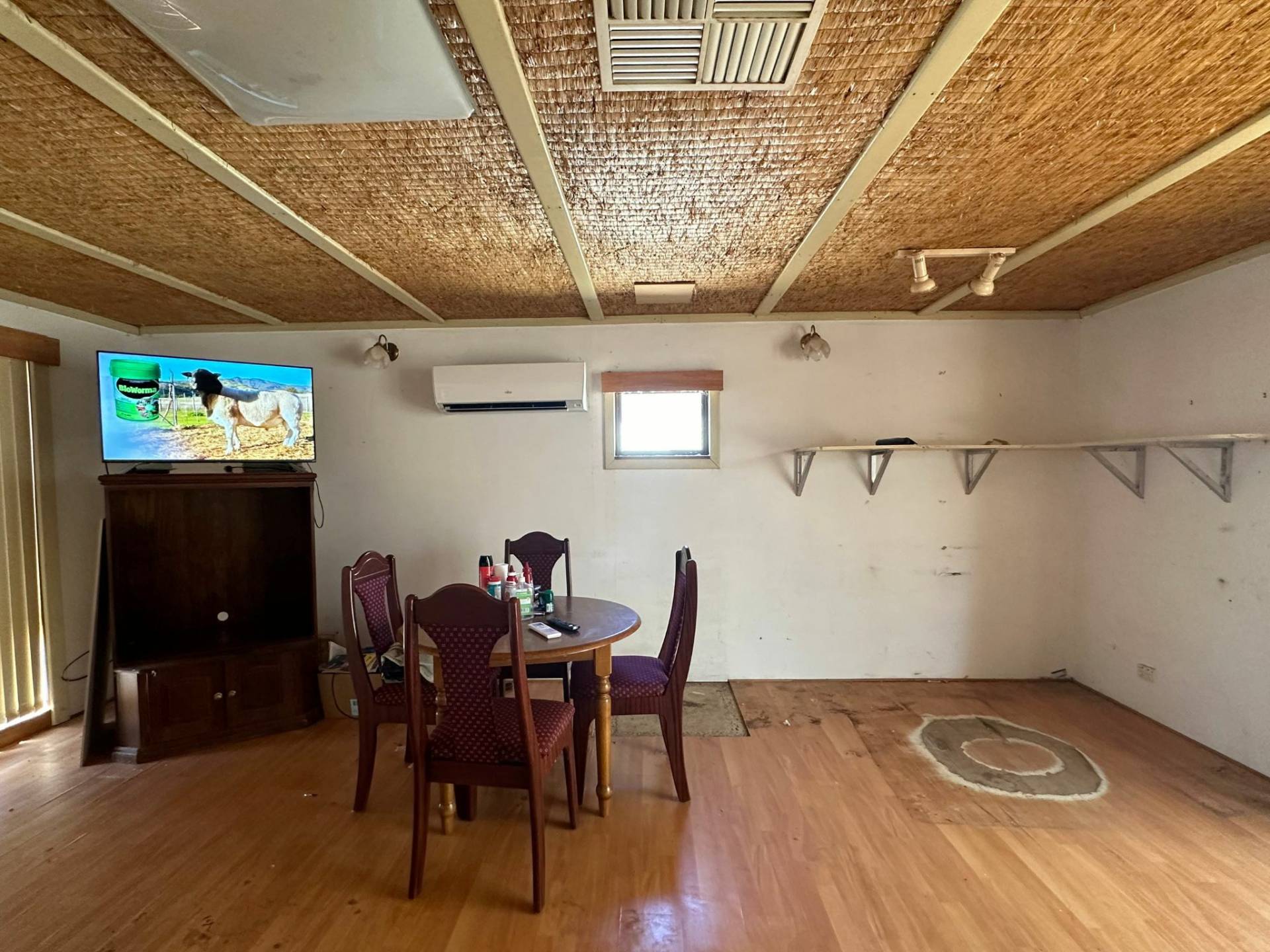 This property offers an open-plan living, dining, and kitchen area equipped with reverse cycle air conditioning for year-round comfort. The kitchen features a breakfast bar, a single stainless steel sink, and a large window overlooking the outdoor space