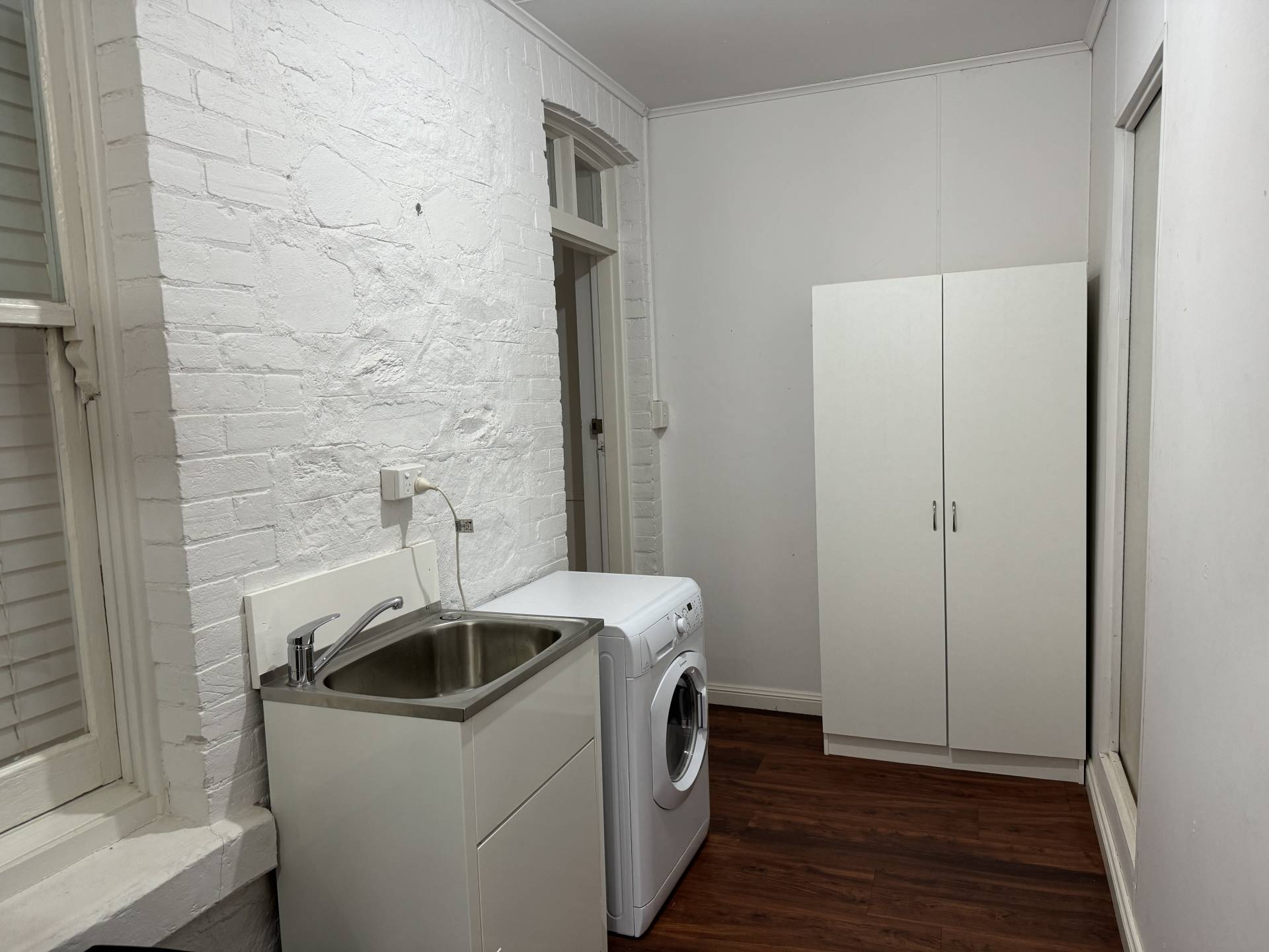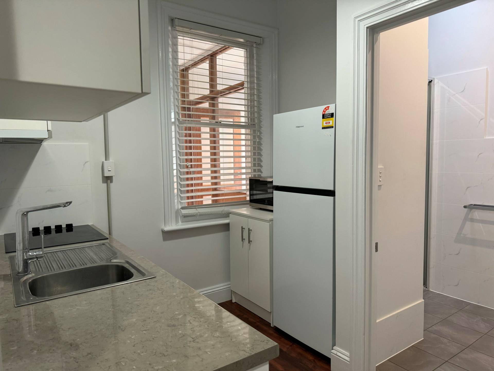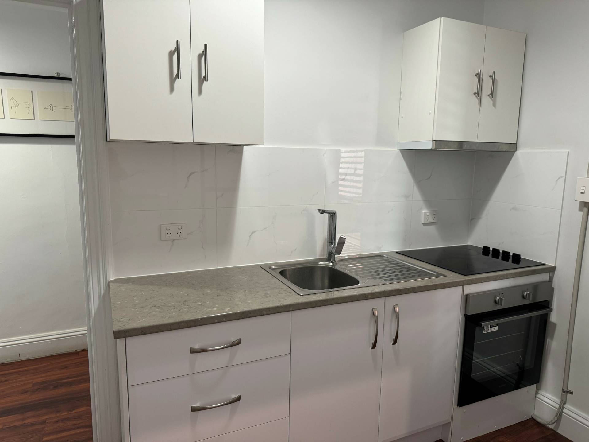 - Kitchen with electric cook top & oven, fridge, microwave & pantry cupboard.