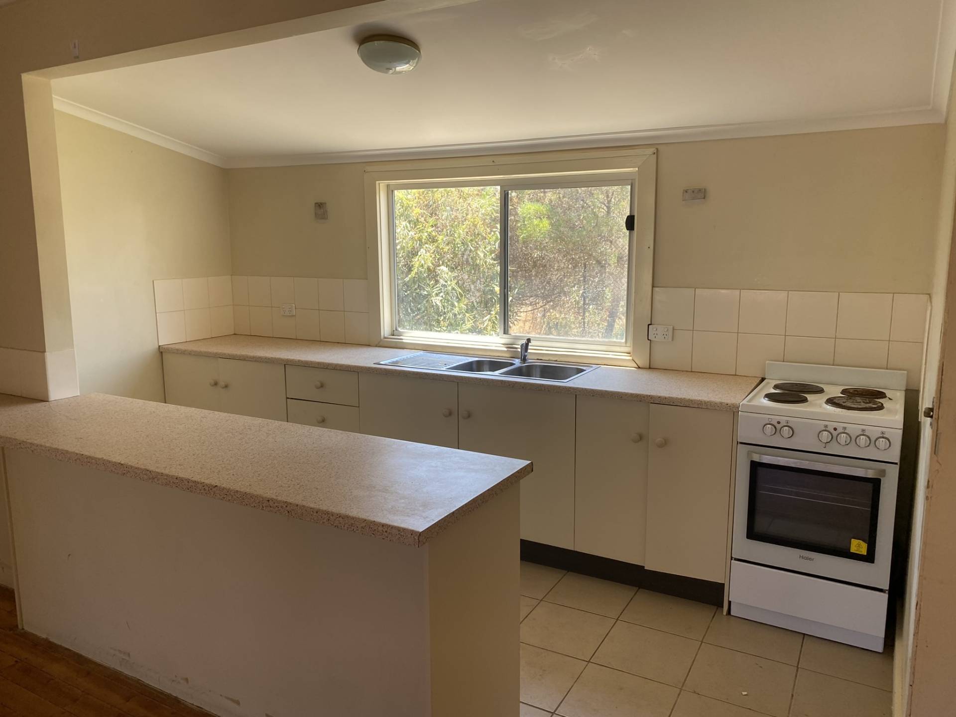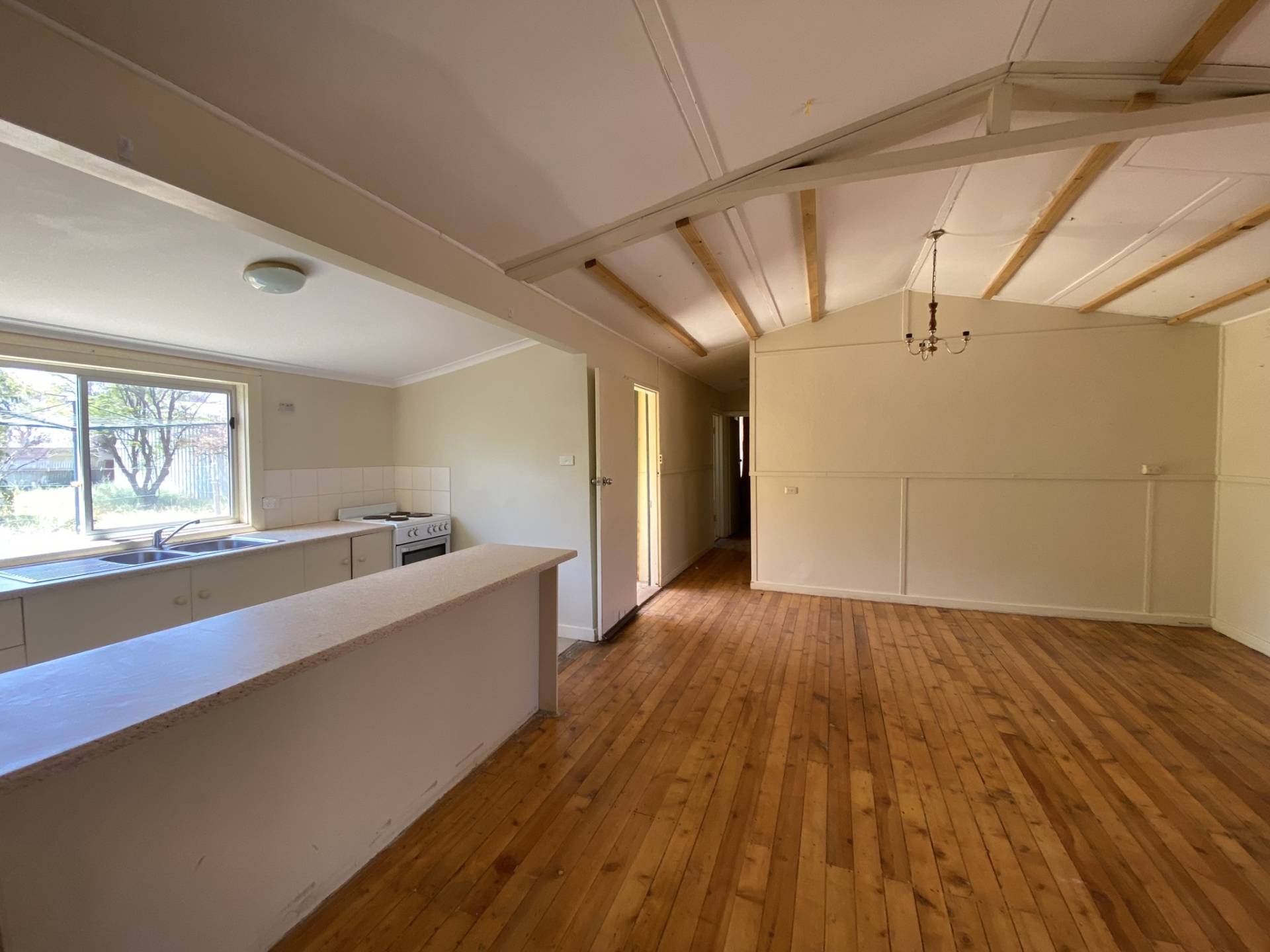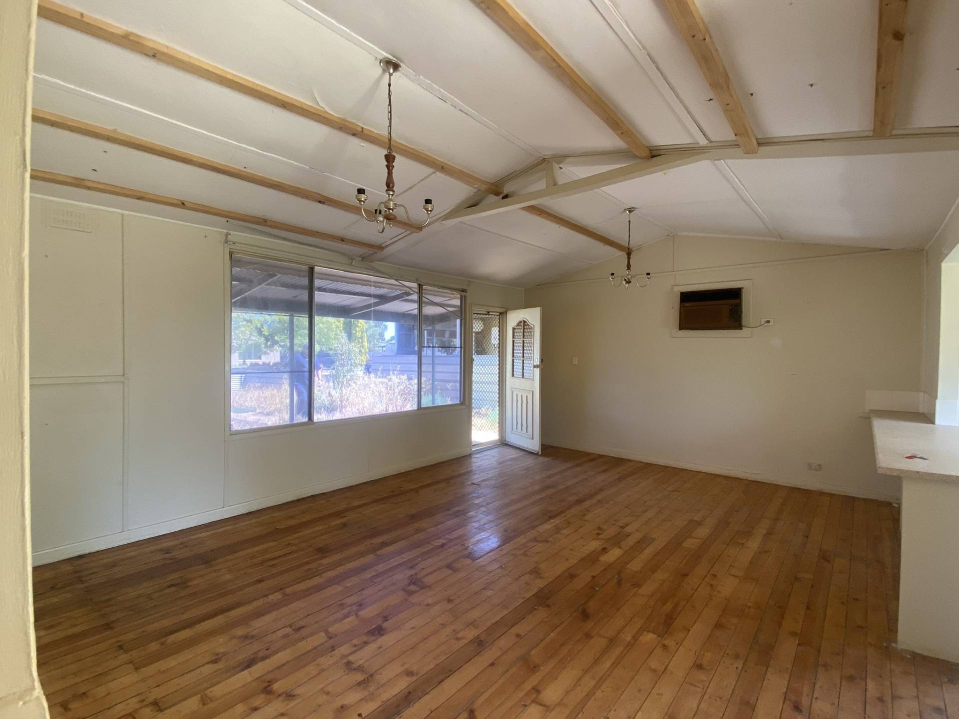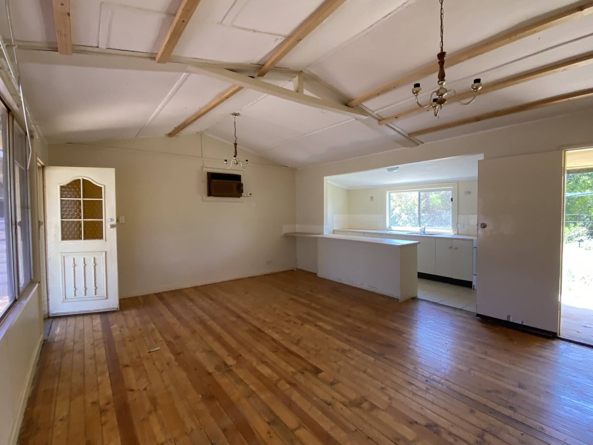 The home features a kitchen with ample cupboard space, seamlessly overlooking the spacious open-plan dining and living area, complete with an original wall air conditioner for year-round comfort.