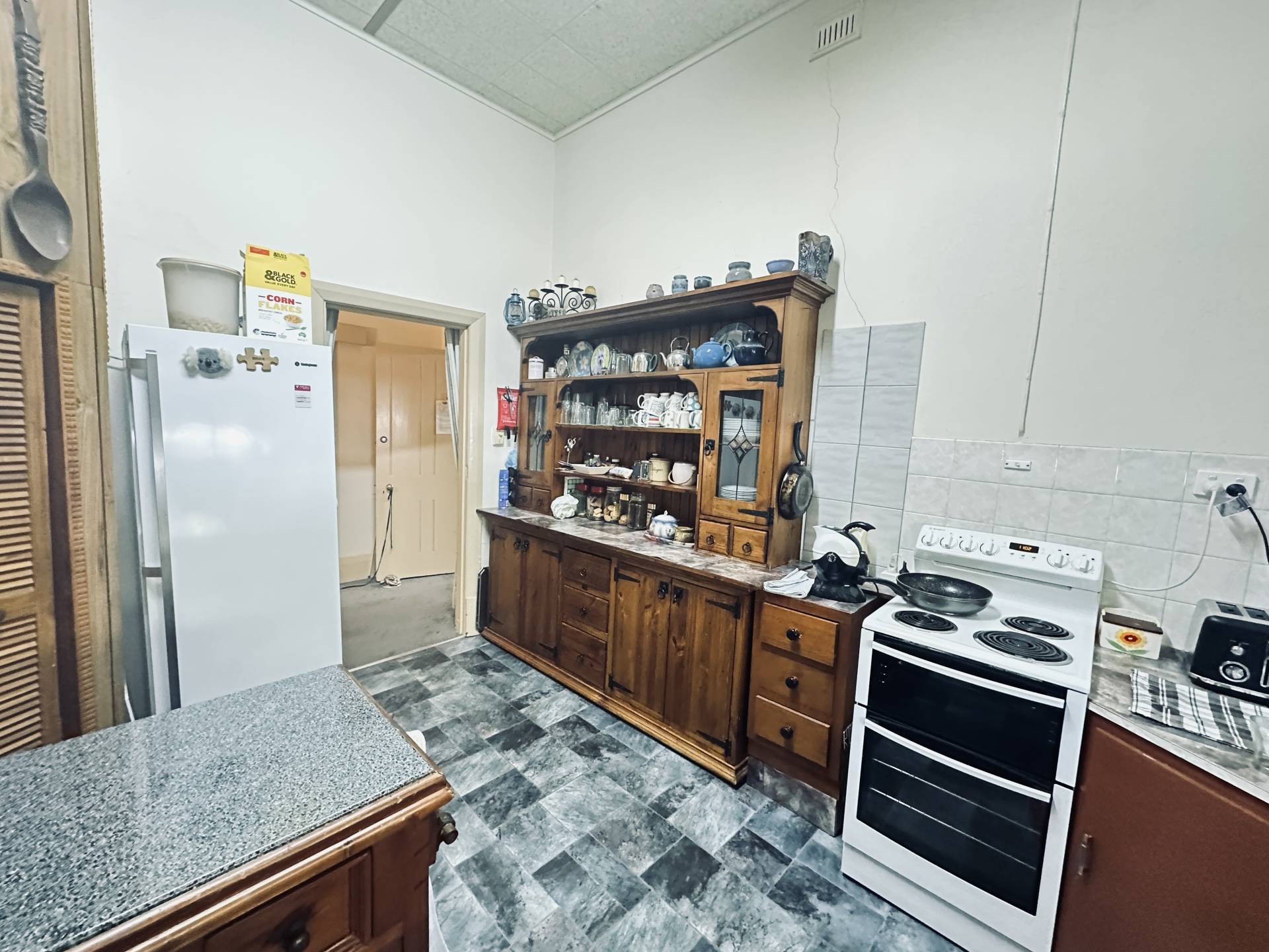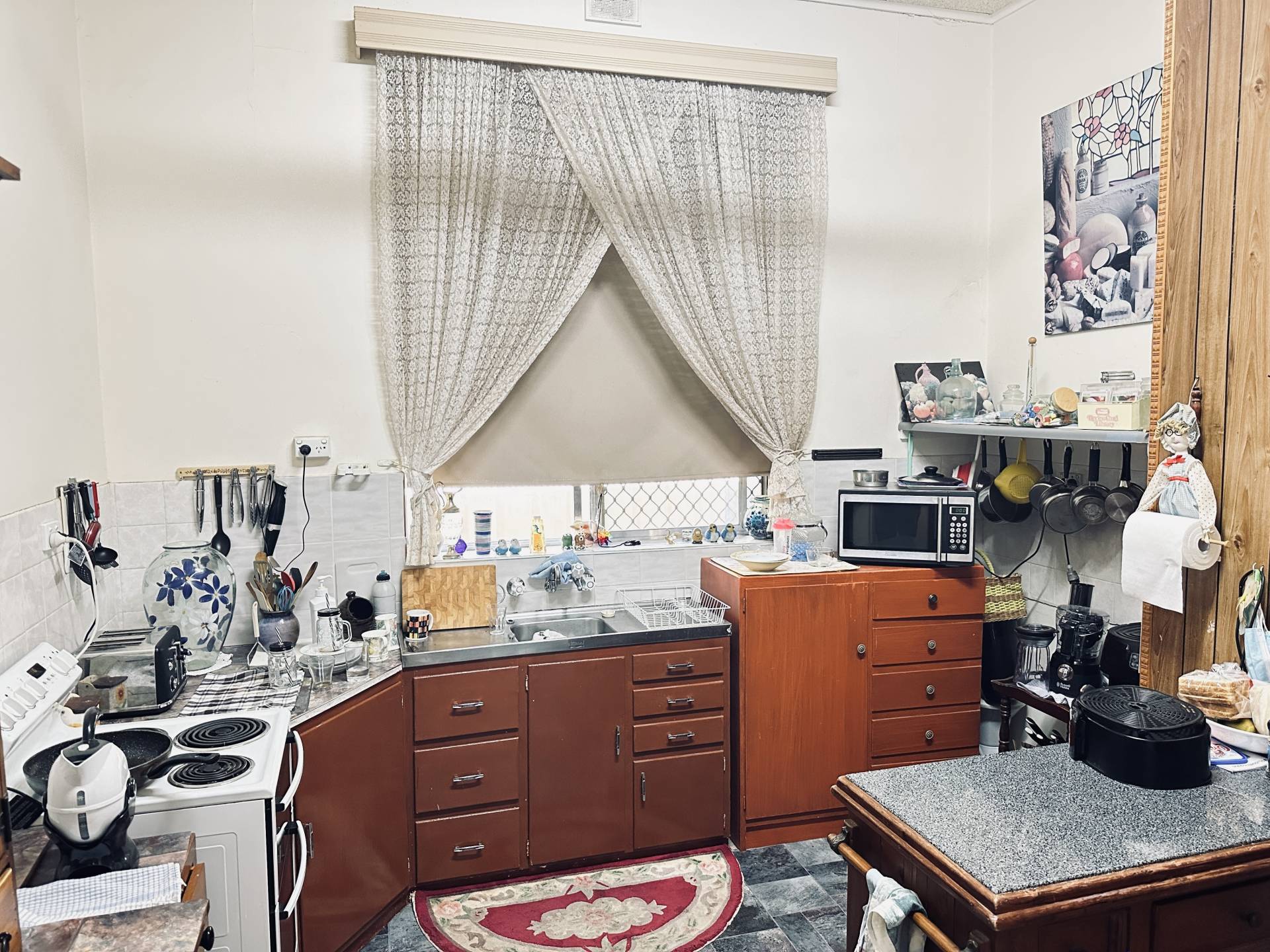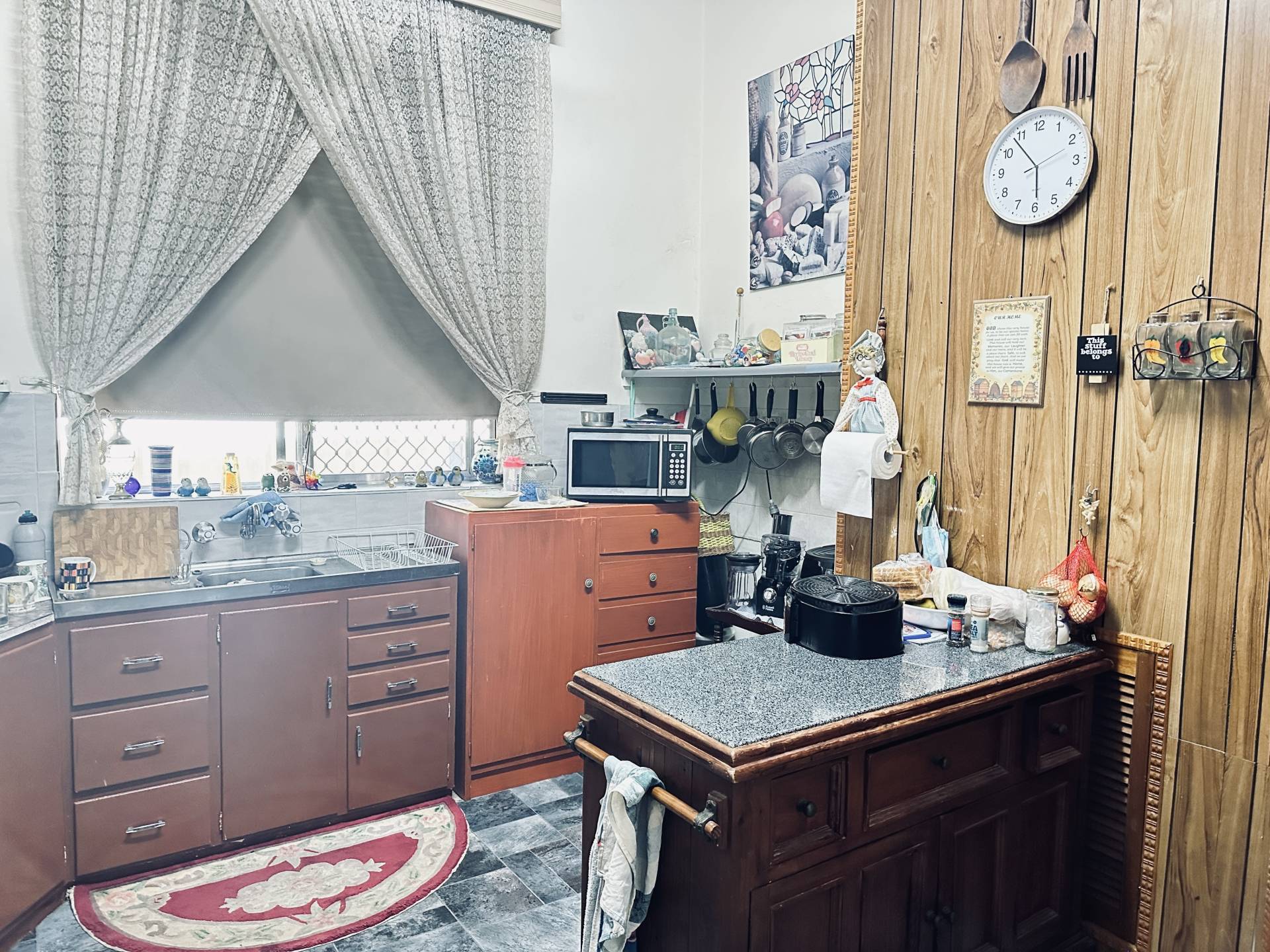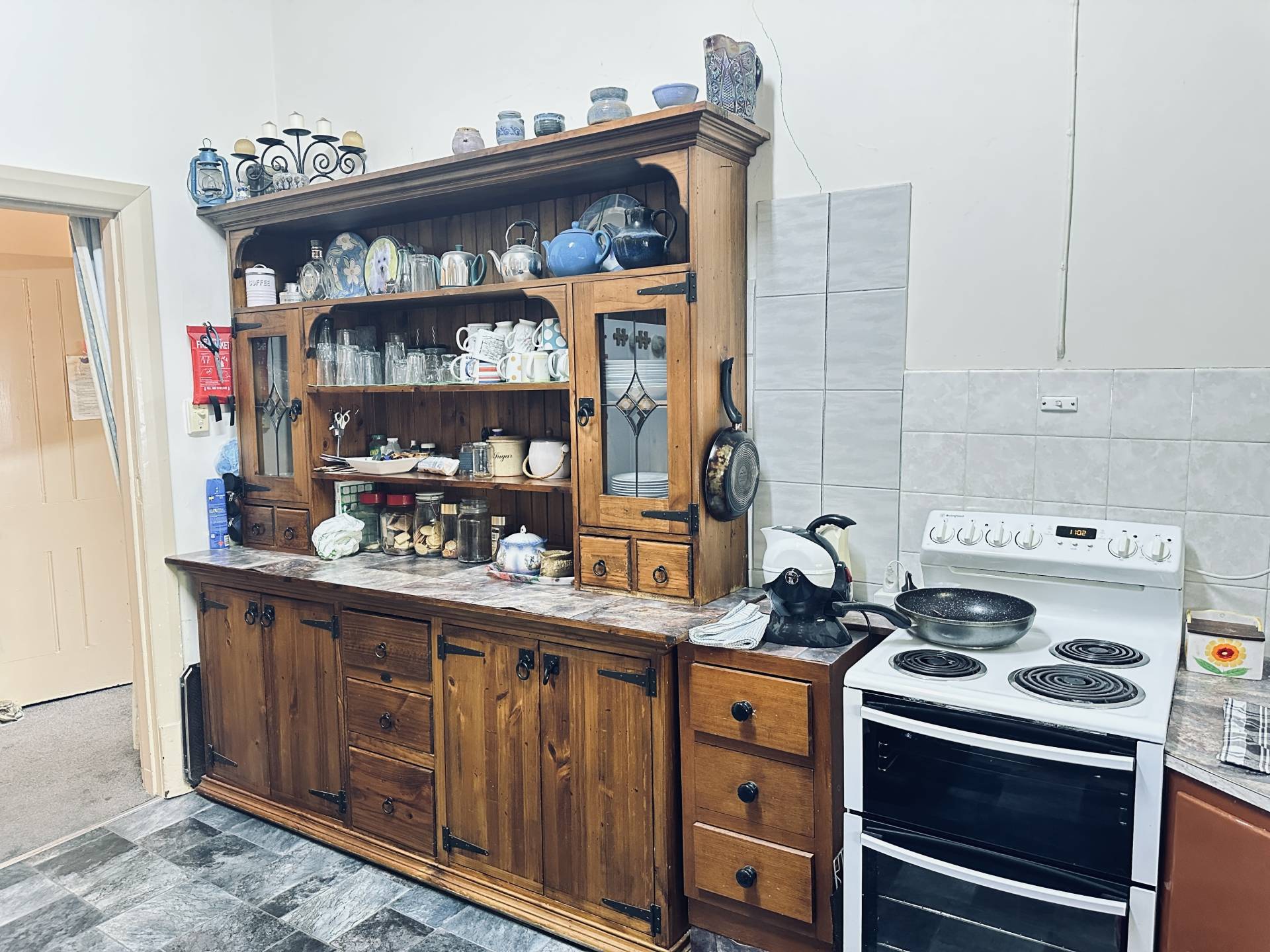 Functional kitchen with pantry, timber cupboards, island bench and electric stove.