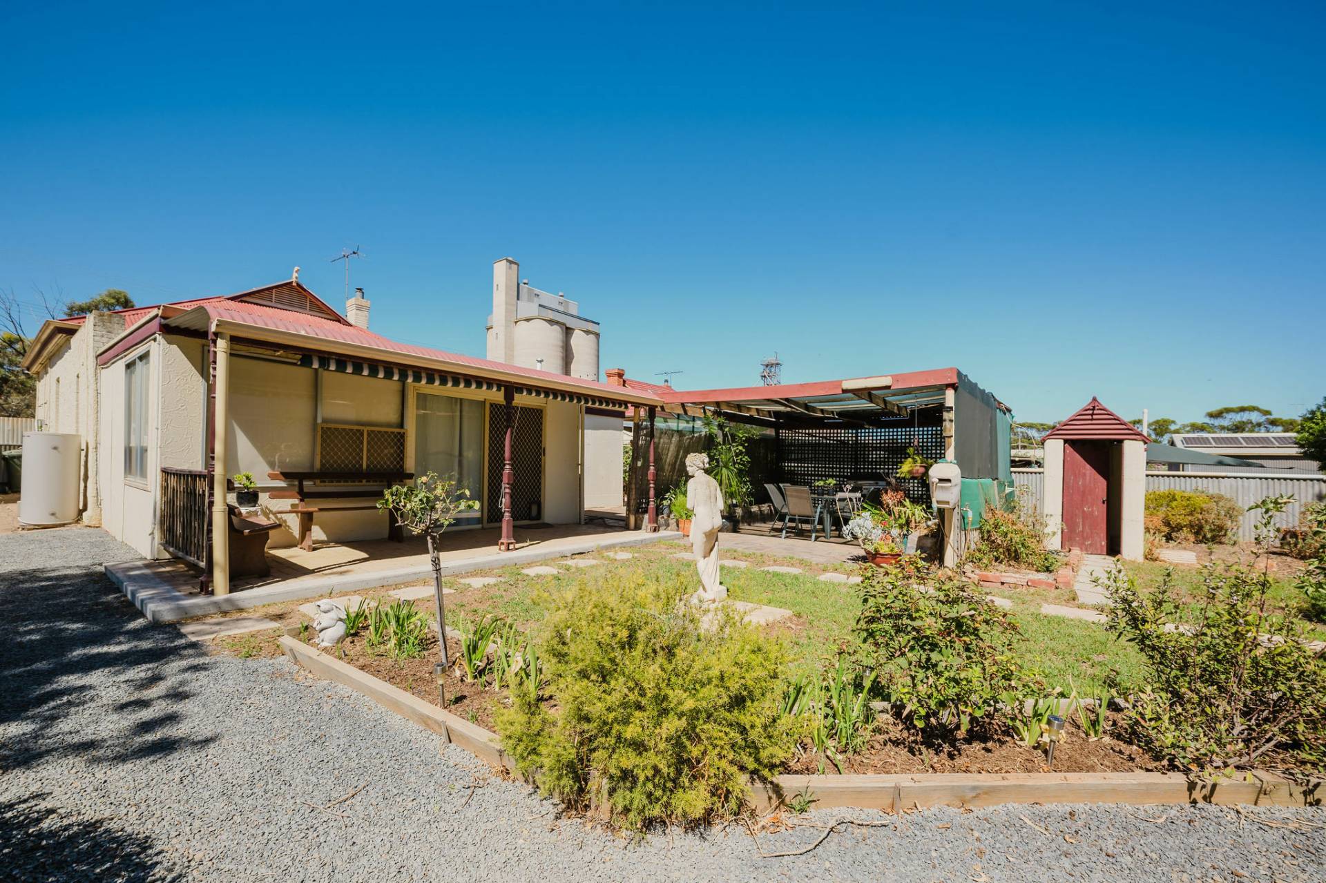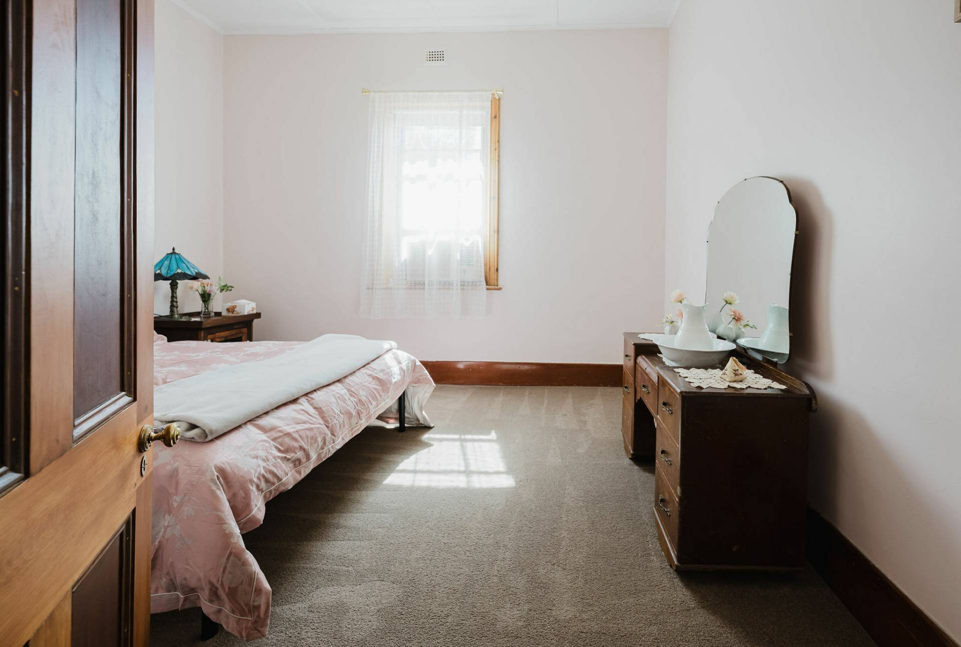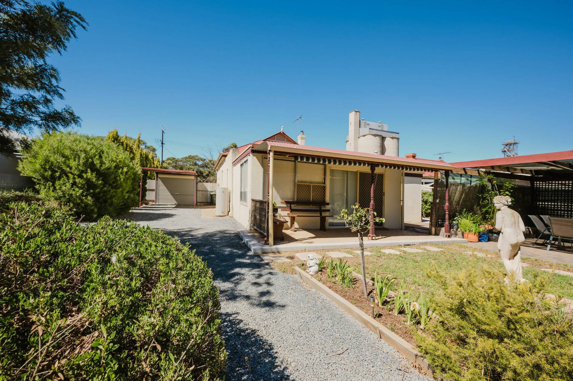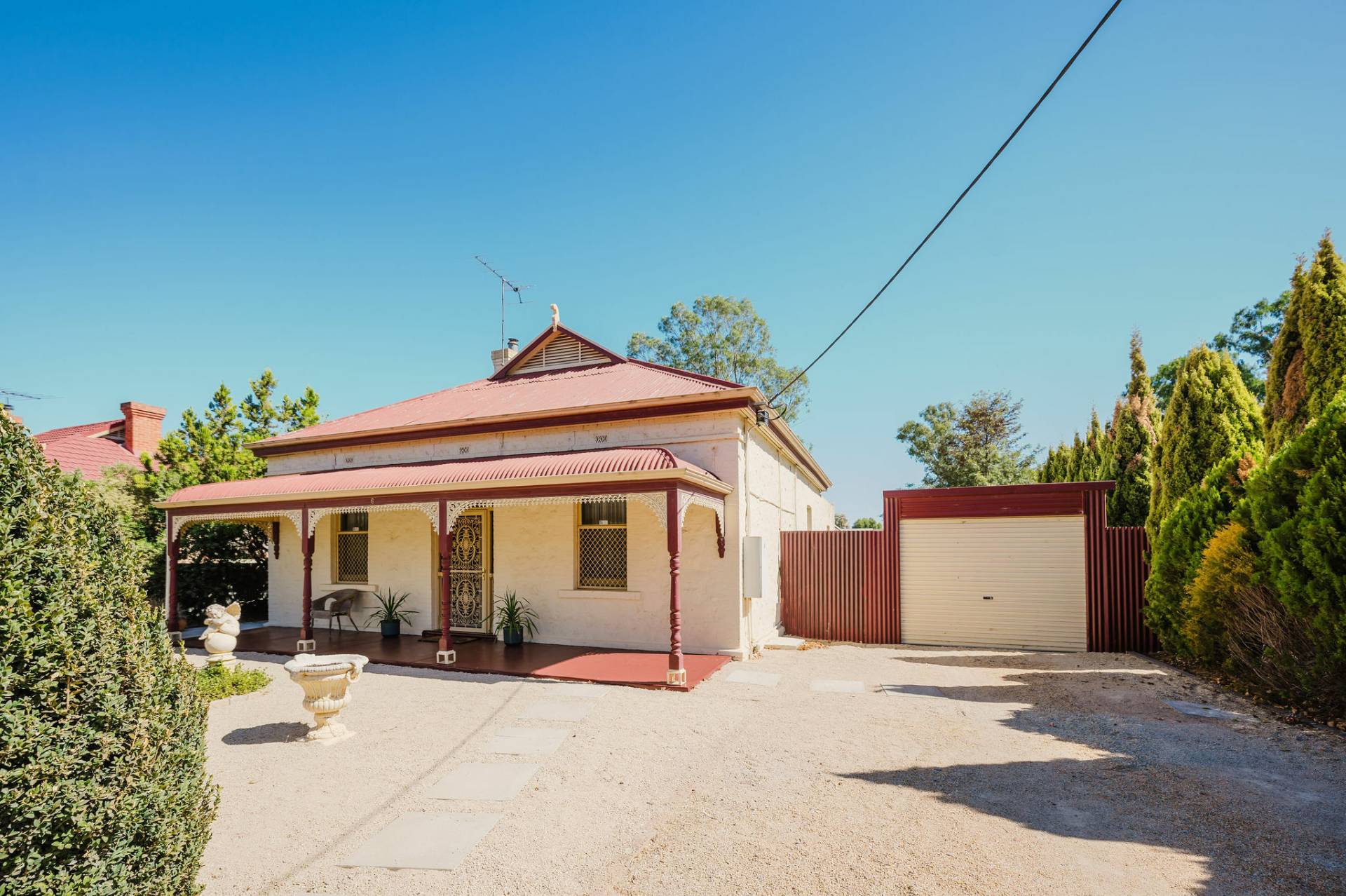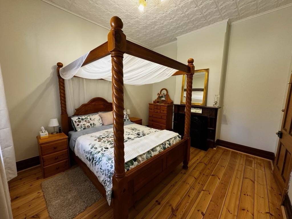 The home is an appealing Freestone symmetrical cottage built in 1898 with an iron roof and bullnose verandah and lacework. The entrance has beautiful lead light windows and a wide passage. The front two bedrooms are large with high pressed tin ceilings and open fireplaces. The third bedroom is a good size with carpeted flooring. The spacious lounge room has an open fireplace and ornate ceiling roses. The large kitchen consists of timber cupboards, gas stove and single sink. The bathroom also has leadlight windows, a tiled floor and timber vanity, shower, claw foot bath and toilet. A large laundry is located to the rear of the home as is the family room with split system air conditioning. Sliding doors lead to the enclosed rear yard and outside you will find well established gardens, an original single stable garden shed, 30' x 20' shed with power and concrete floor, a single carport with automatic roller door and an outside toilet. As a bonus, the home is serviced by a 5kW solar system.