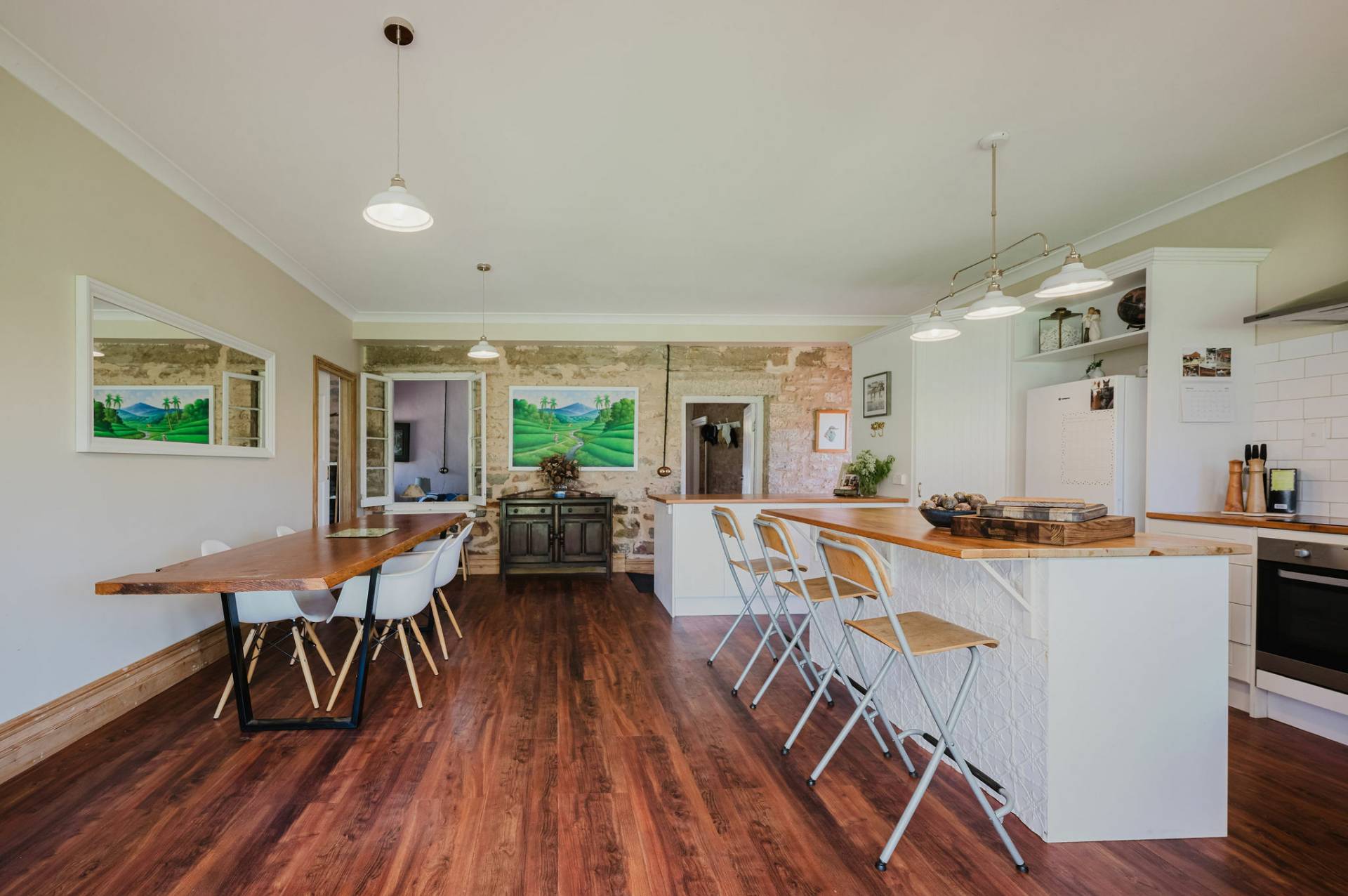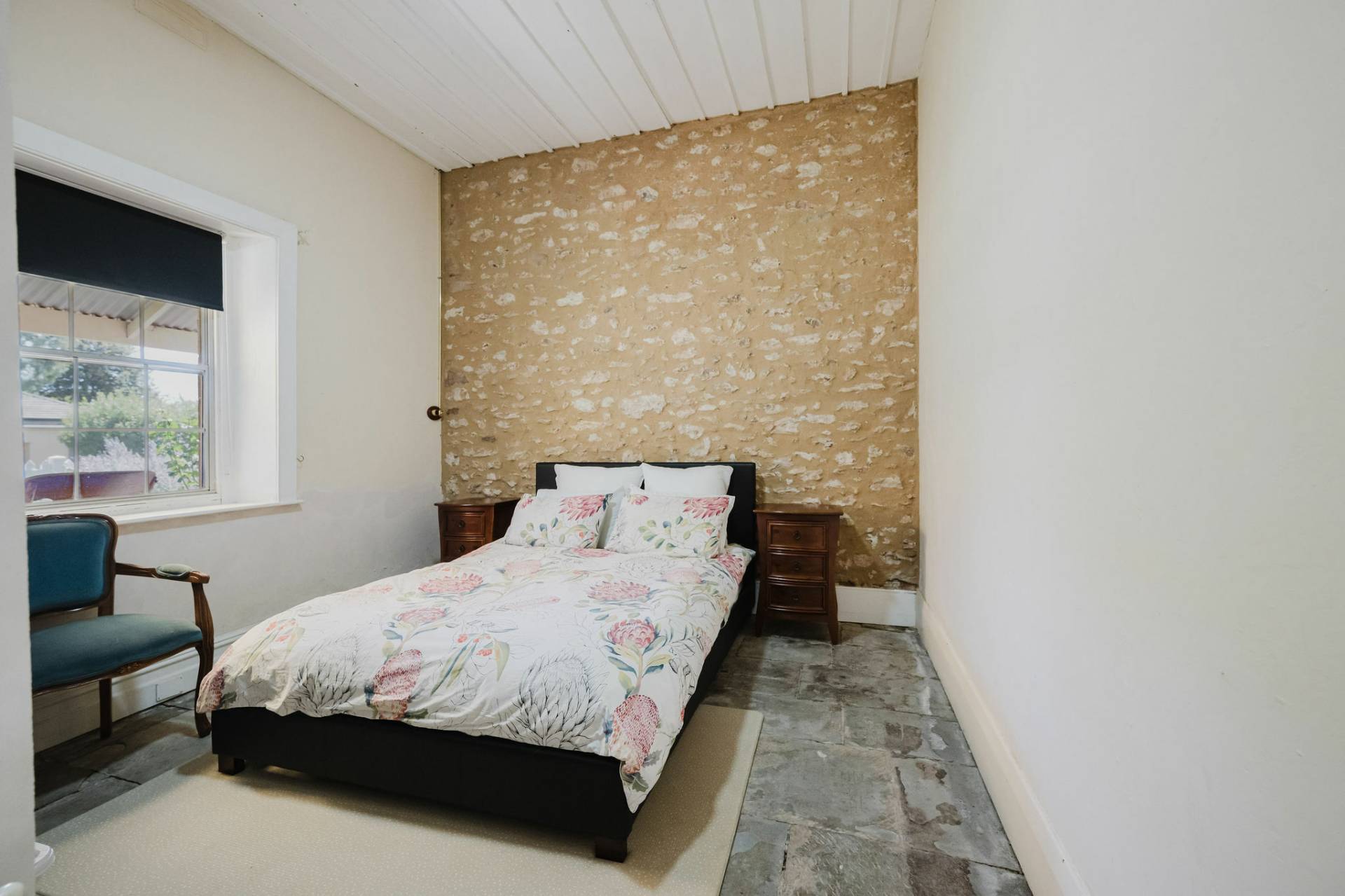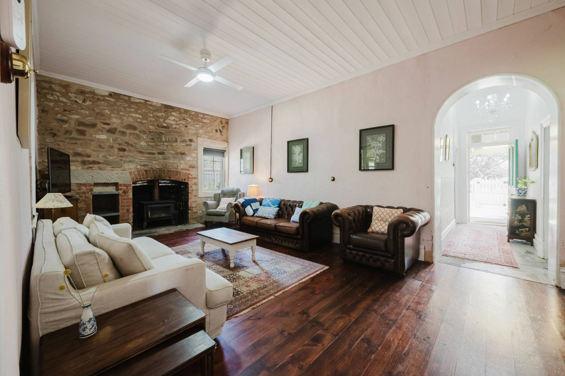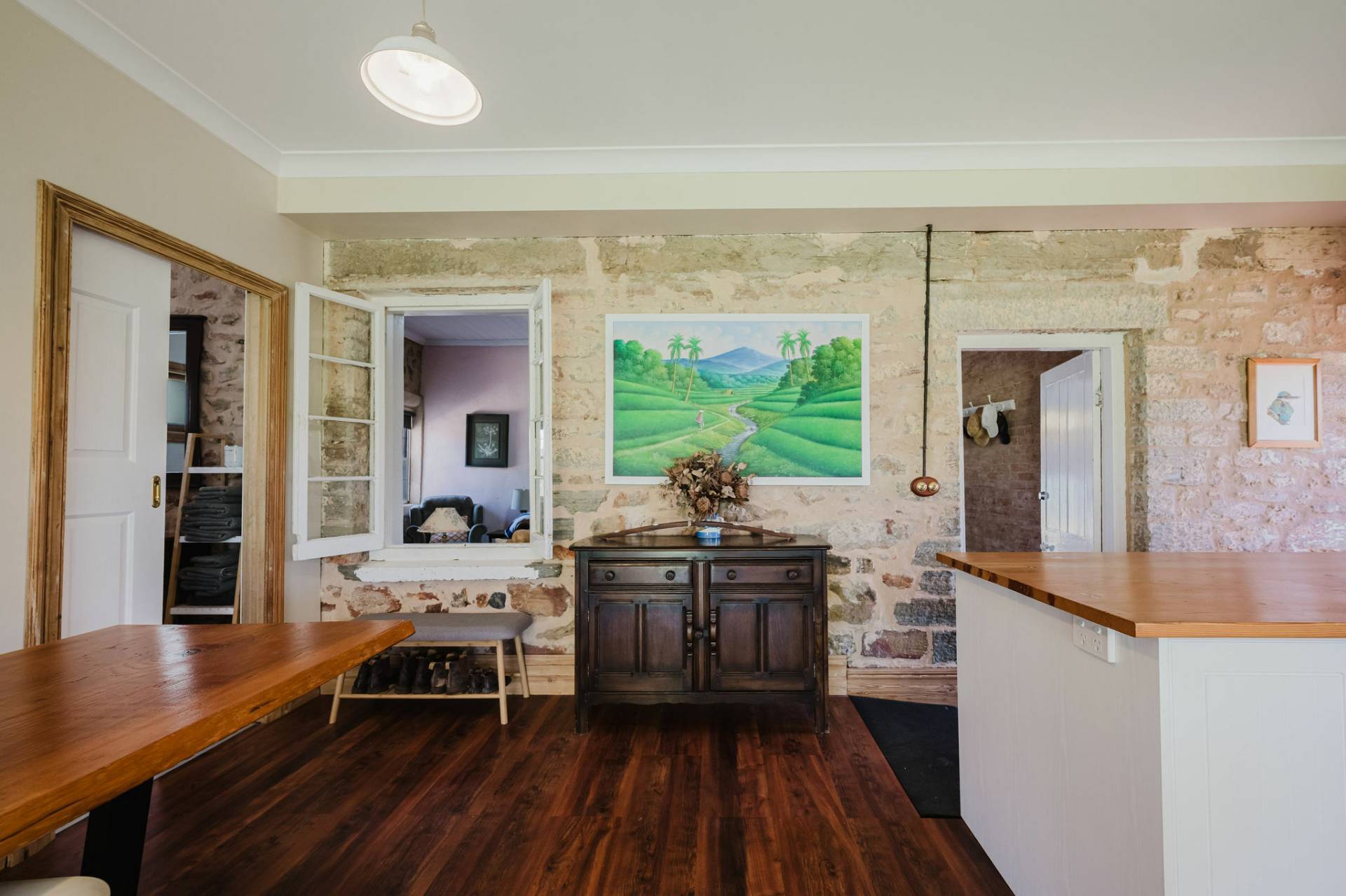 Three spacious bedrooms with exposed features stone walls and original timber flooring, creating a rustic and cozy atmosphere.  The lounge room complete with combustion heater with a unique cellar to store Clare classical wines.  The kitchen and dining area exude a country style charm with white glossy cupboards, timber bench tops that highlight the home’s character. Central island bench, timber and double-glazed windows and doors that lead out to the entertaining deck.  The family bathroom features a claw-footed bath, shower, and timber top vanity.  Practical laundry and second toilet.  The fixtures & fittings highlights the cottage’s authentic appeal.