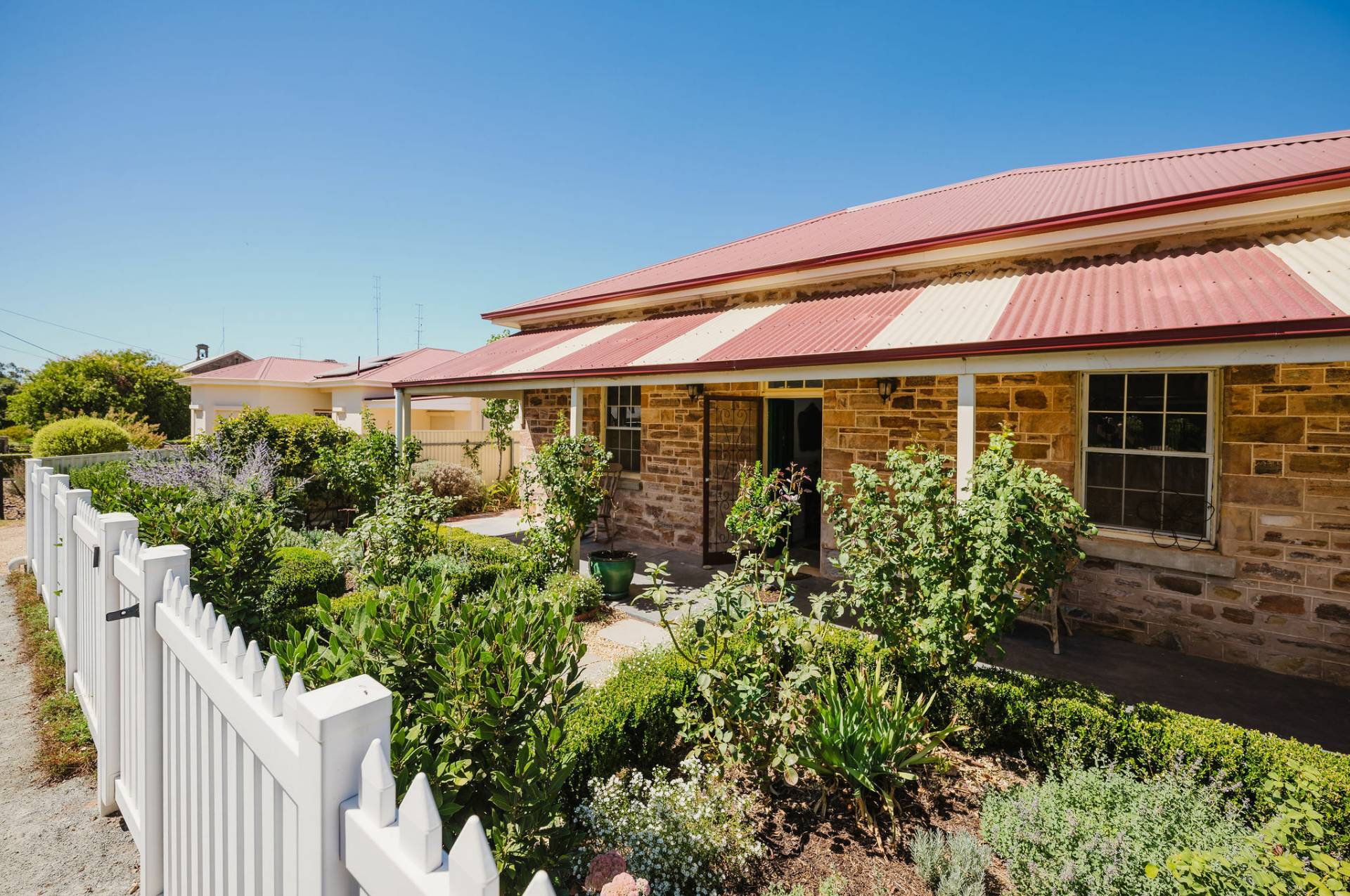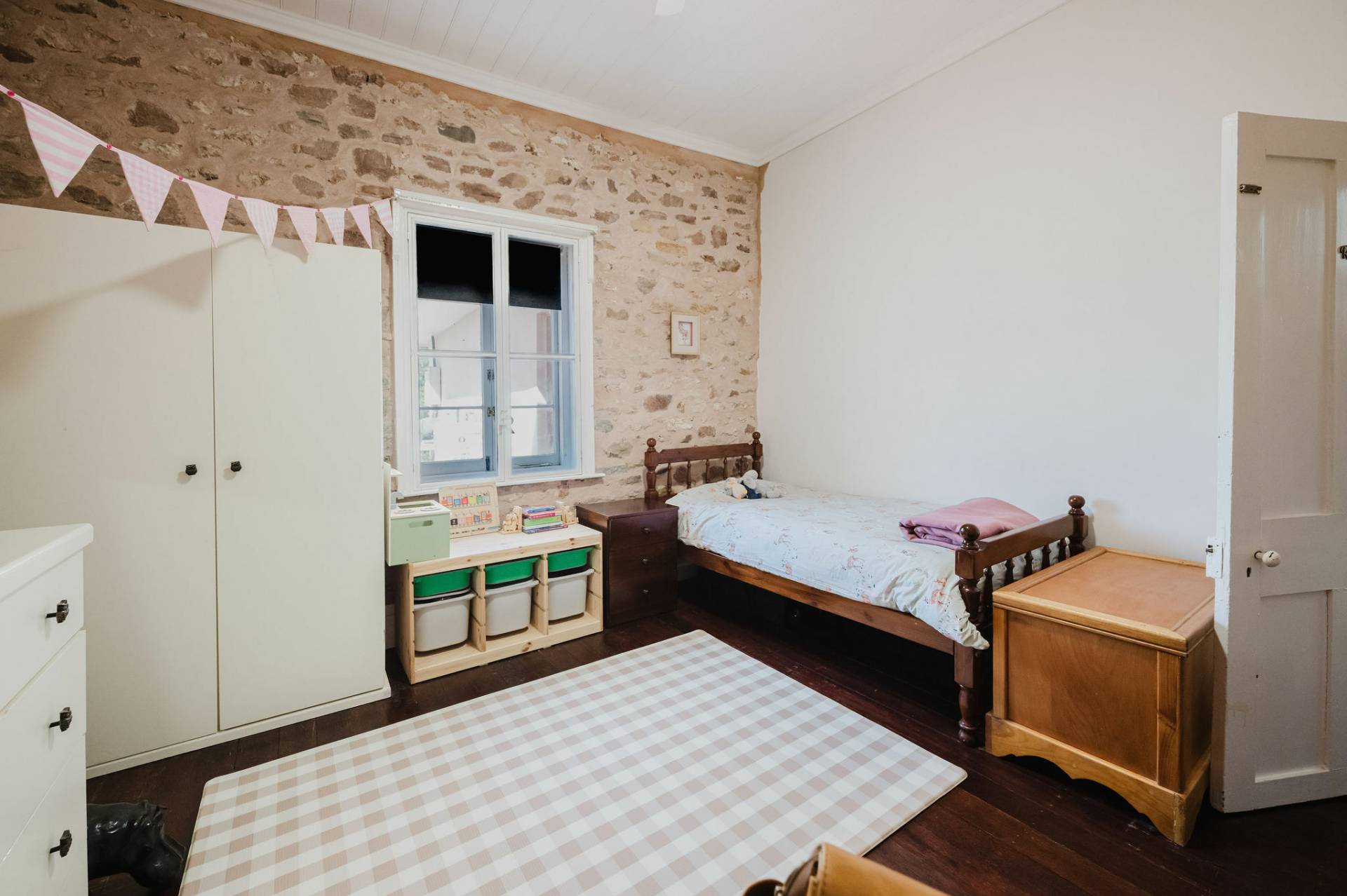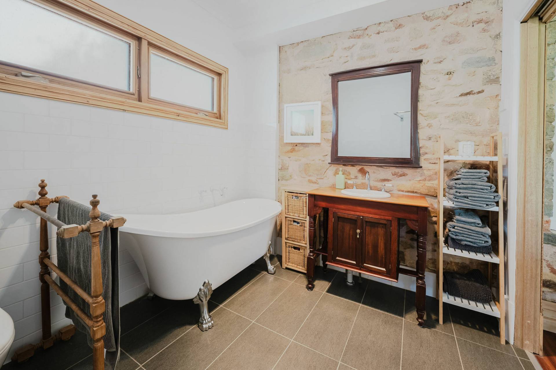 Three spacious bedrooms with exposed features stone walls and original timber flooring, creating a rustic and cozy atmosphere.  The lounge room complete with combustion heater with a unique cellar to store Clare classical wines.  The kitchen and dining area exude a country style charm with white glossy cupboards, timber bench tops that highlight the home’s character. Central island bench, timber and double-glazed windows and doors that lead out to the entertaining deck.  The family bathroom features a claw-footed bath, shower, and timber top vanity.  Practical laundry and second toilet.  The fixtures & fittings highlights the cottage’s authentic appeal.