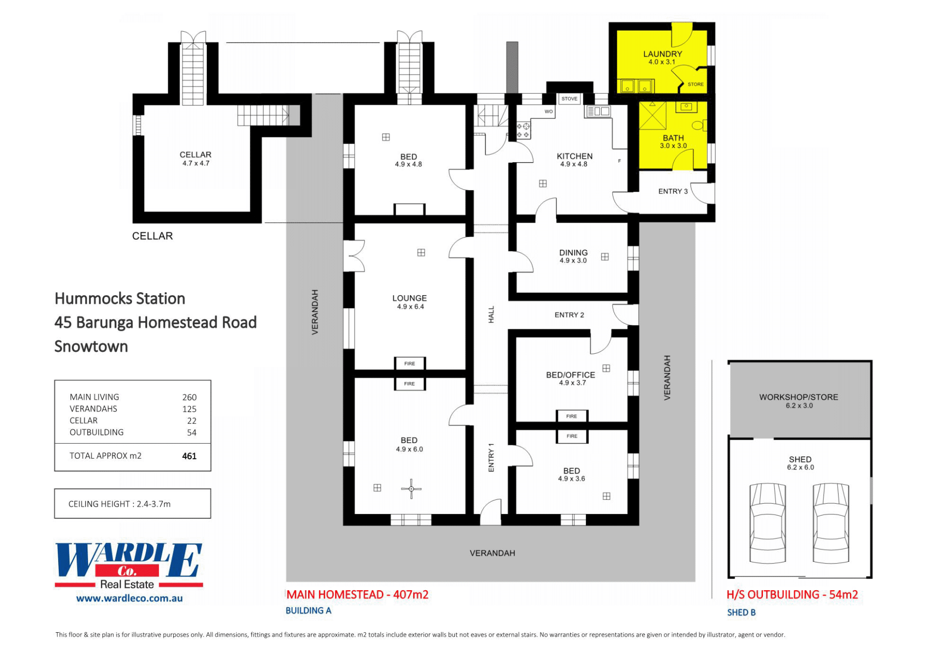 • Upgraded 15.5 x 8m* shed with concrete floor, power, storage area, commercial laundry, lined and vermin proof 4.5 x 8m* storage area