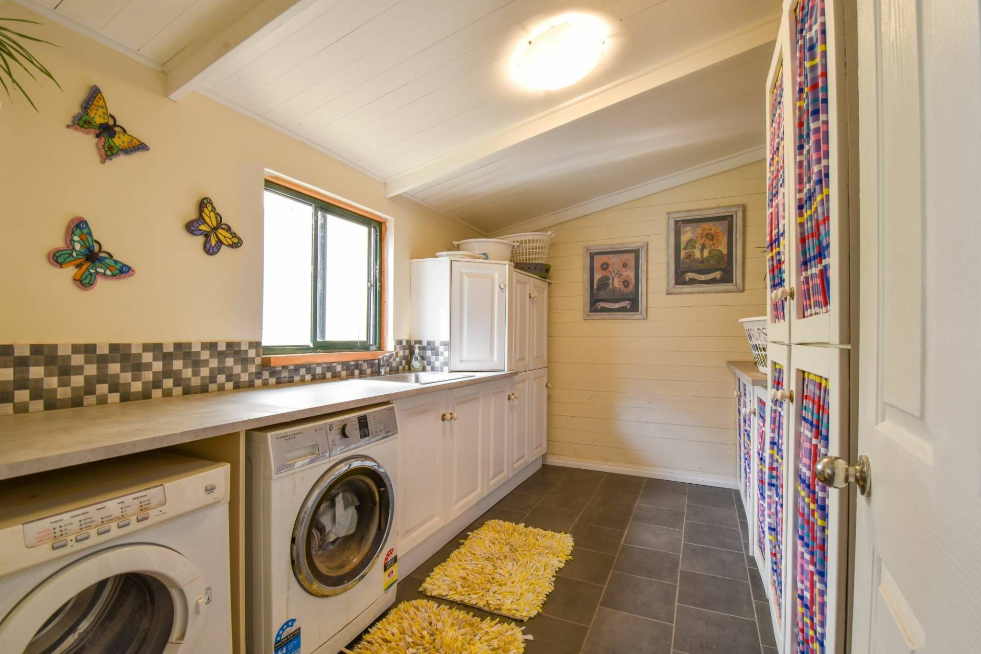 The laundry has a tiled floor with new cabinetry and ample bench space.