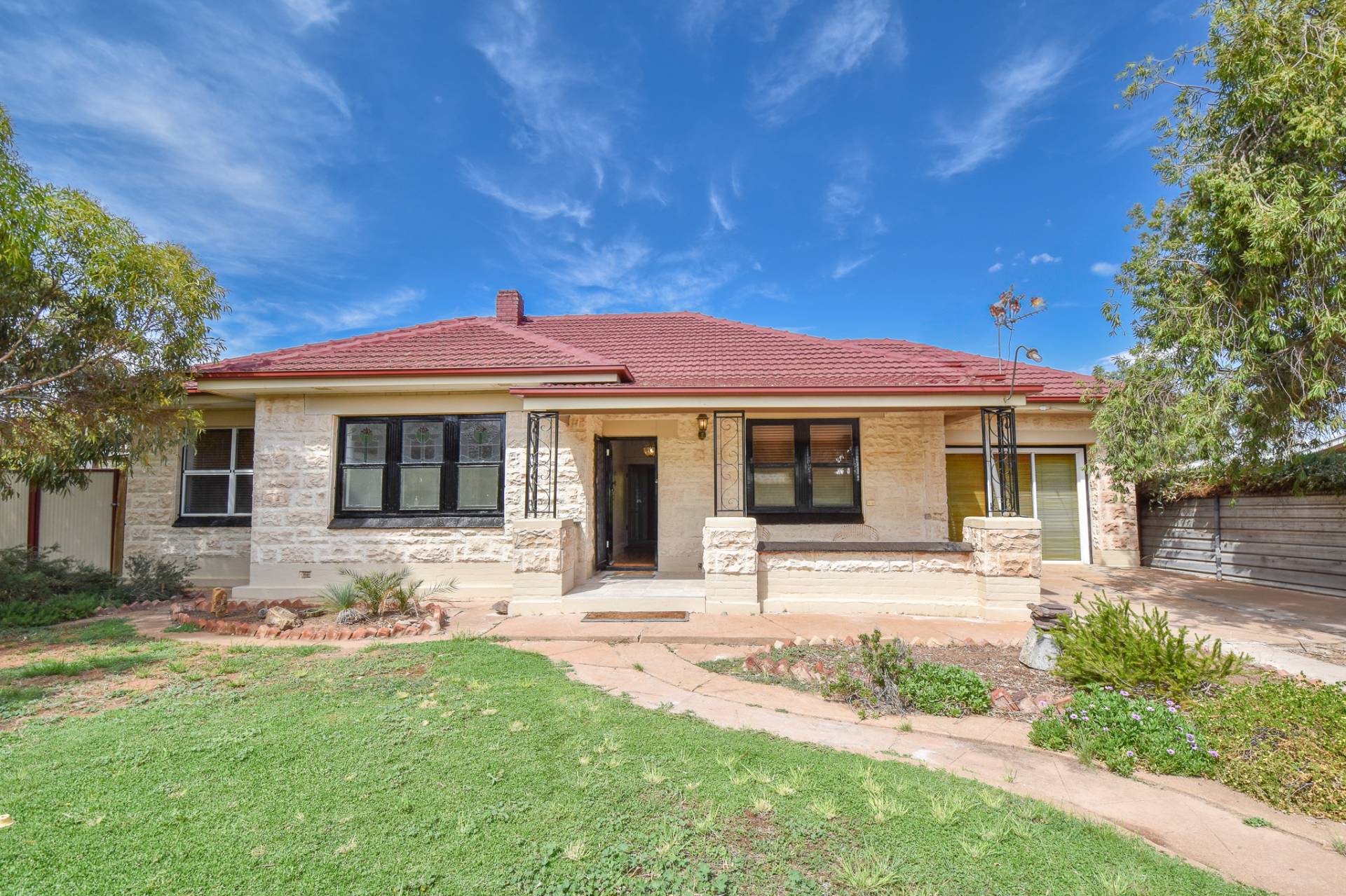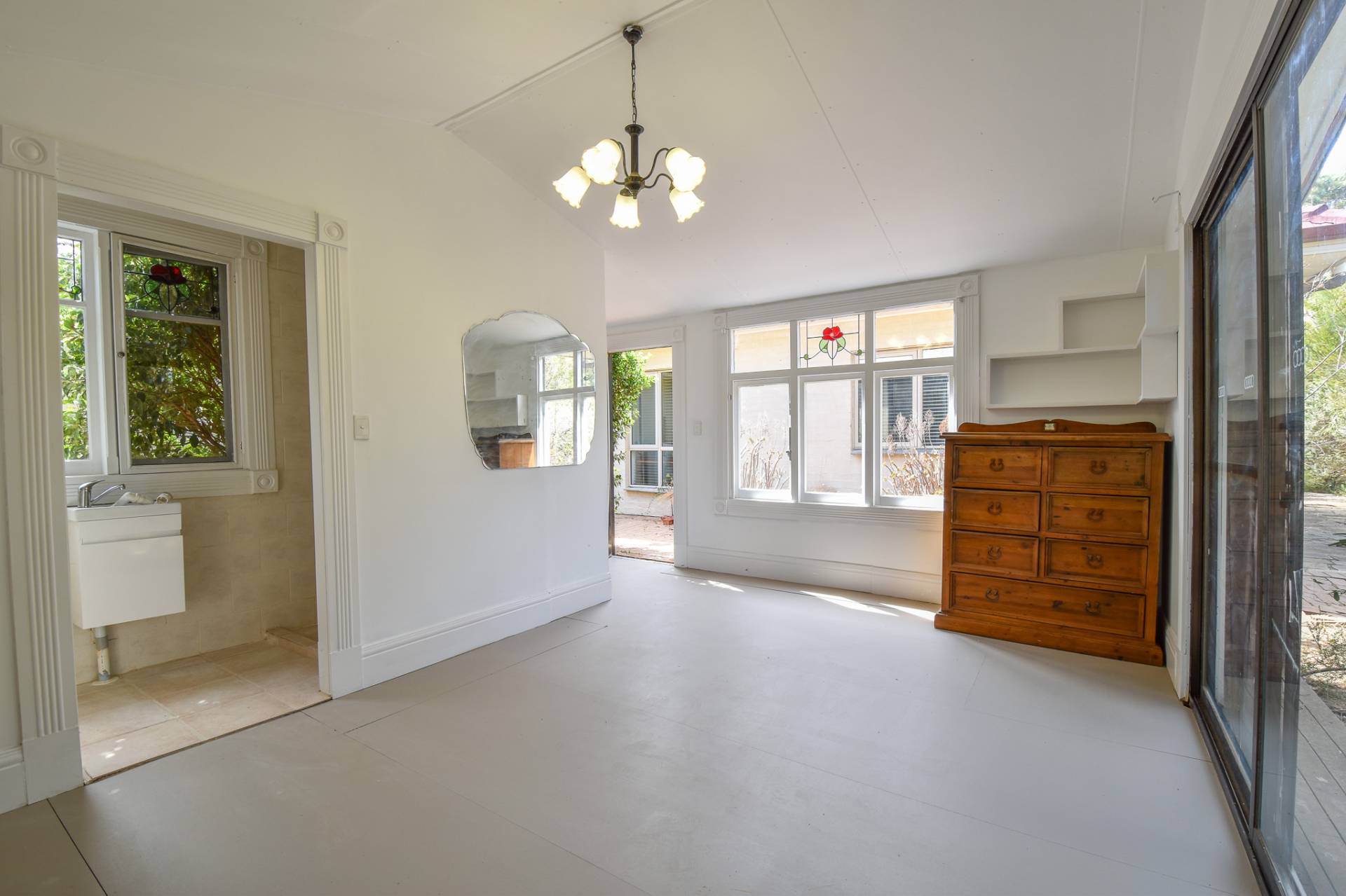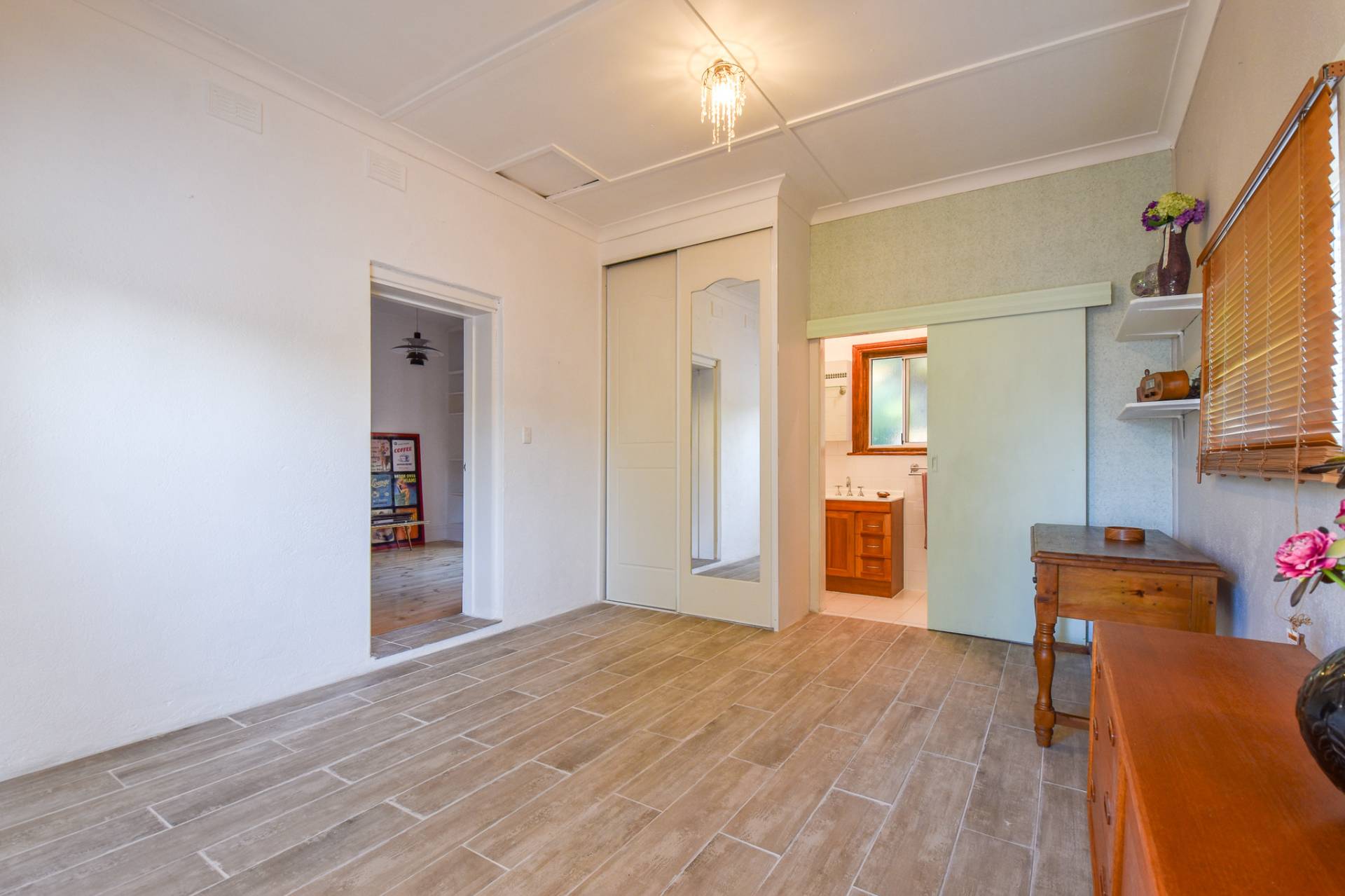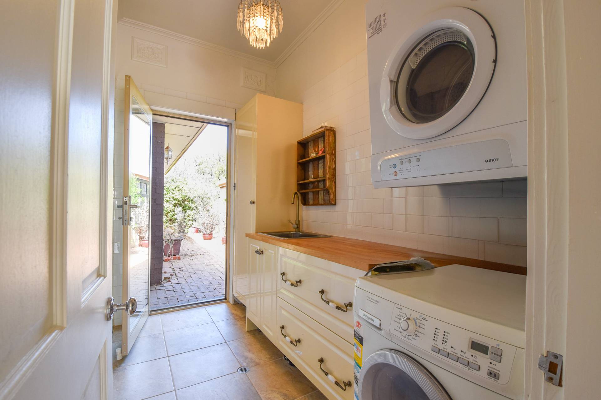 The main bathroom is centrally located with floor-to-ceiling tiles, a single basin vanity, mirrored shaving cabinet, shower, toilet, and charming claw foot tub. A functional laundry with built-in storage, a stainless steel wash trough, and rear access completes the interior.