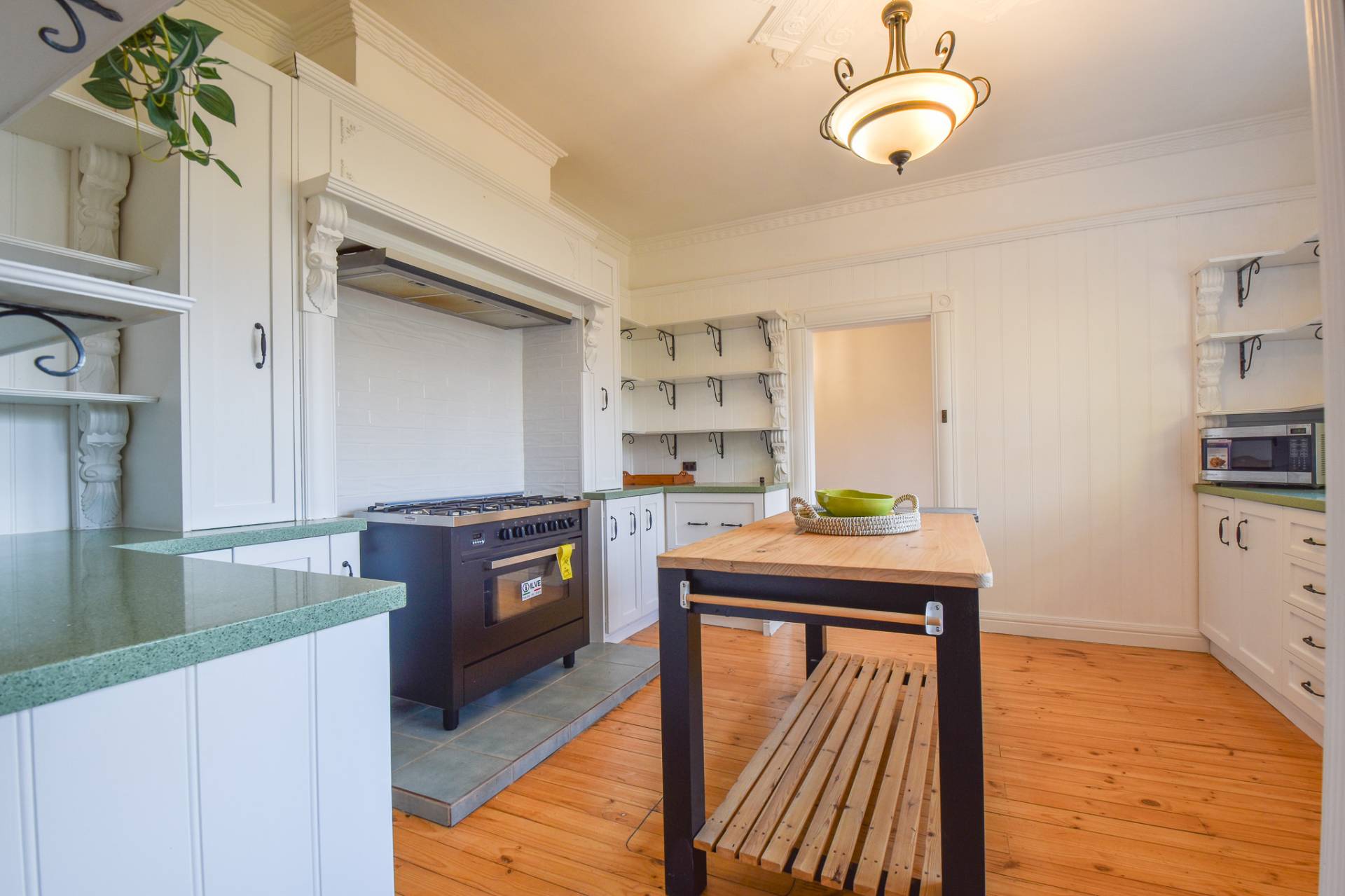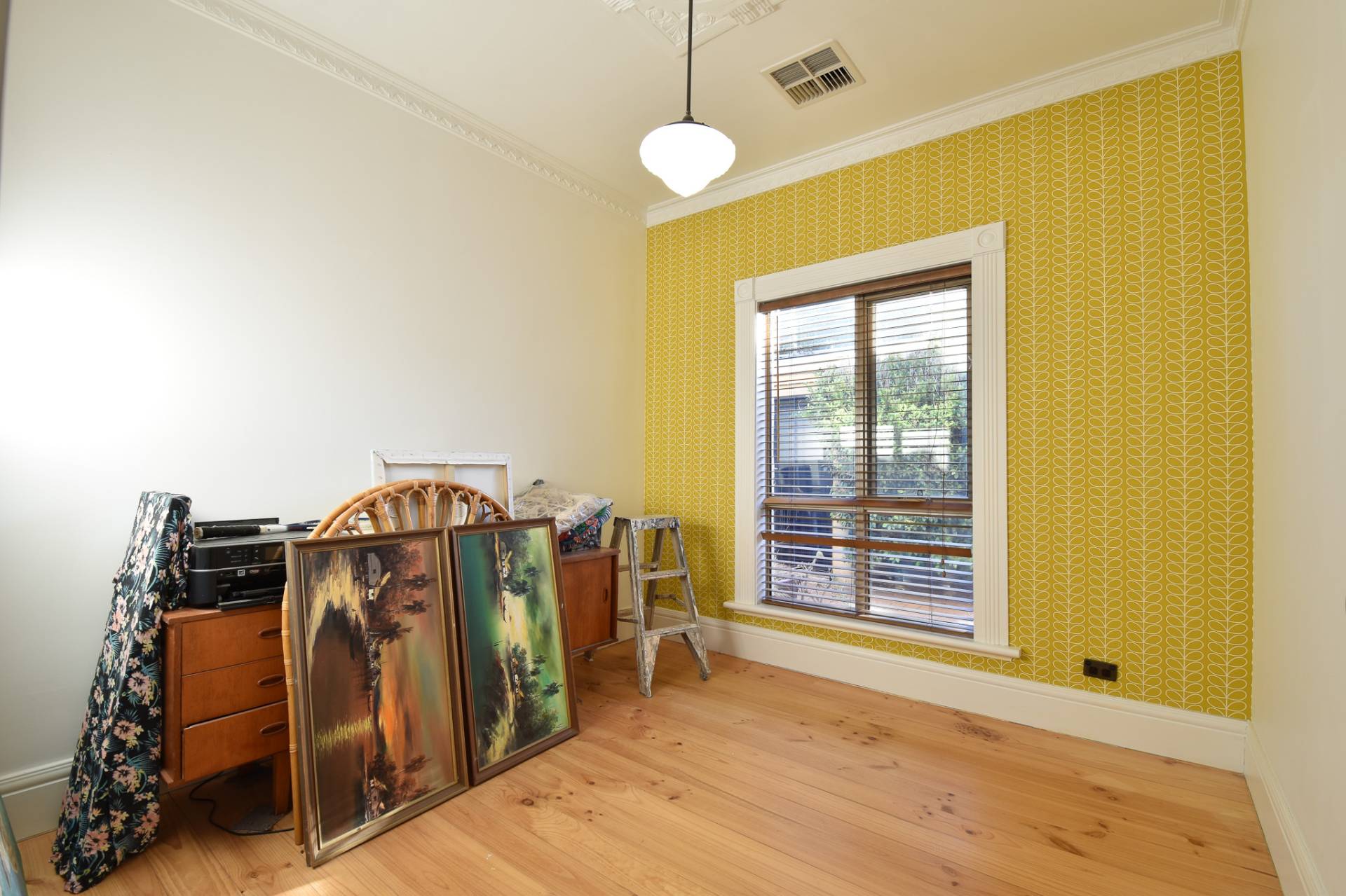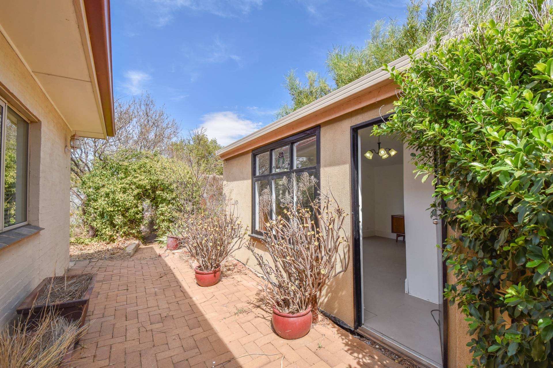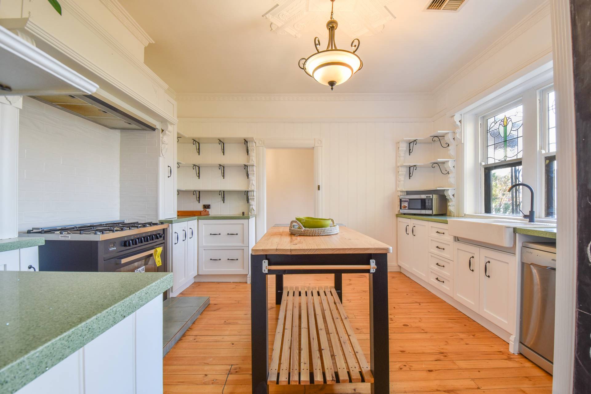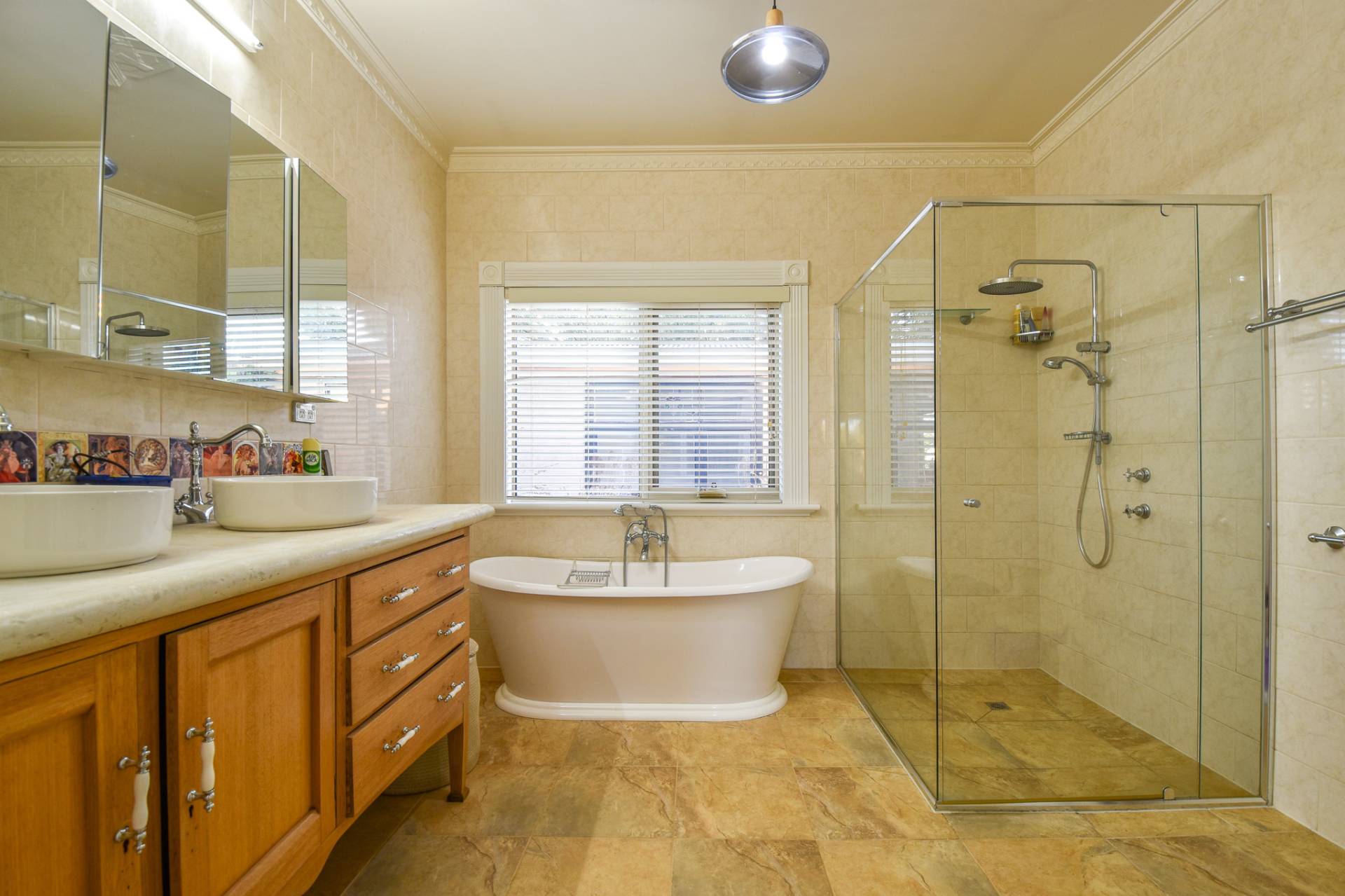 The main bathroom is centrally located with floor-to-ceiling tiles, a single basin vanity, mirrored shaving cabinet, shower, toilet, and charming claw foot tub. A functional laundry with built-in storage, a stainless steel wash trough, and rear access completes the interior.