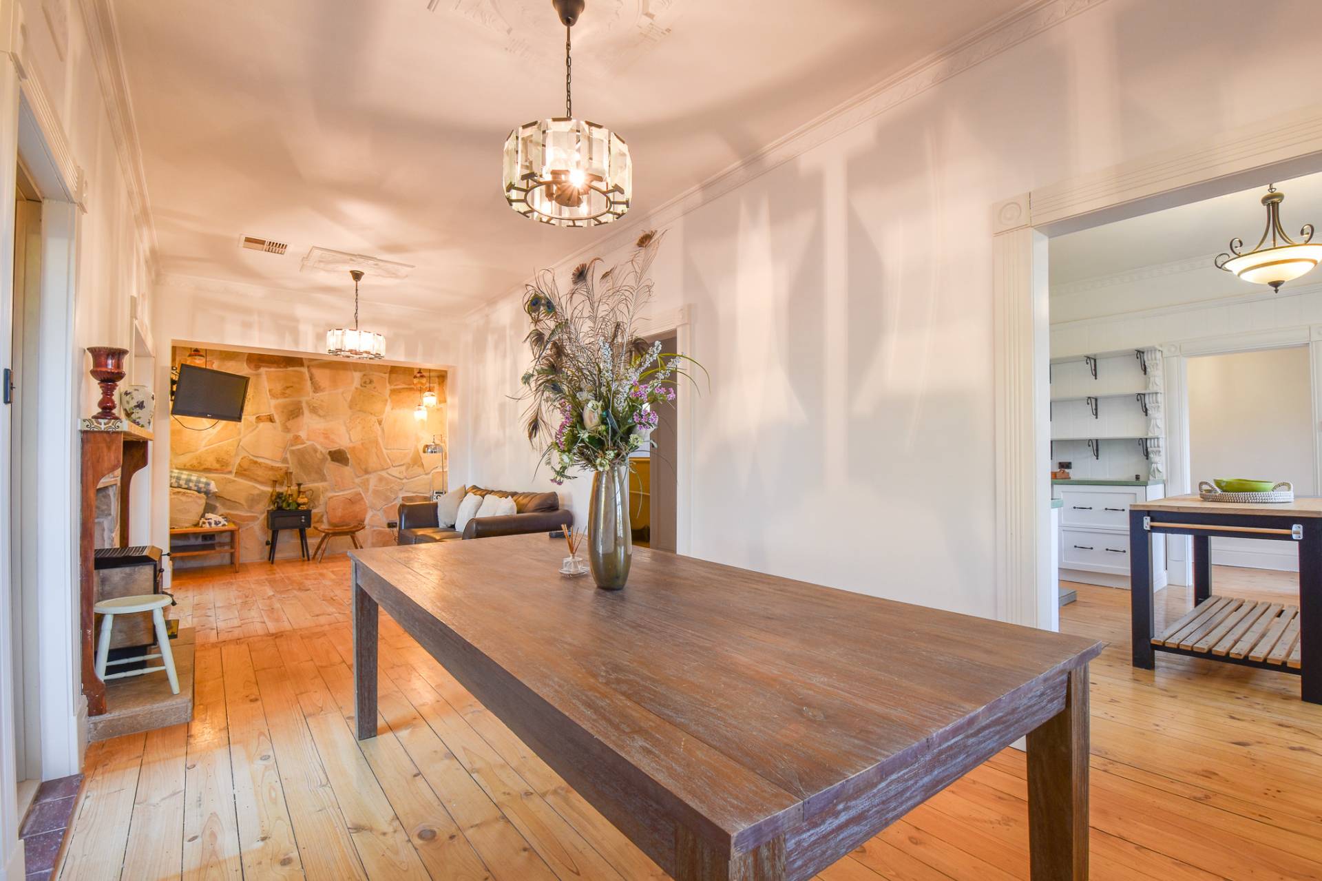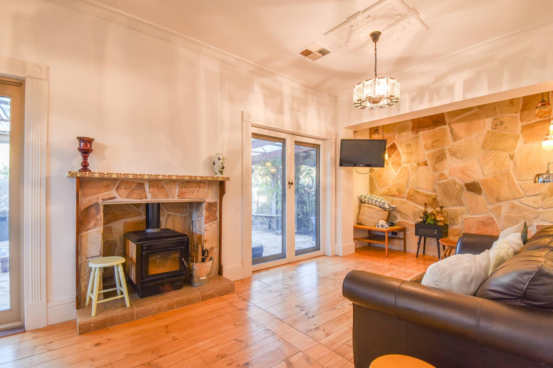 A second living area provides further retreat, showcasing another stunning sandstone feature wall, a slow combustion wood fire, and a large bookcase – perfect for relaxation and unwinding.