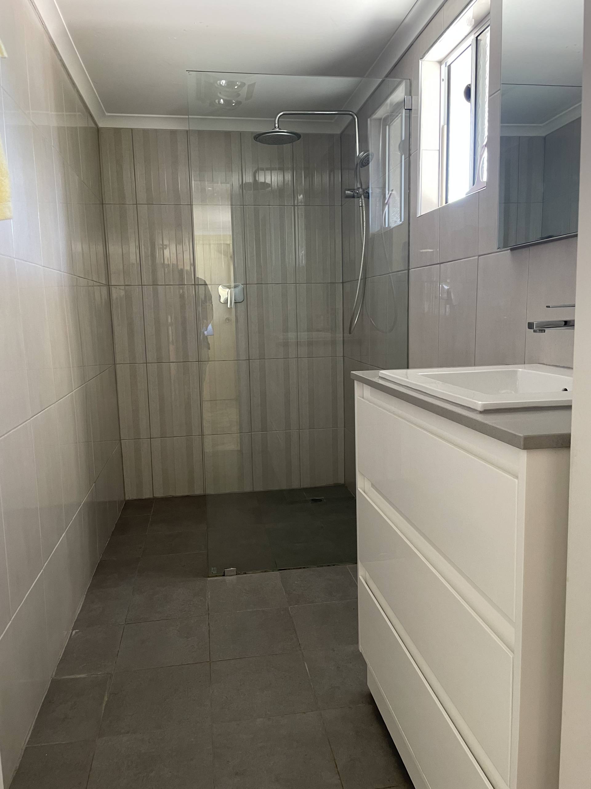 • Modern bathroom with glass alcove and stylish vanity plus floor to ceiling tiles