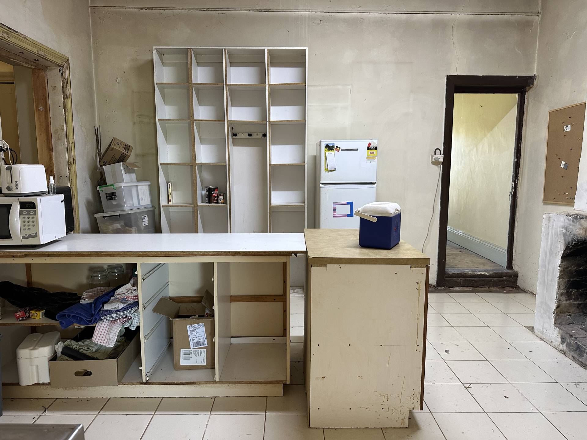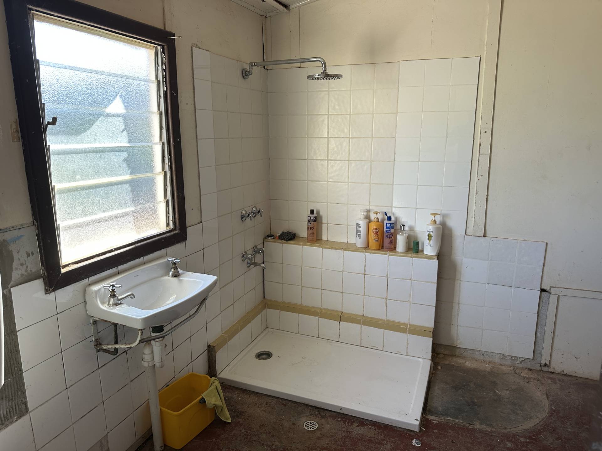 The kitchen space has a tiled floor, single sink and cupboards, the bathroom and laundry space have concrete floors with a tiled shower area, including toilet, hand basin and a stainless steel wash trough.