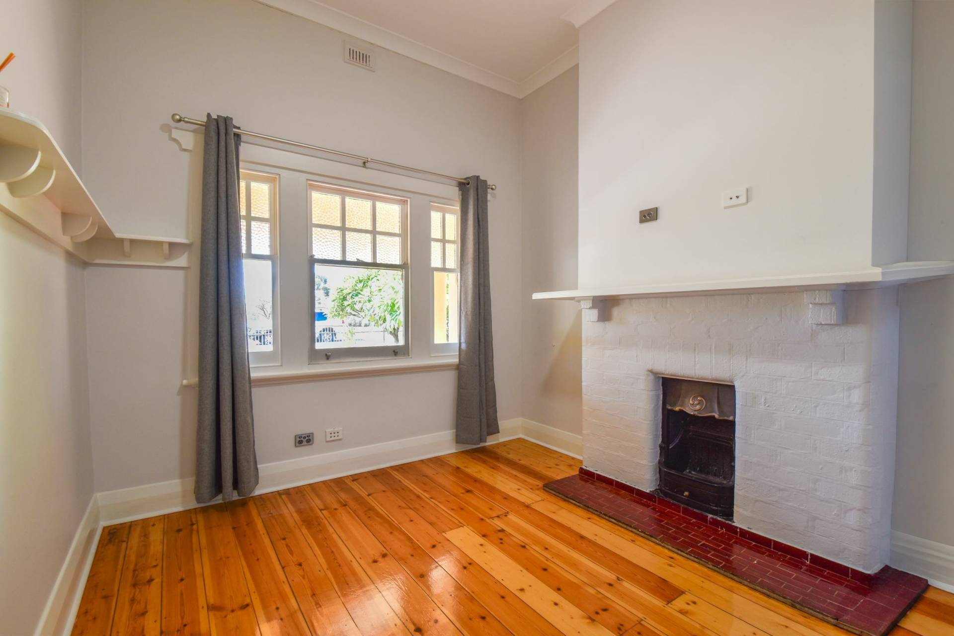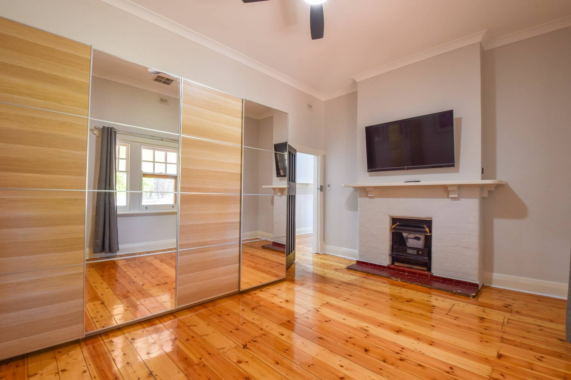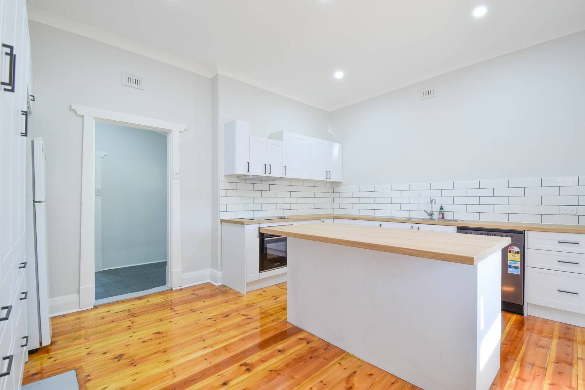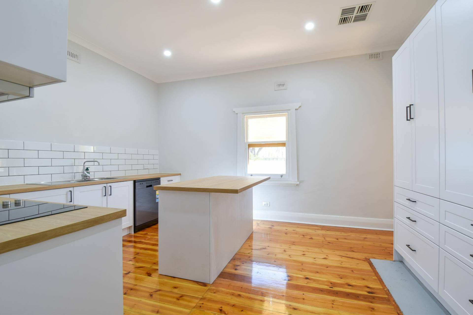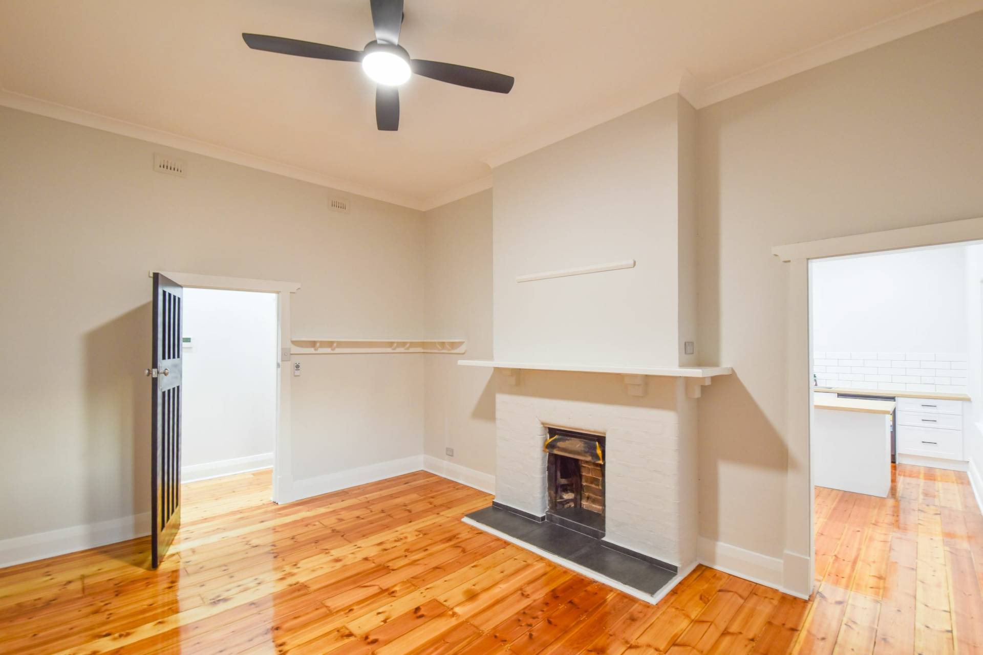 The living room, complete with a ceiling fan and open fireplace, seamlessly transitions into the large, updated kitchen. Featuring timeless shaker profile doors, an island bench, dishwasher, stainless steel oven, electric cooktop, and stainless steel sink.