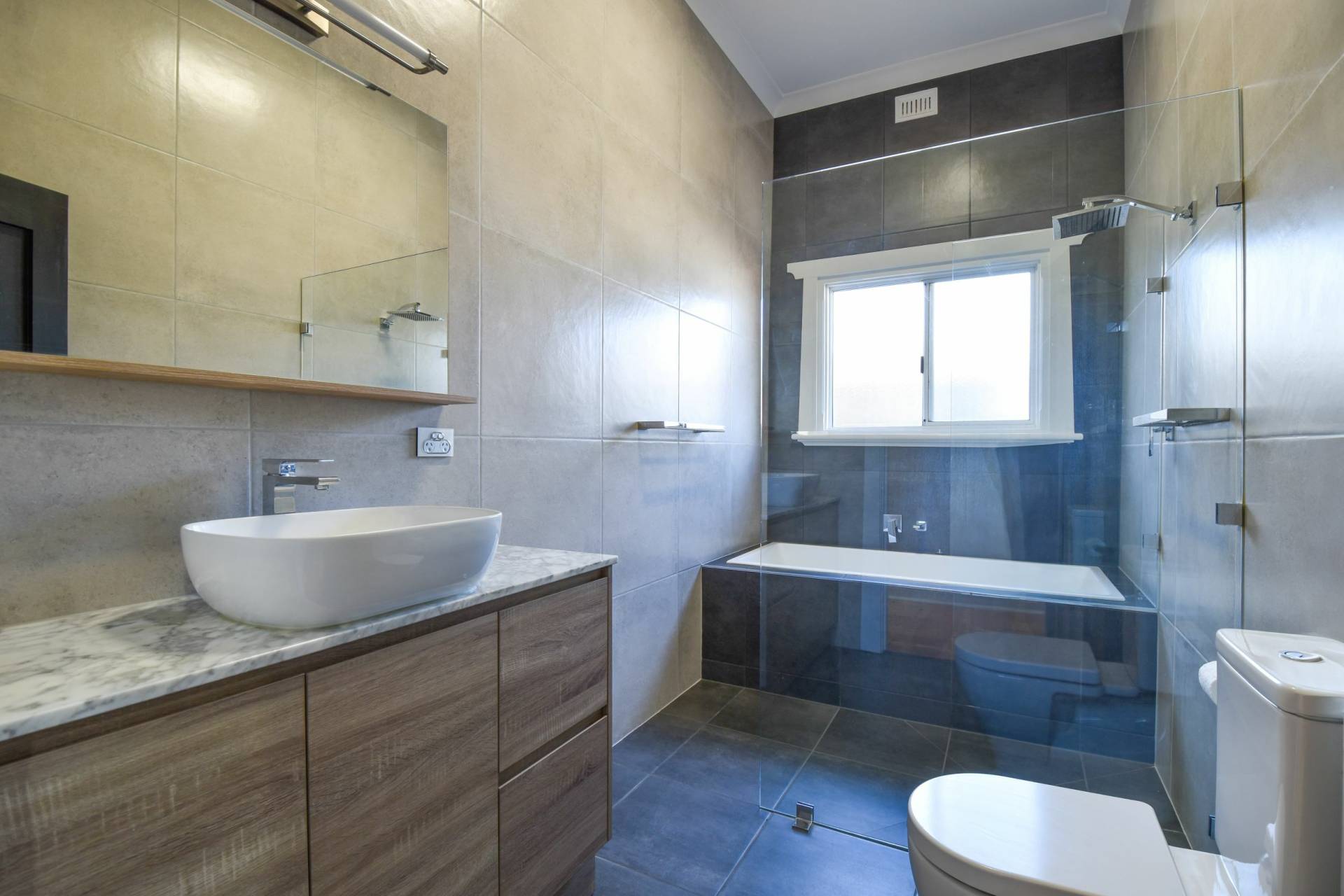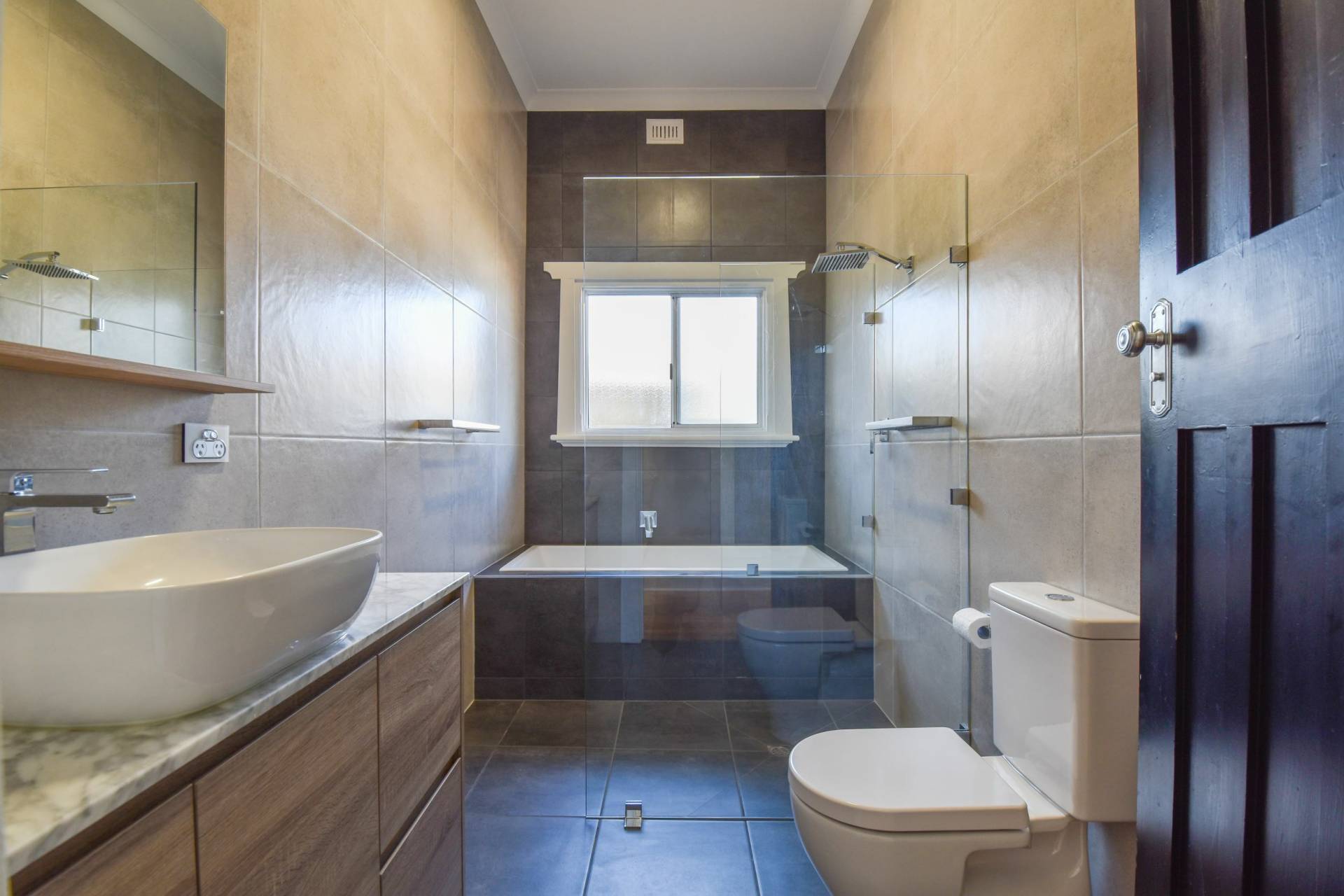 Step into the updated bathroom, featuring floor to ceiling tiles, bath, shower, vanity with ample storage and toilet.