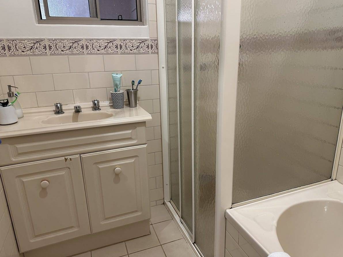 Family bathroom with shower and separate bath, storage room, laundry and toilet.
