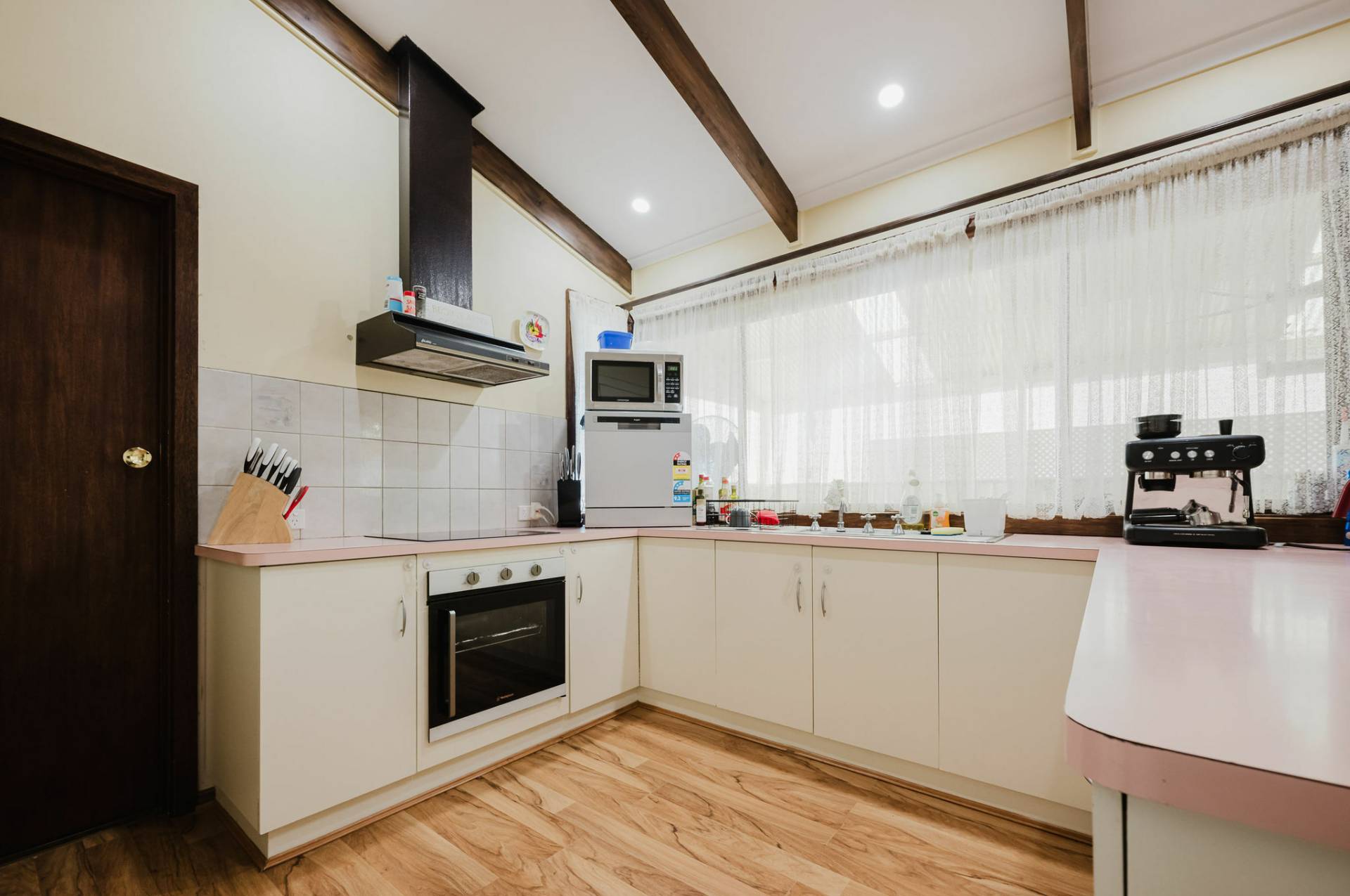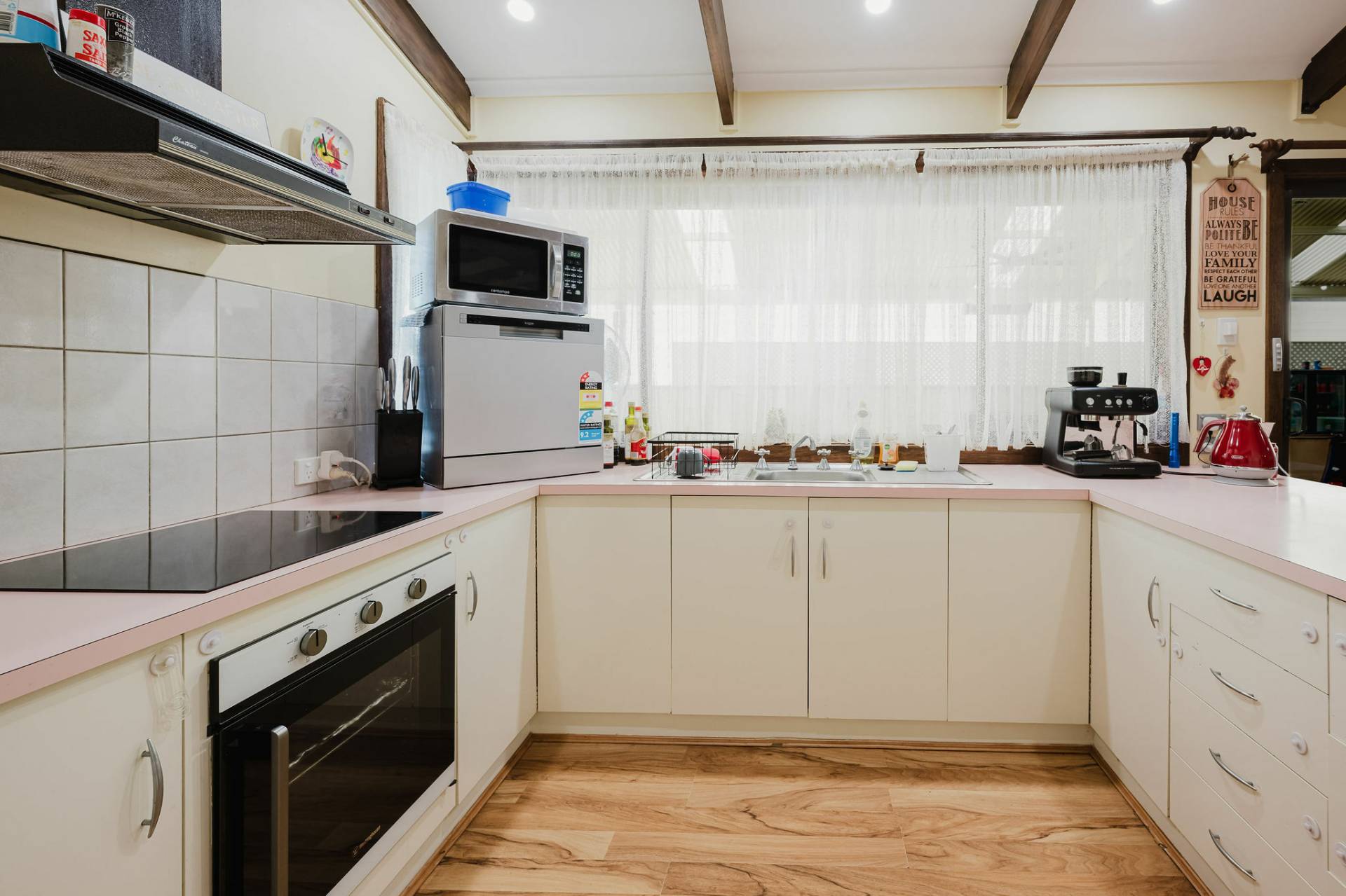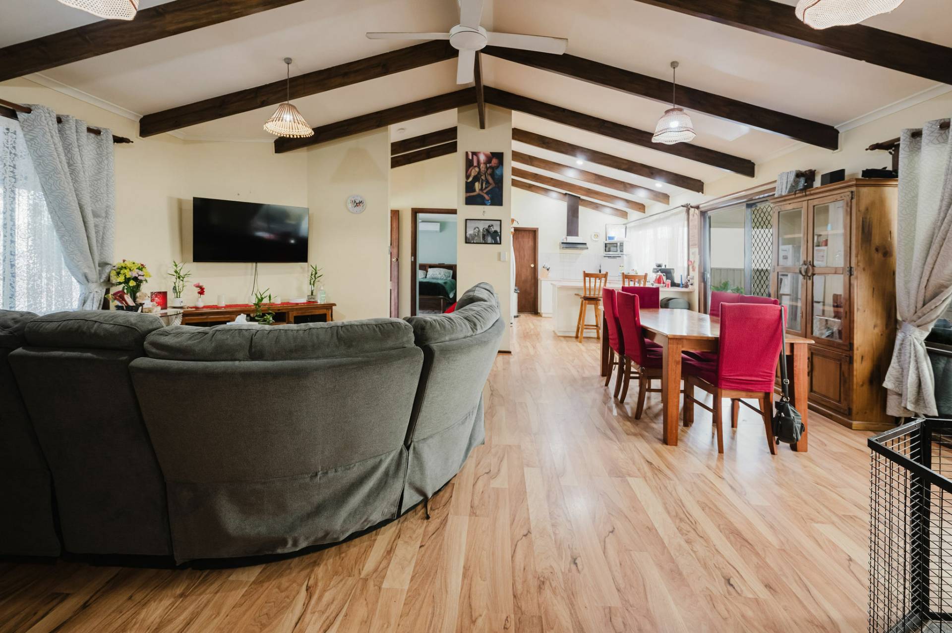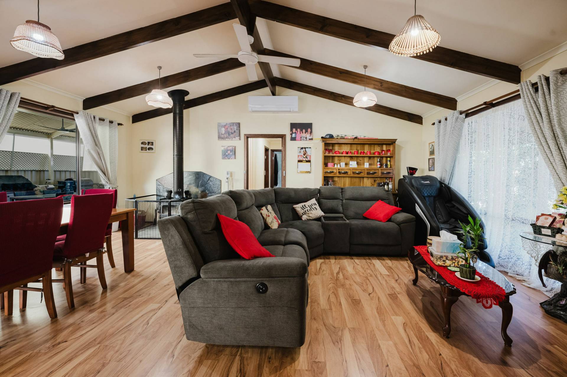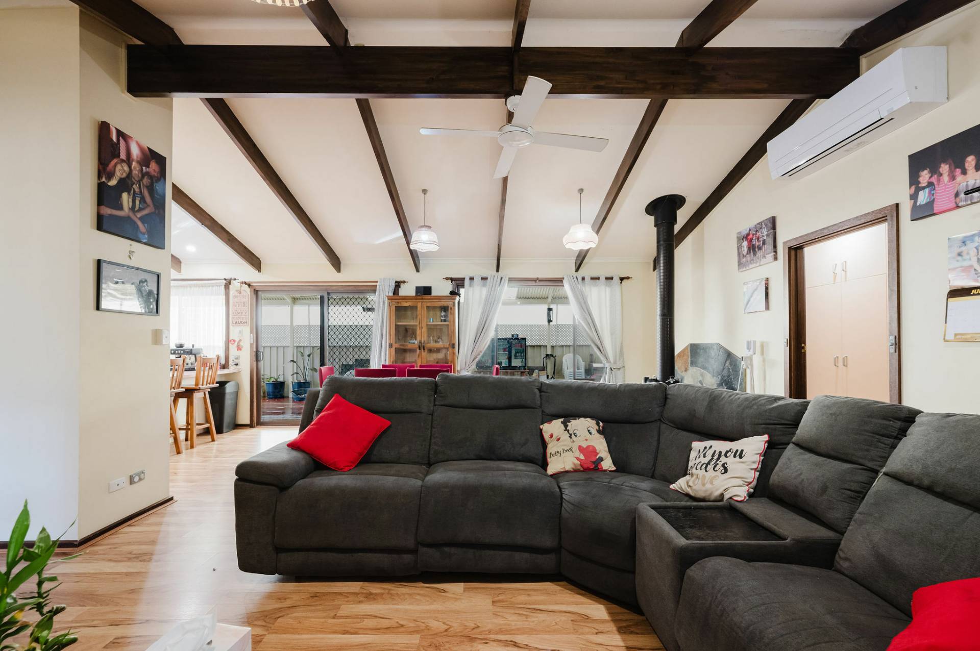 Established trees, plants and easy- care garden.  Open-plan living with large windows providing natural light and raked ceilings.  Lounge/dine and well-designed kitchen with good bench area, cupboards and storage.  Combustion heater and split system for comfort, ceiling fans & down lights.  Three spacious bedrooms with built in robes, the Master having a private courtyard.  Family size bathroom with separate toilet.