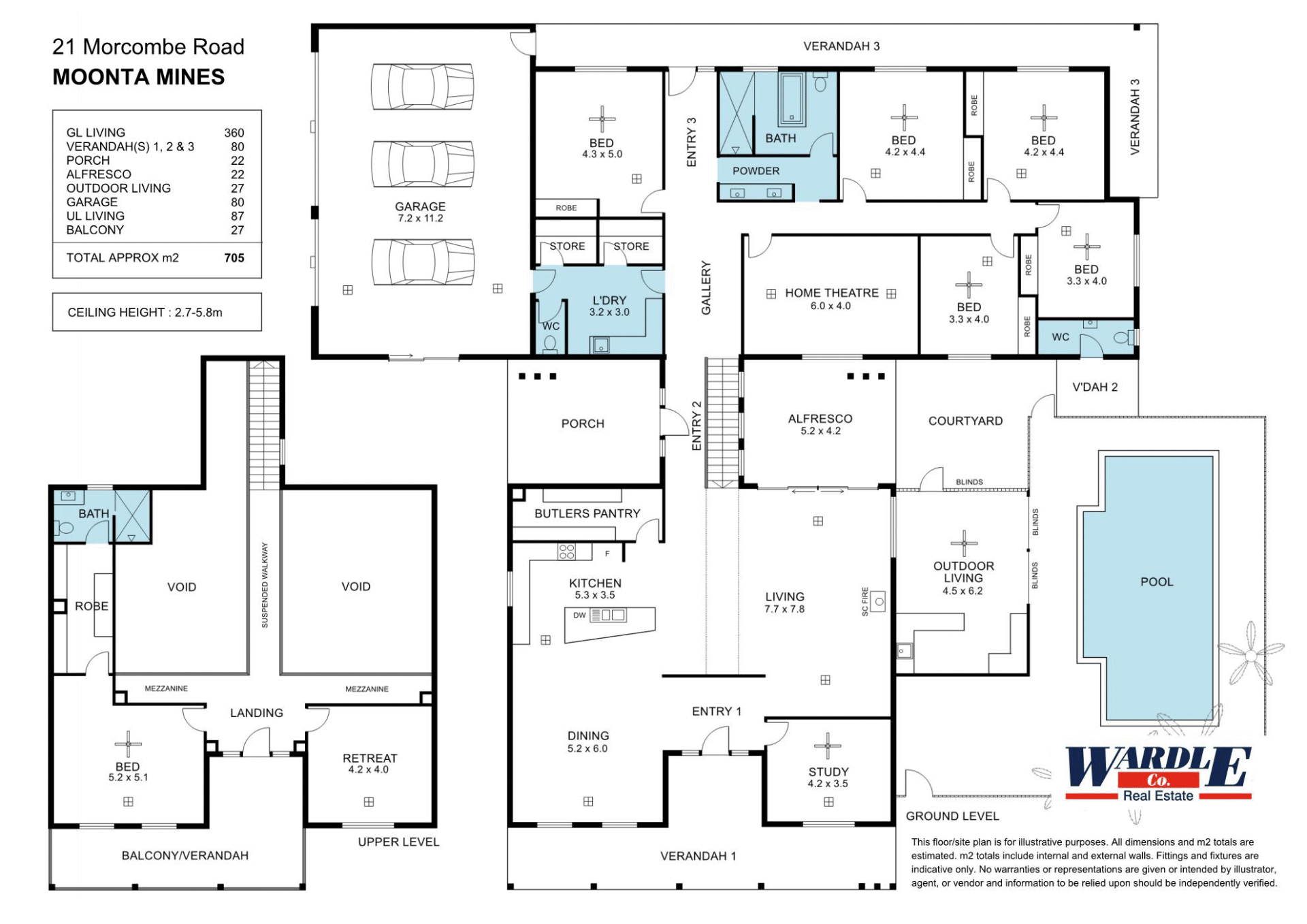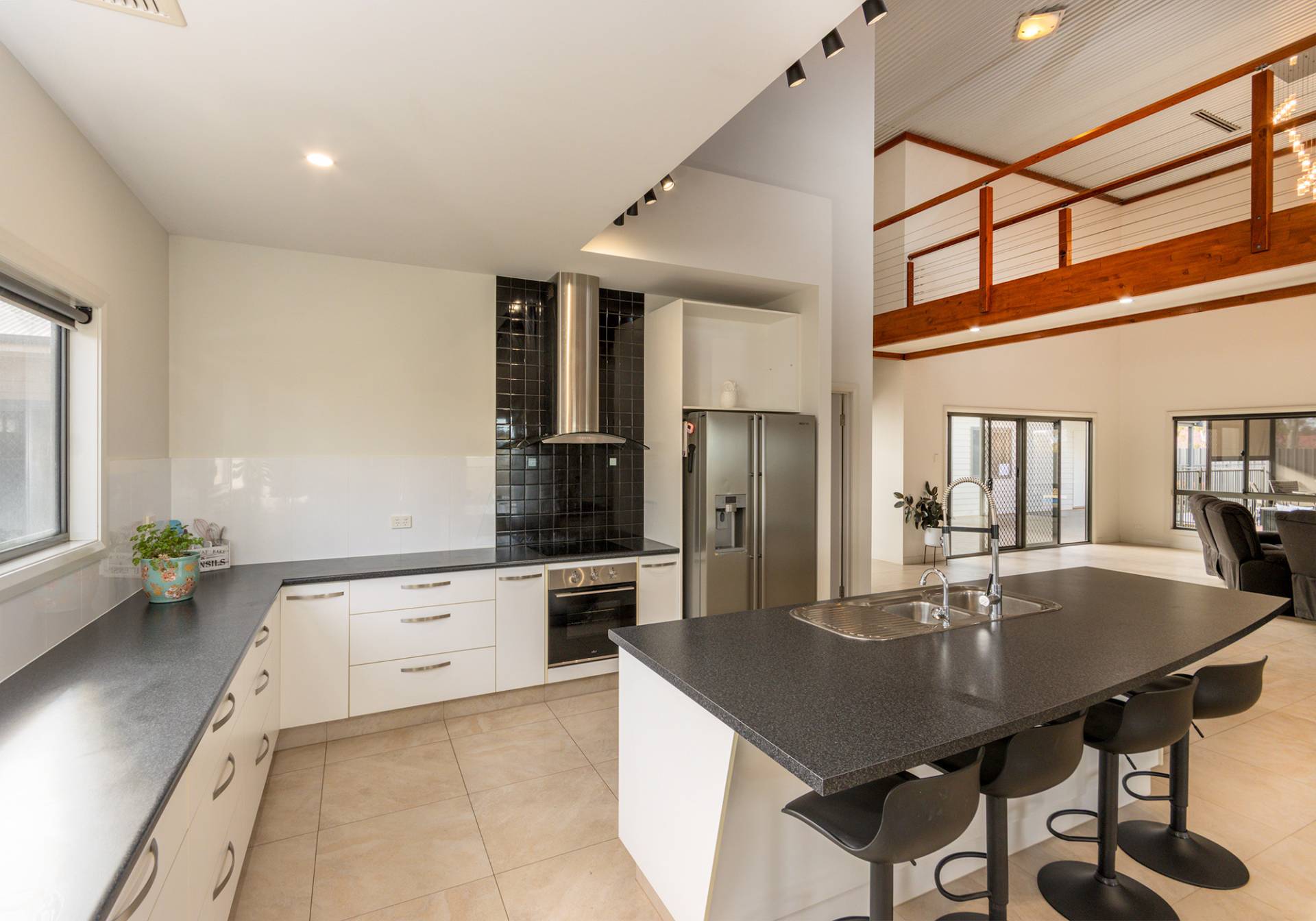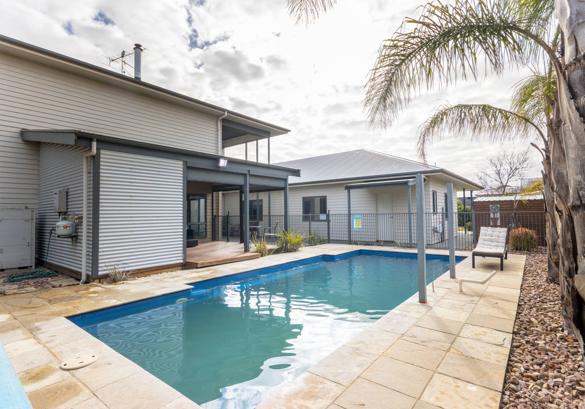 Nestled on a generous 1.67ha allotment just minutes from the heart of Moonta, this 2009 built masterpiece offers 7-bedrooms, 2 bathrooms and 4 toilets. A rare opportunity for growing families, lifestyle seekers, or investors looking for versatility and potential. The ground floor features an expansive open-plan living and dining area, ideal for large family gatherings or entertaining guests. A modern kitchen takes centre stage with quality electric appliances, glossy black tiled splashback, ample cupboard and bench space, and a large island bench complete with twin sink, dishwasher, storage and breakfast bar. A large walk-in pantry provides additional shelving and appliance space, while stylish tiling flows throughout the home. Year-round comfort is assured, with reverse cycle heating and cooling servicing the front of the home and evaporative cooling providing airflow to the rear. A combustion heater also adds warmth and ambience during the cooler months. Four spacious bedrooms with built-in robes, a separate cinema room perfect for movie nights, a dedicated study, and a large laundry with plenty of storage. The stylish family bathroom is nothing short of luxurious, with a walk-in waterfall shower, freestanding island bath, and double vanity with additional storage nearby. Polished timber stairs lead you to the private upstairs retreat, where the master suite is perfectly positioned to capture sweeping views. Enjoy a generous walk-in robe, private ensuite, and peaceful separation from the rest of the home. An additional upstairs bedroom or home office provides even more flexibility, along with access to the balcony overlooking the coastal landscape. Outside is where this property really shines for entertainers and families alike. A stunning undercover alfresco area comes complete with decking, built-in BBQ, bar and sink all overlooking the fully fenced inground salt-chlorinated pool surrounded by established palm trees and paved grounds, creating your very own resort-style escape. A fourth toilet nearby adds extra convenience for poolside entertaining.
