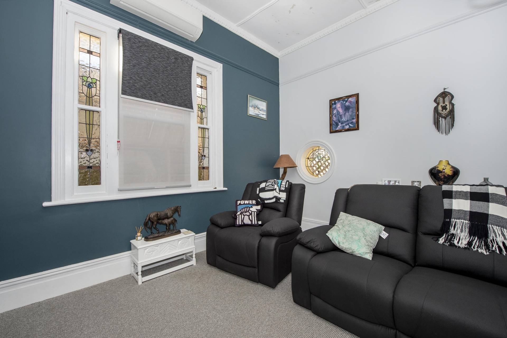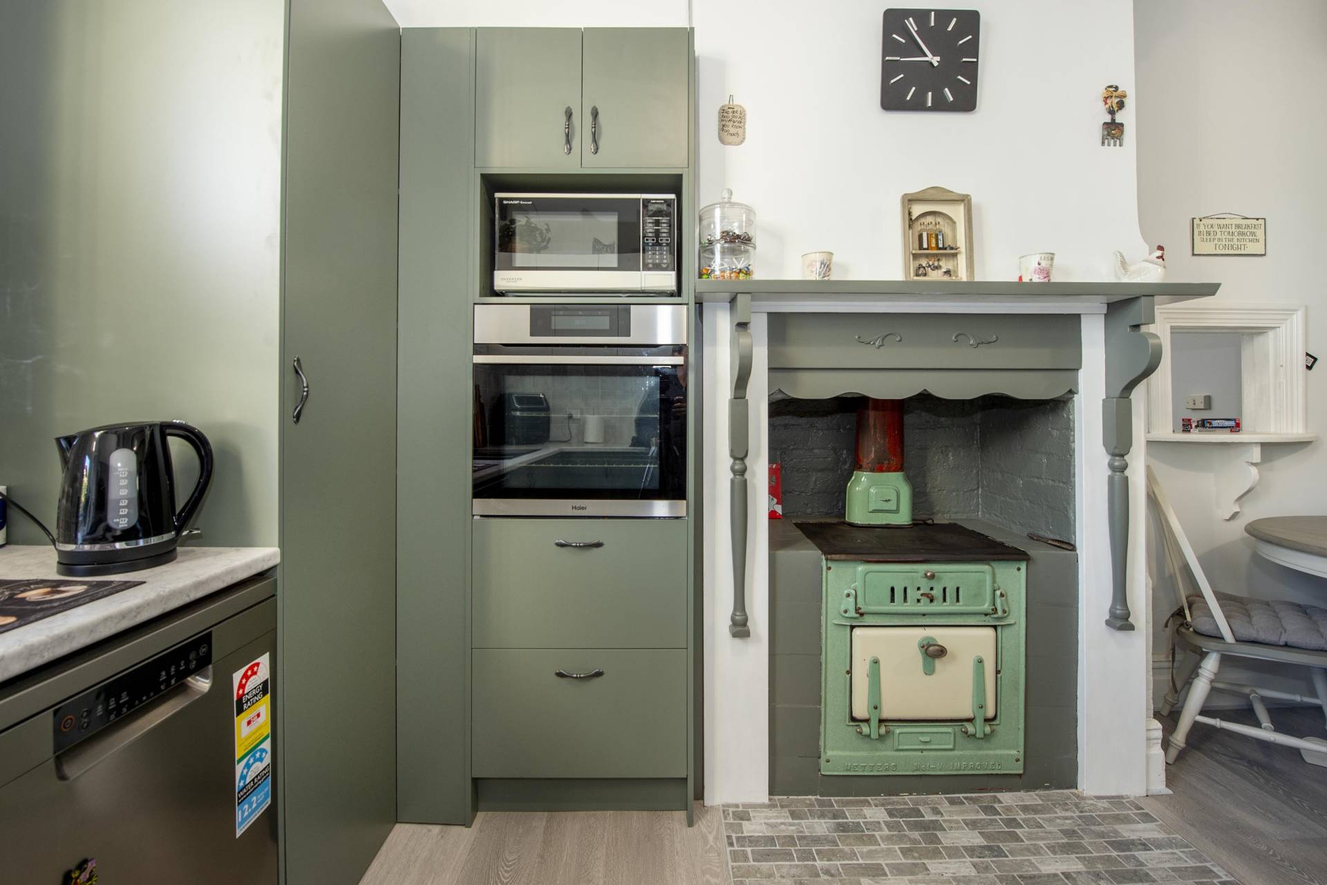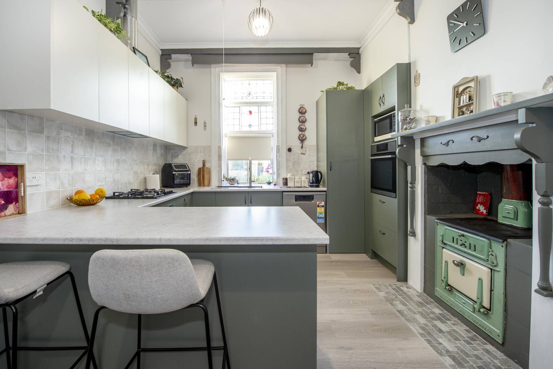 The kitchen has been tastefully upgraded with lovely decor and includes a working original wood stove, dishwasher, leadlight bay window and there's room for a casual meals area. There's plenty of storage with a cloak/dressing room adjacent the stunning bathroom that includes stainless shower alcove, vanity and convenience of a second toilet.
