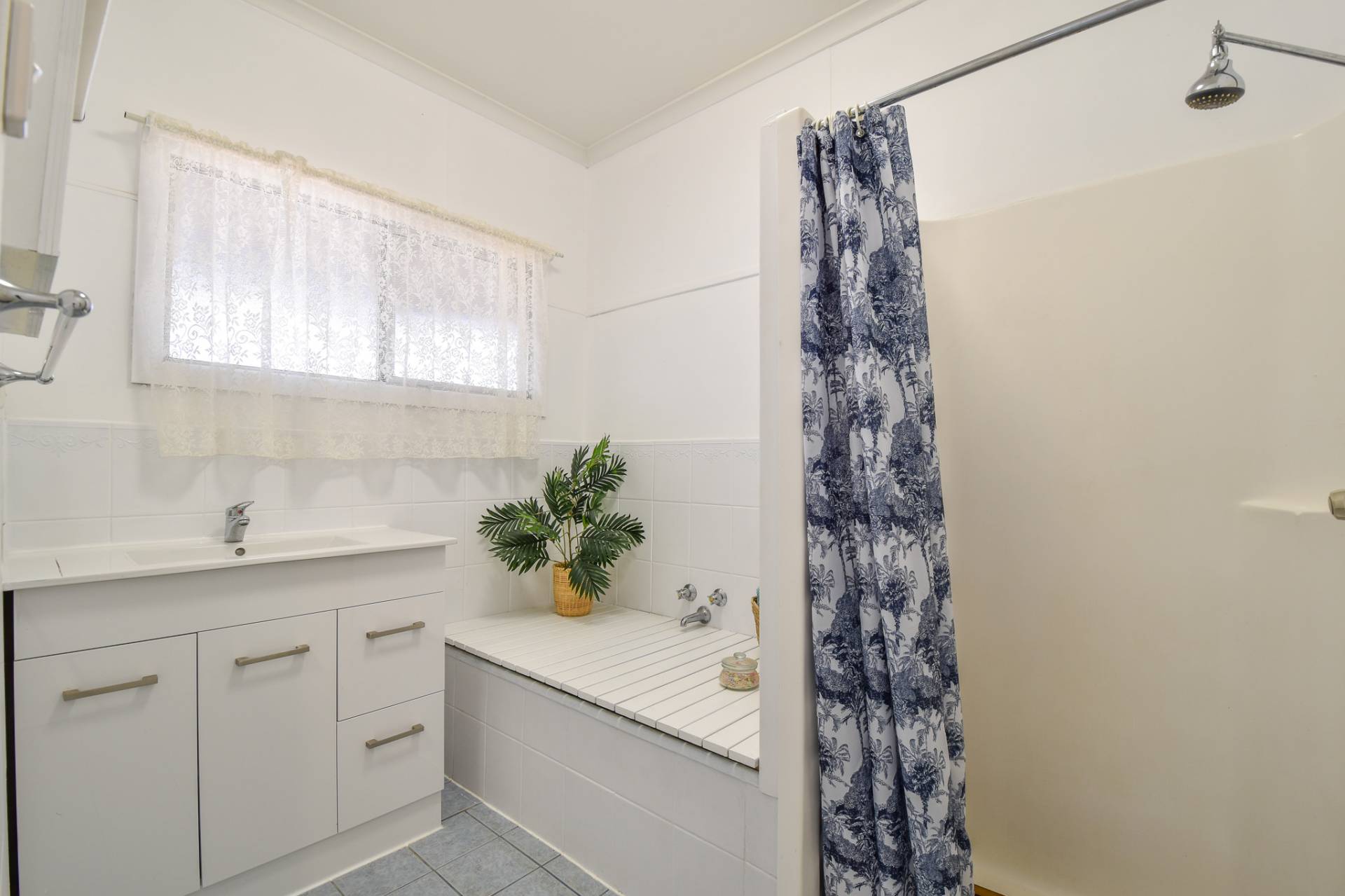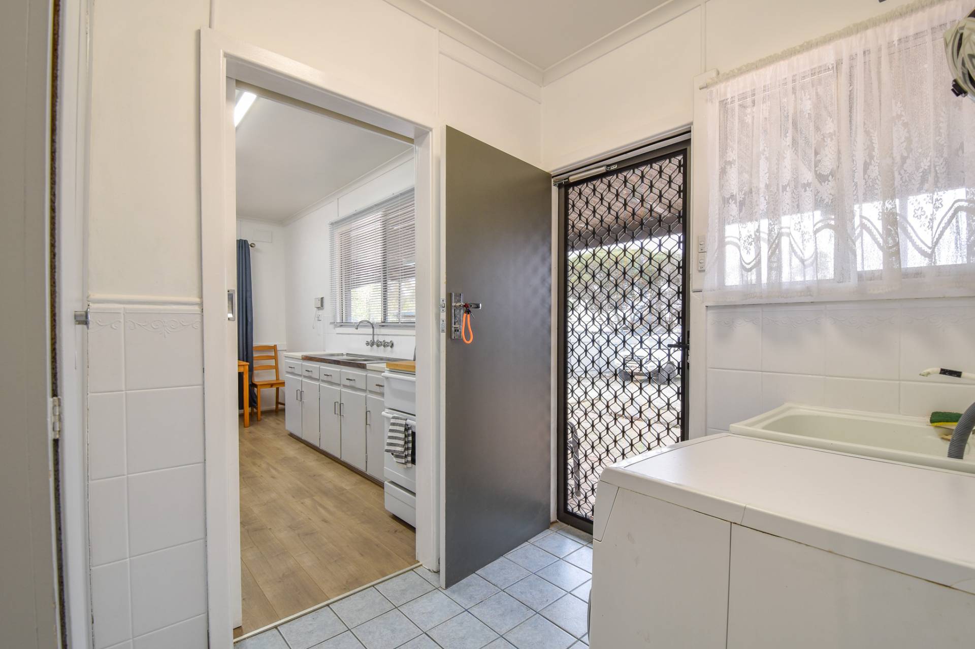 The welcoming living area, equipped with both heating and cooling, connects effortlessly with the kitchen. Here you’ll find ample workspace, a stainless steel sink, and a convenient dishwasher, perfect for everyday living. With the kitchen connecting to a traditionally styled laundry that comes with a built-in cupboard and wash trough.