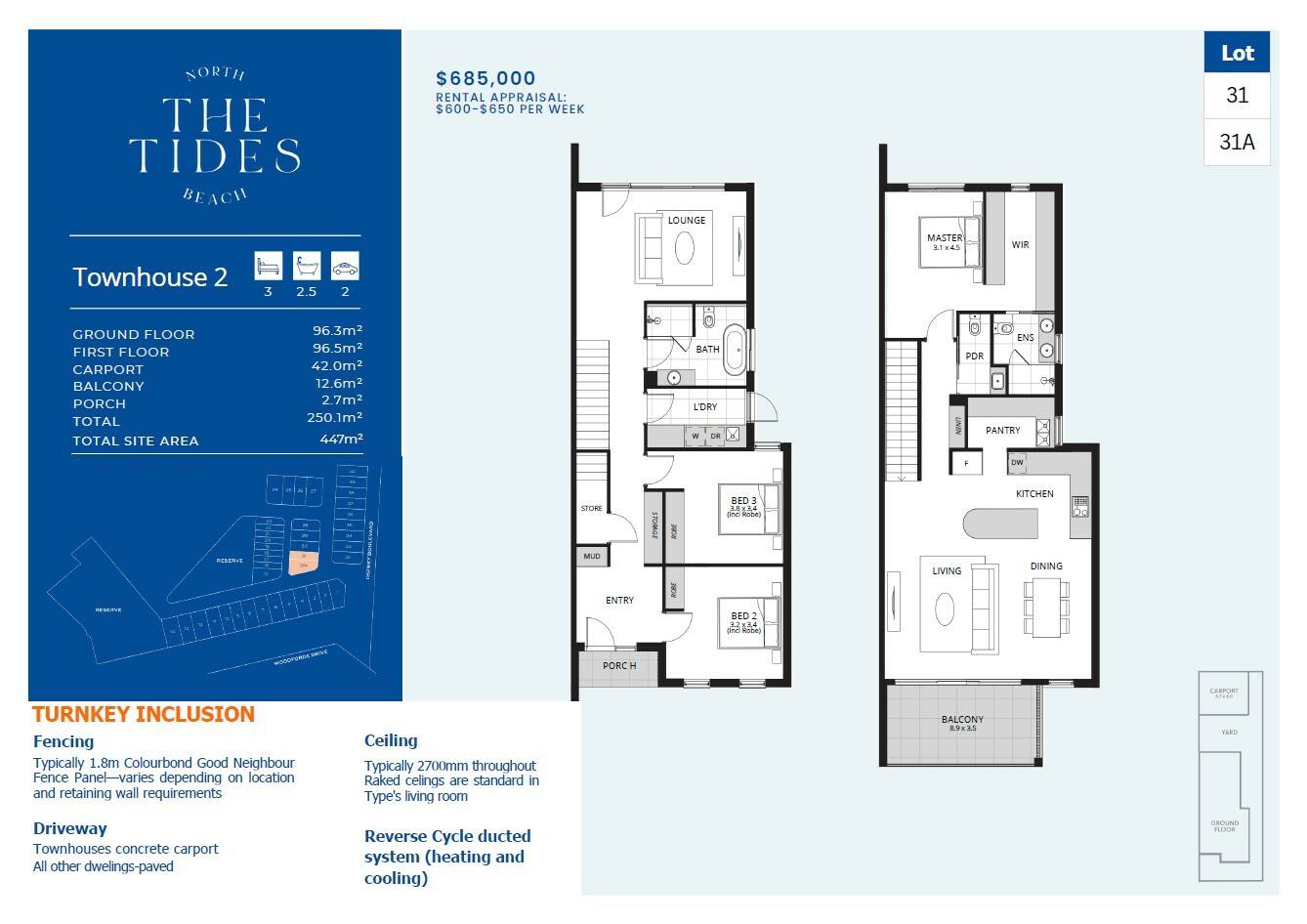 Allotments 31 and 31A include the Townhouse Type 2 design featuring 4 bedrooms, 1 living area, 2 bathrooms, kitchen with pantry, alfresco and double garage UMR.