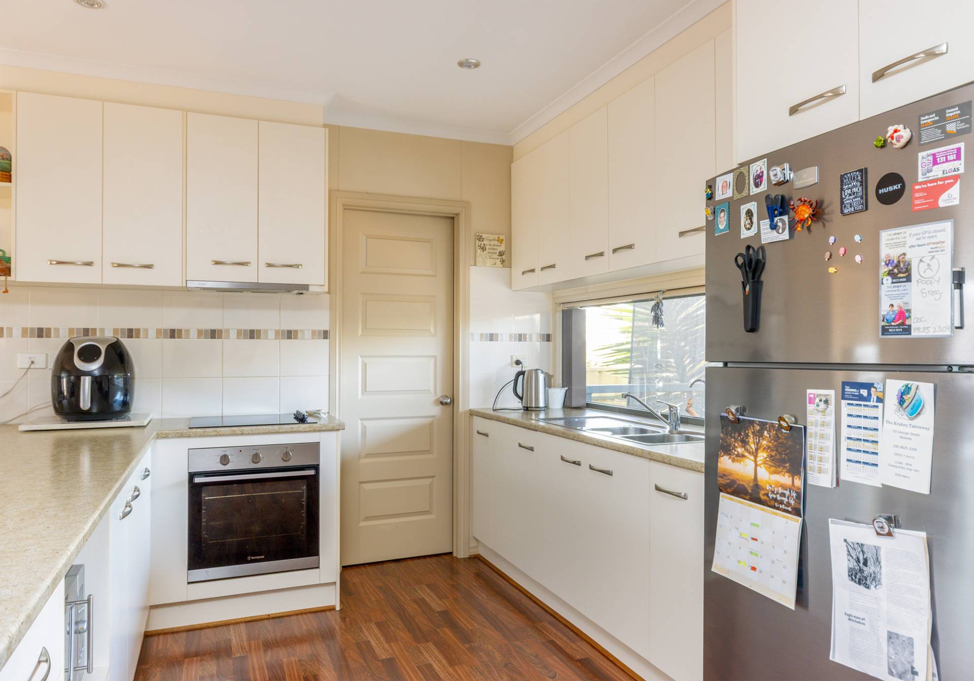 The heart of the home features floating floorboards throughout the open-plan living, dining, and kitchen areas. The kitchen is equipped with an electric cooktop, return bench with breakfast seating, a large walk-in pantry, twin sink, ample cabinetry, and provision for a dishwasherideal for families or tenants alike.
