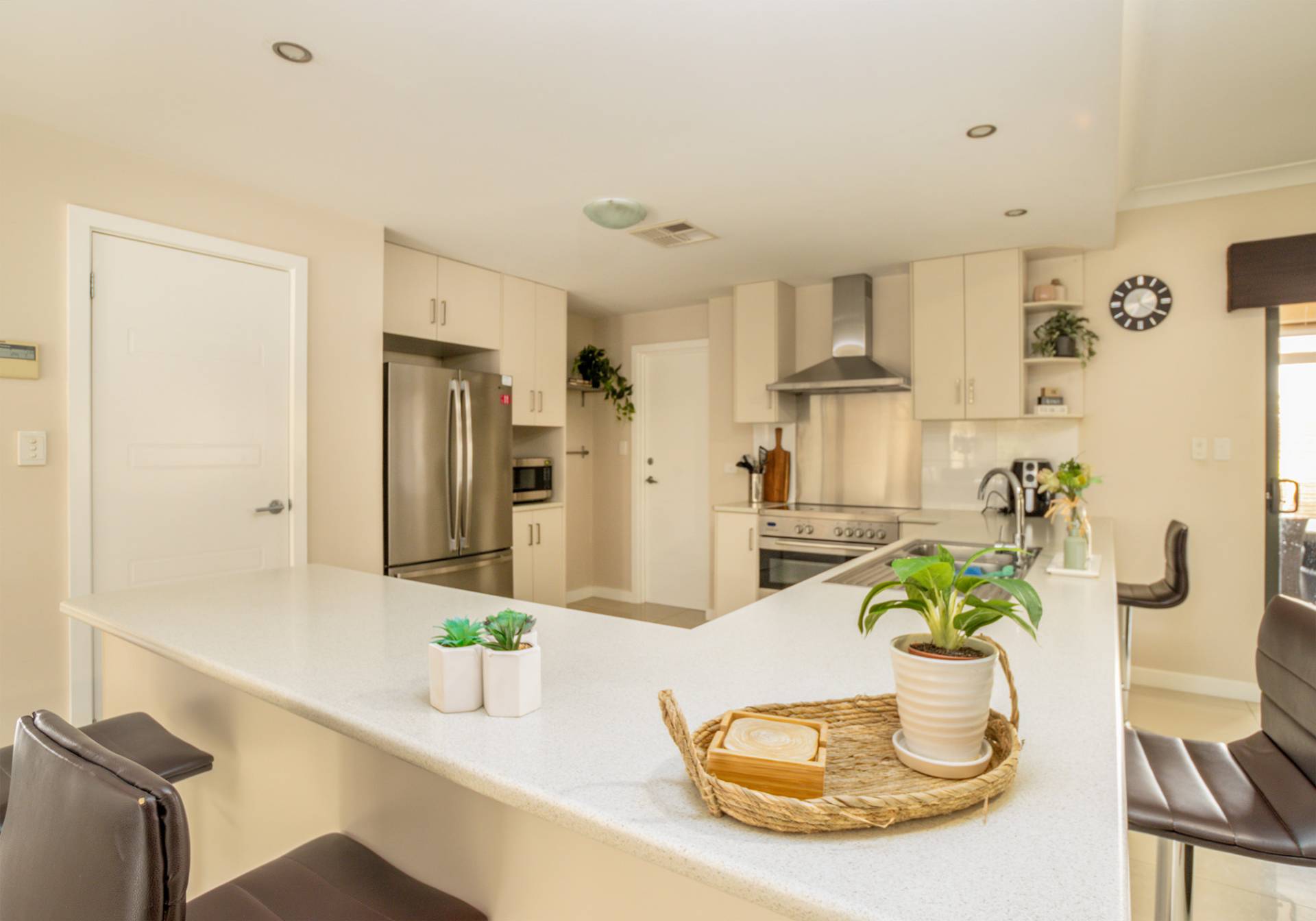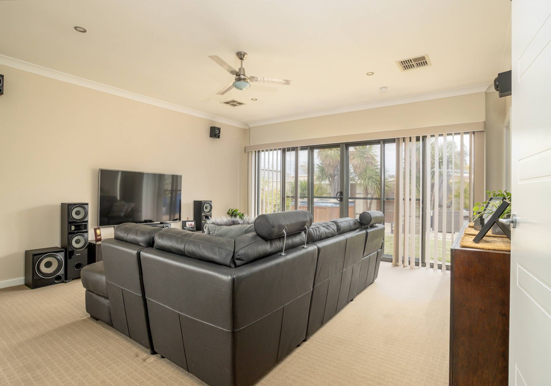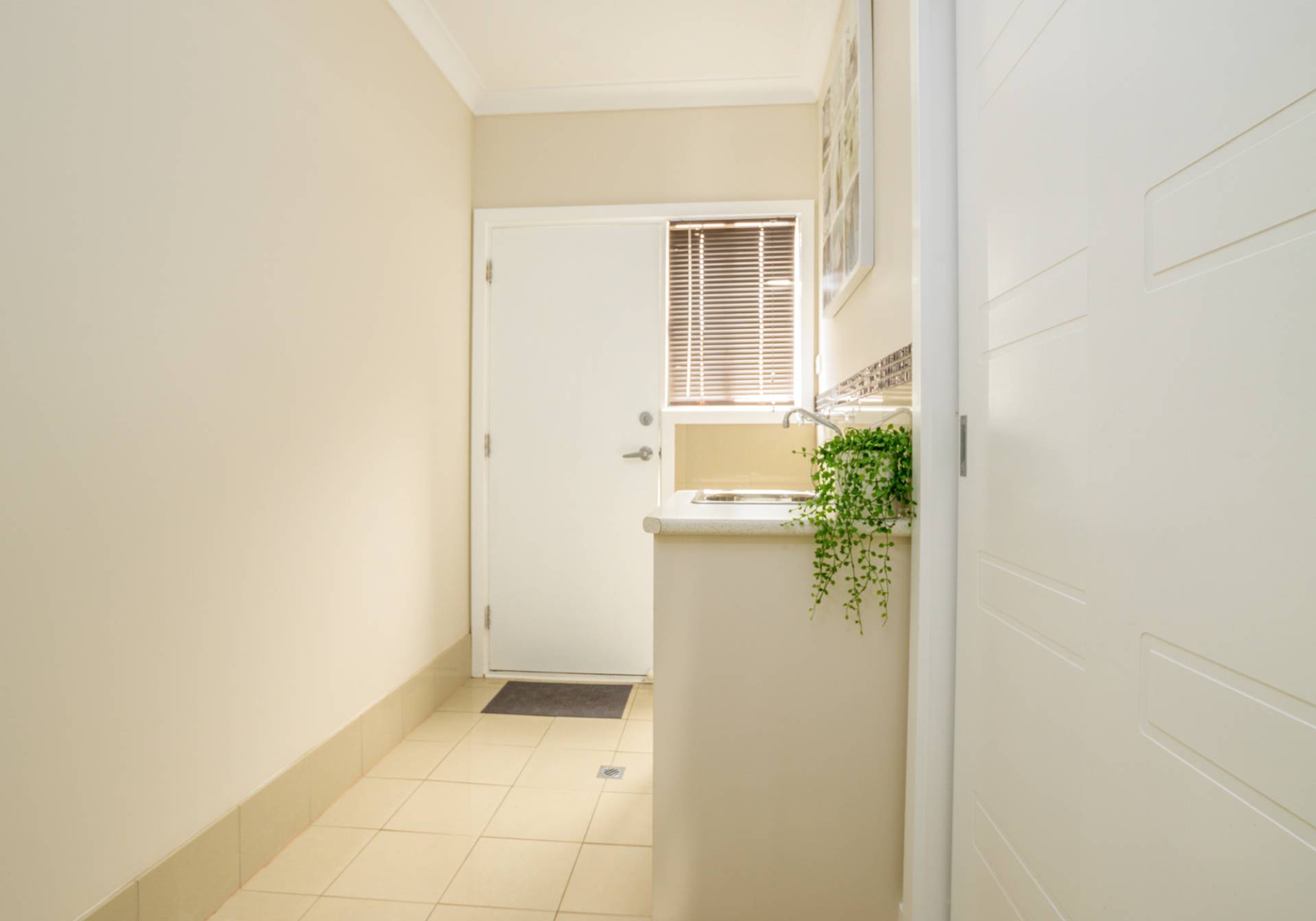 The main bathroom features a bath, shower, vanity, and a separate toilet. There’s also a linen press and a laundry with built-in cabinetry for added storage.