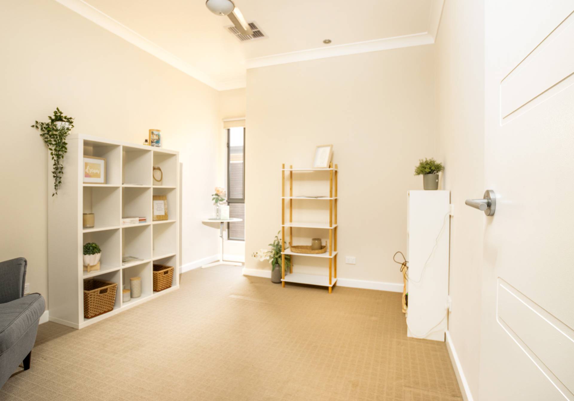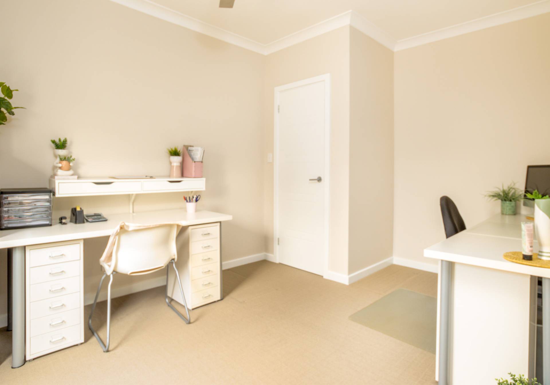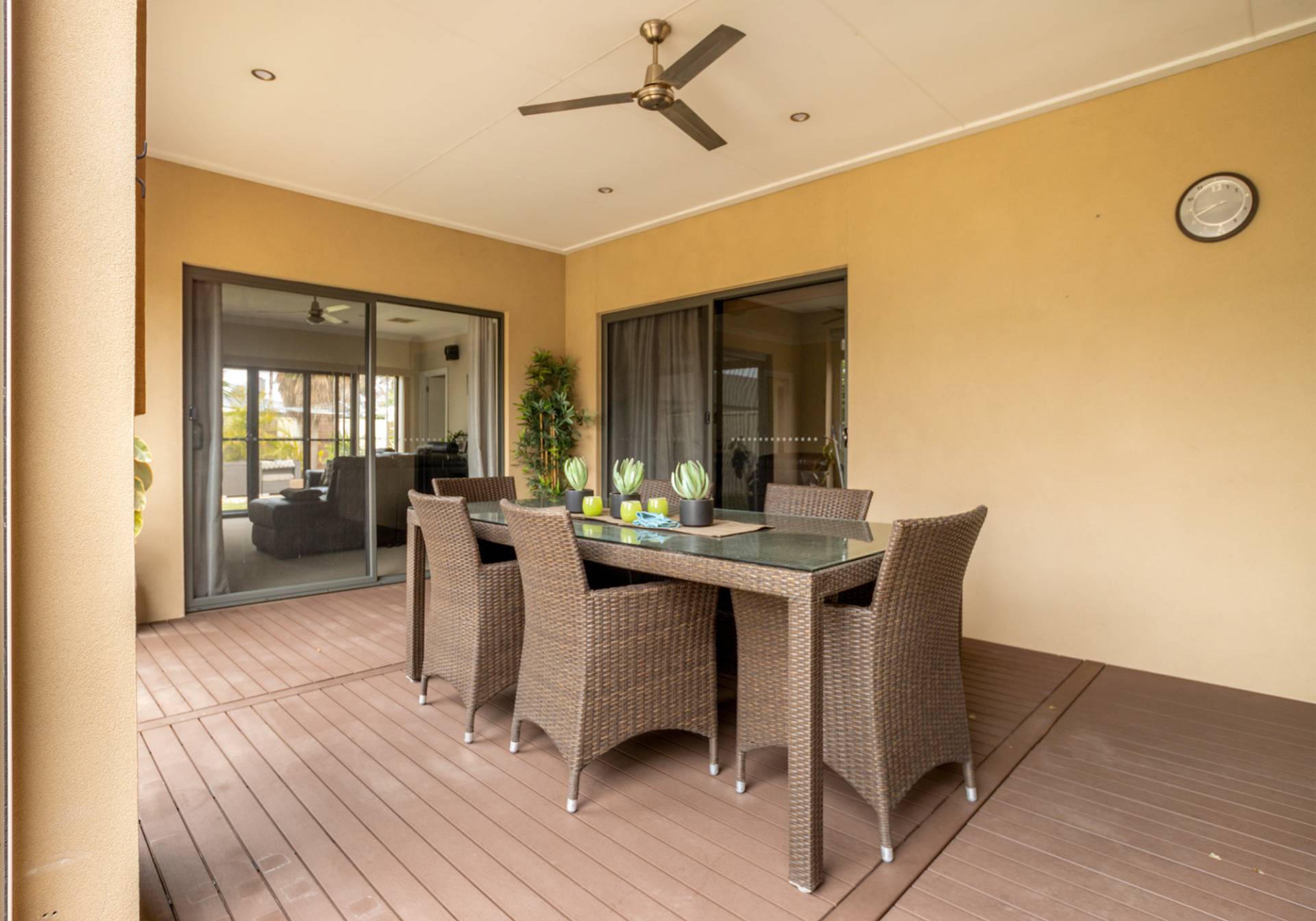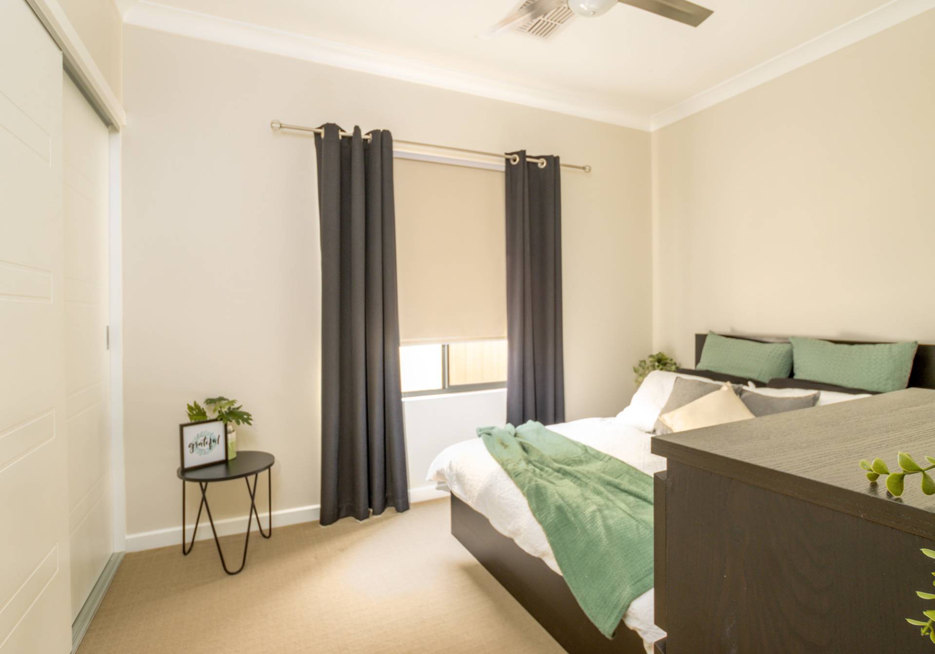 The main bathroom features a bath, shower, vanity, and a separate toilet. There’s also a linen press and a laundry with built-in cabinetry for added storage.