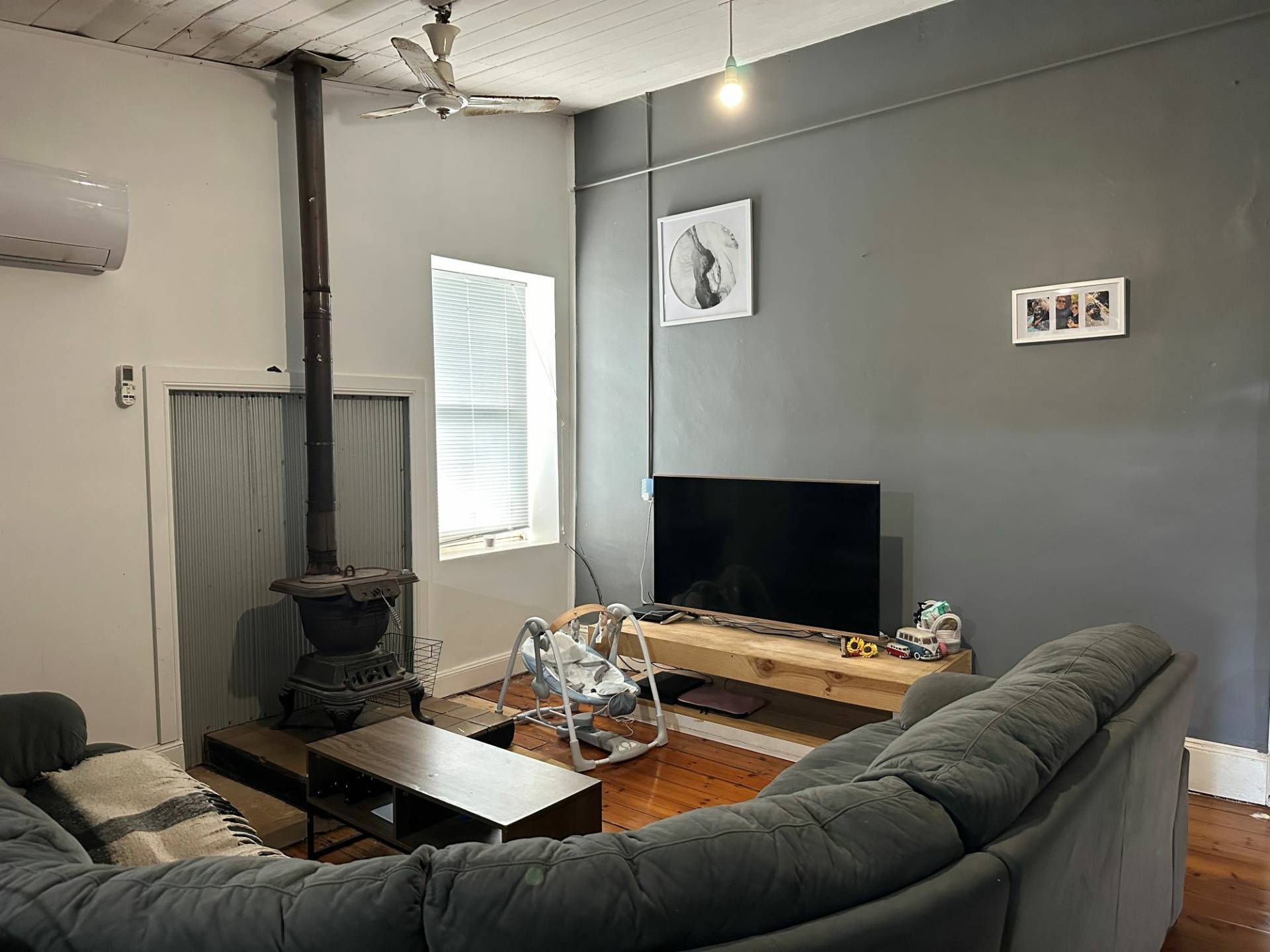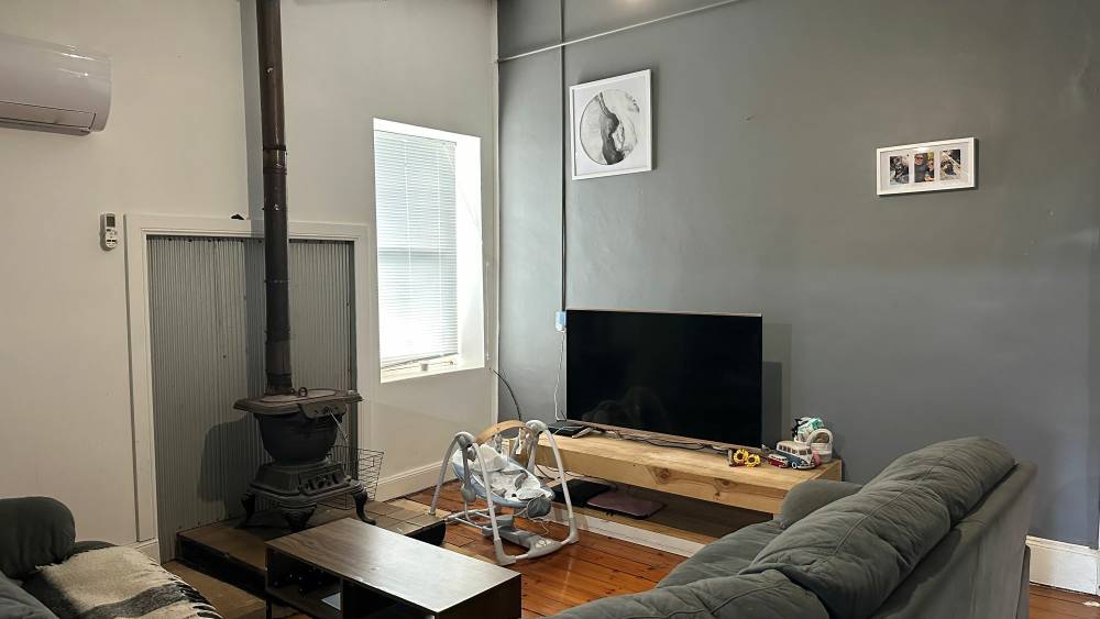• Lounge room with polished pine floorboards, slow combustion potbelly heater & split-system air conditioning
