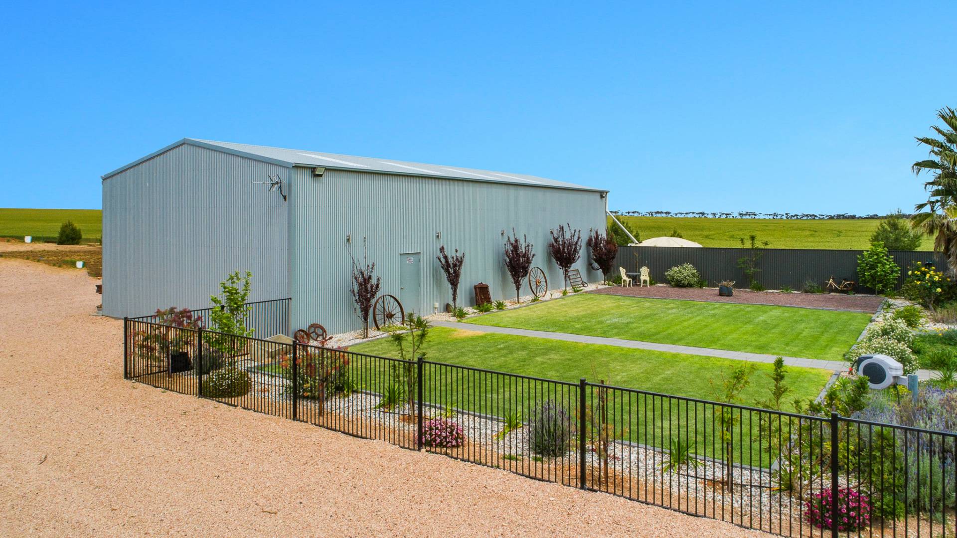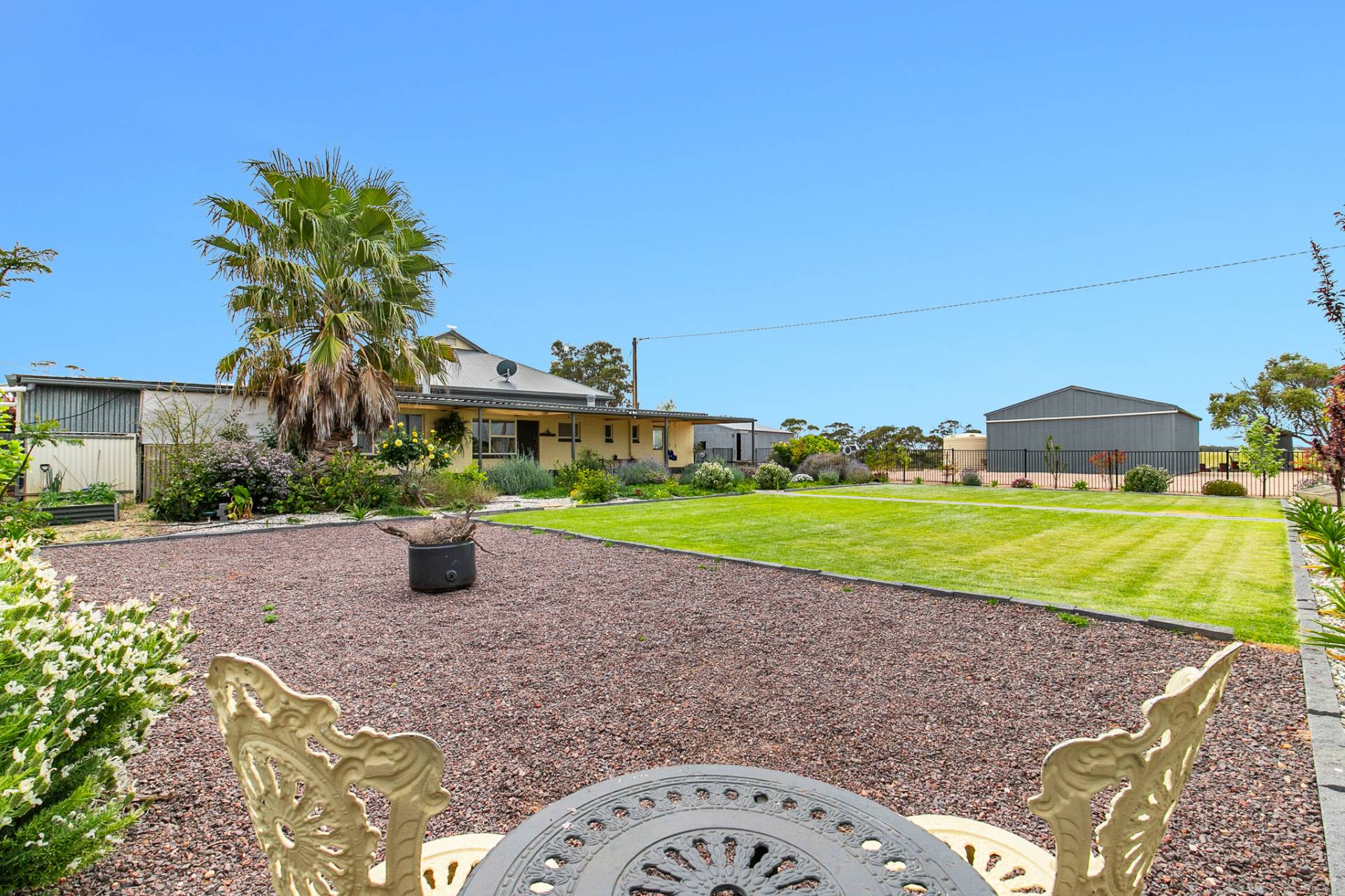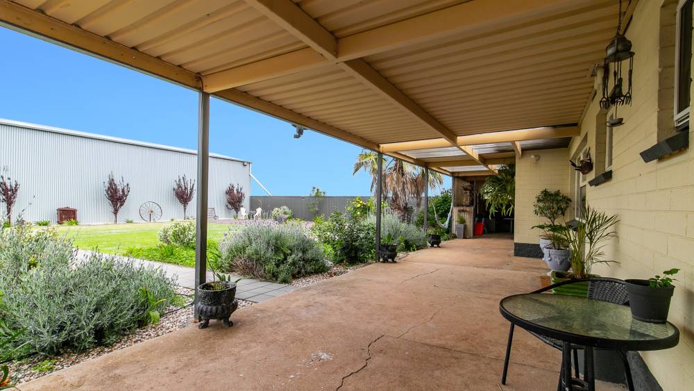 Outside, the charm continues. A concave verandah gracefully wraps around the home, connecting to two outdoor sitting areas the perfect spots to unwind as you take in the peaceful surroundings, watch the sun dip behind the horizon, or listen to the gentle rustle of crops swaying in the breeze.