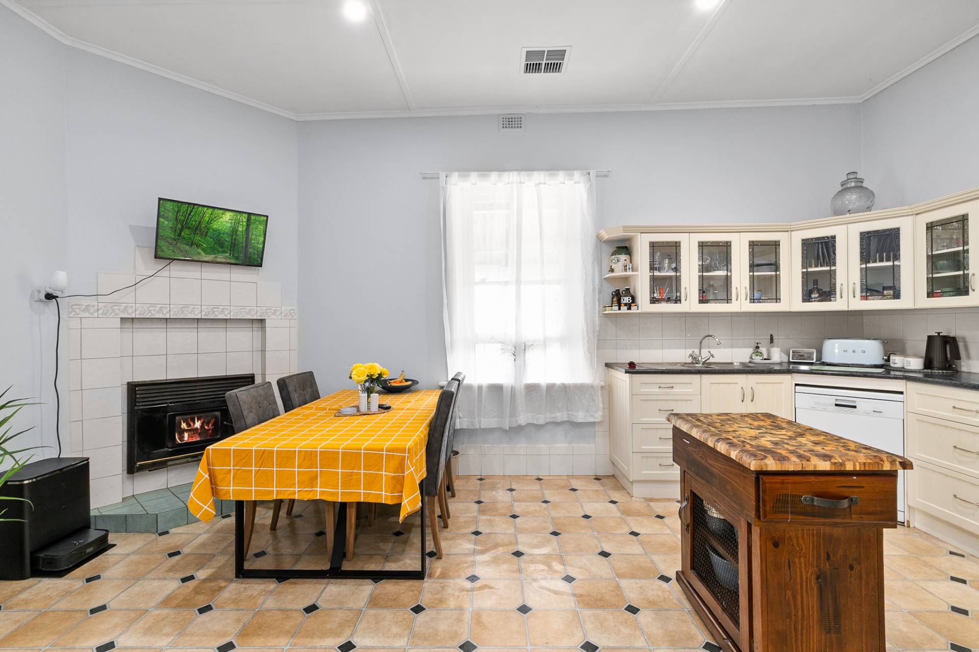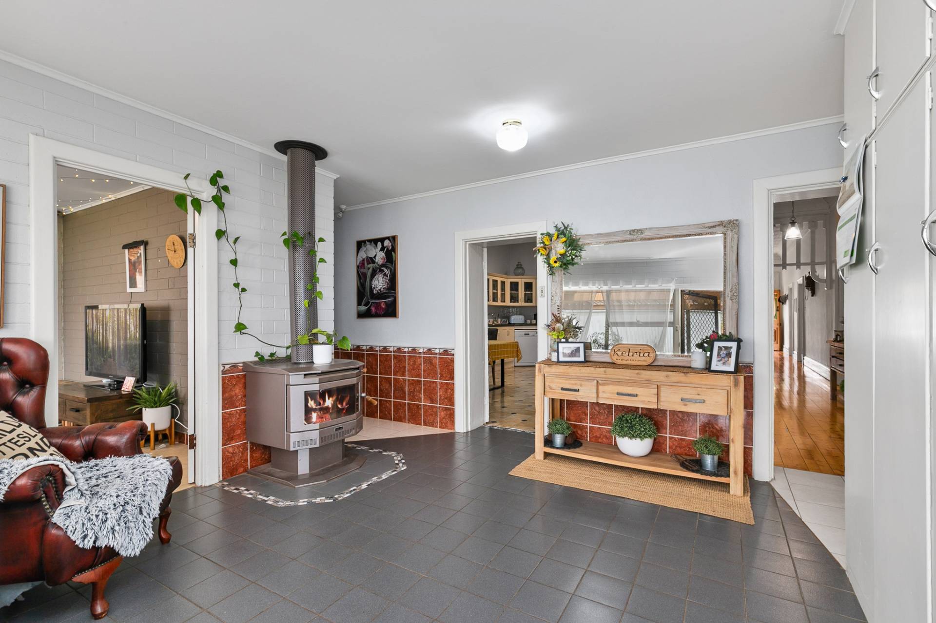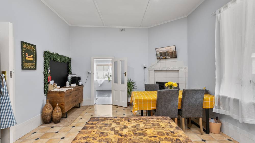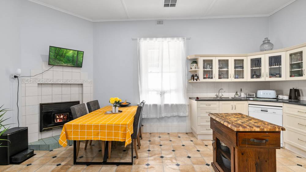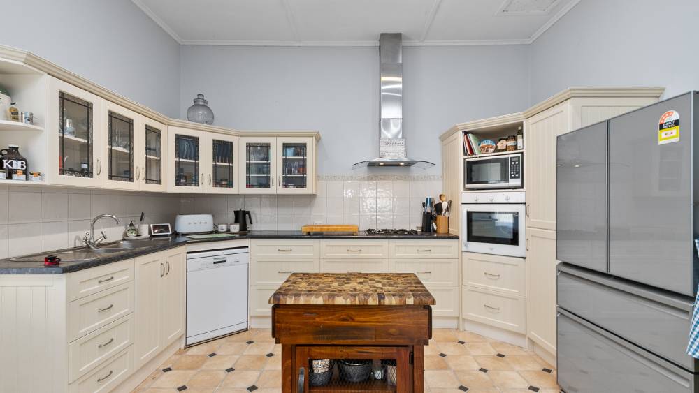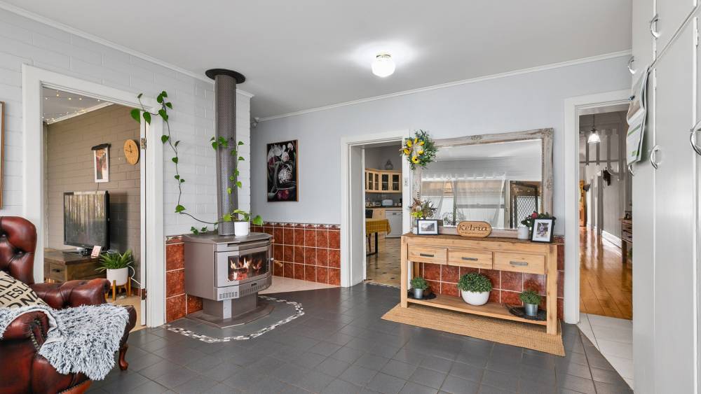 At the heart of the home is the country kitchen, full of charm and practicality complete with ample cupboards, bench space, gas hotplates, electric oven, and a combustion heater for cosy winter mornings. The walk-in pantry nearby adds functionality and storage for all your homegrown produce and pantry essentials.