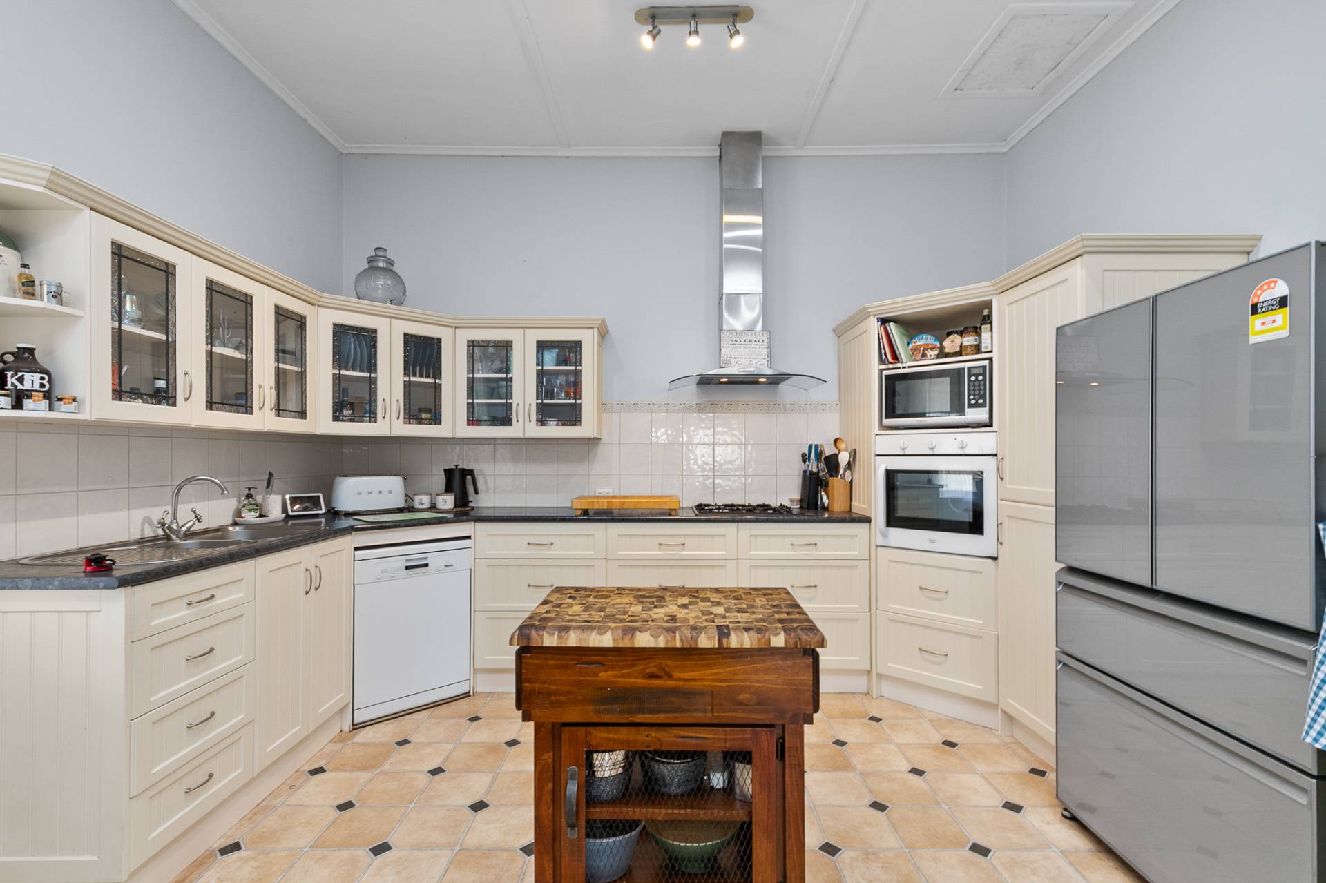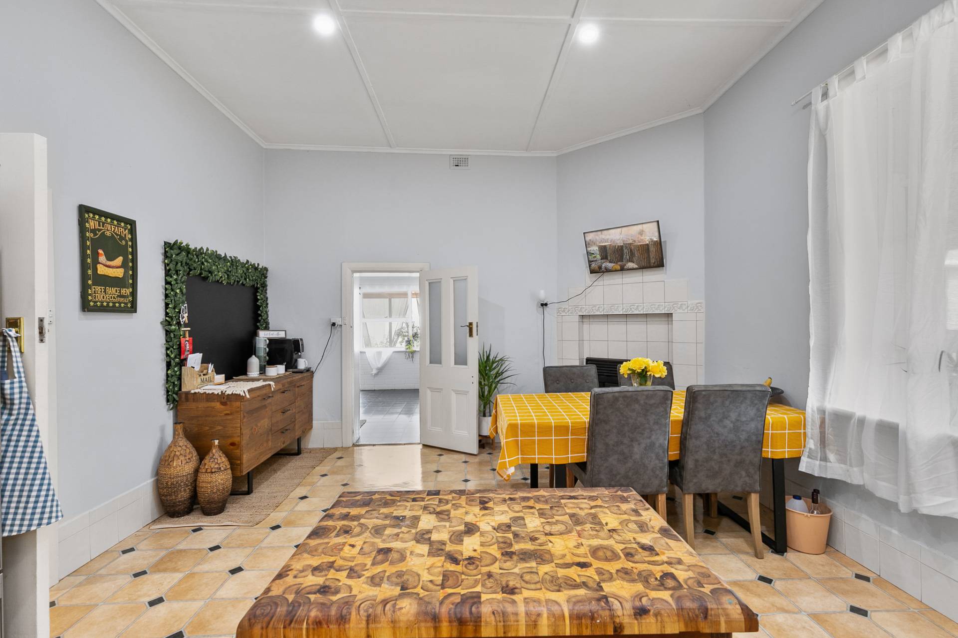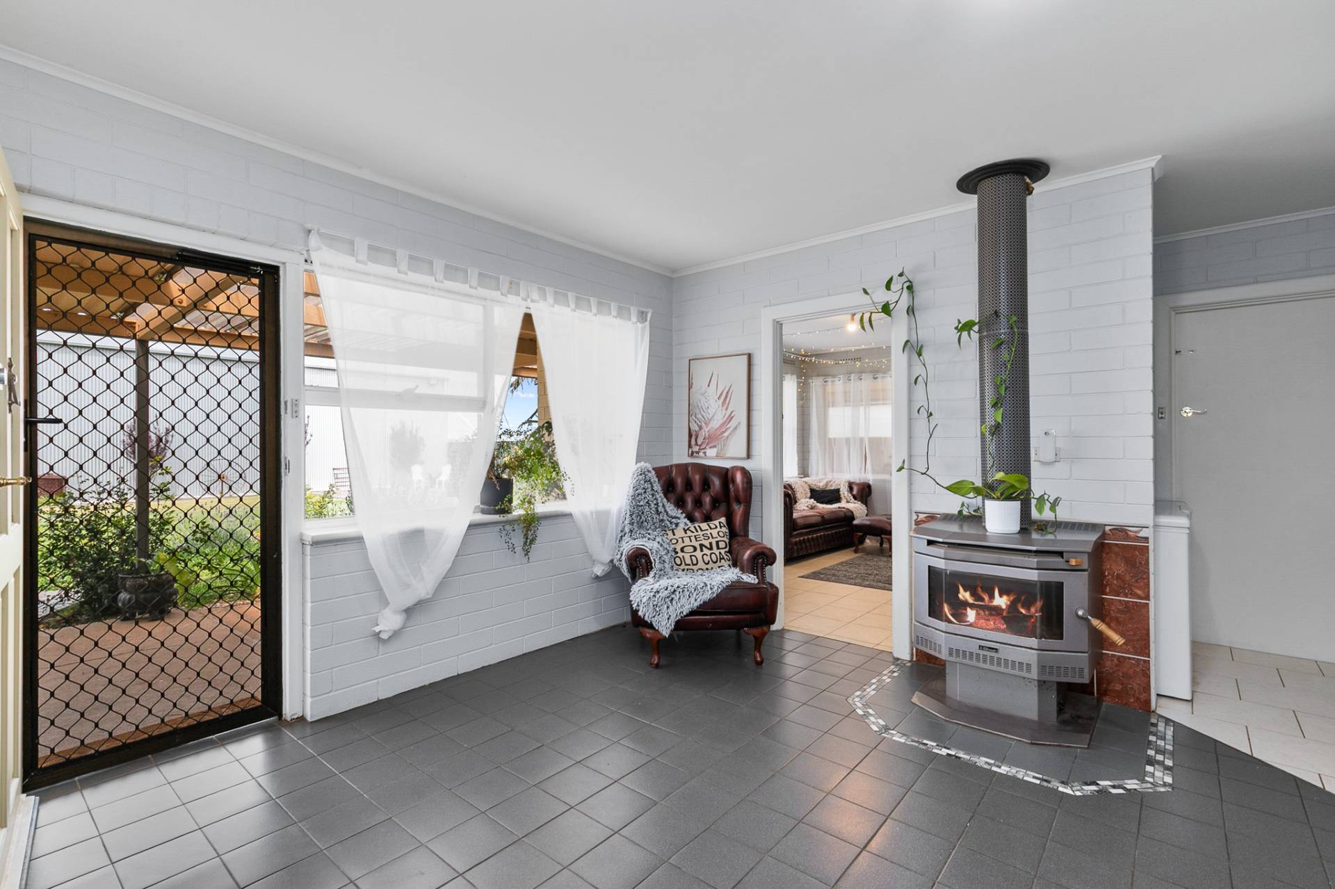 At the heart of the home is the country kitchen, full of charm and practicality complete with ample cupboards, bench space, gas hotplates, electric oven, and a combustion heater for cosy winter mornings. The walk-in pantry nearby adds functionality and storage for all your homegrown produce and pantry essentials.