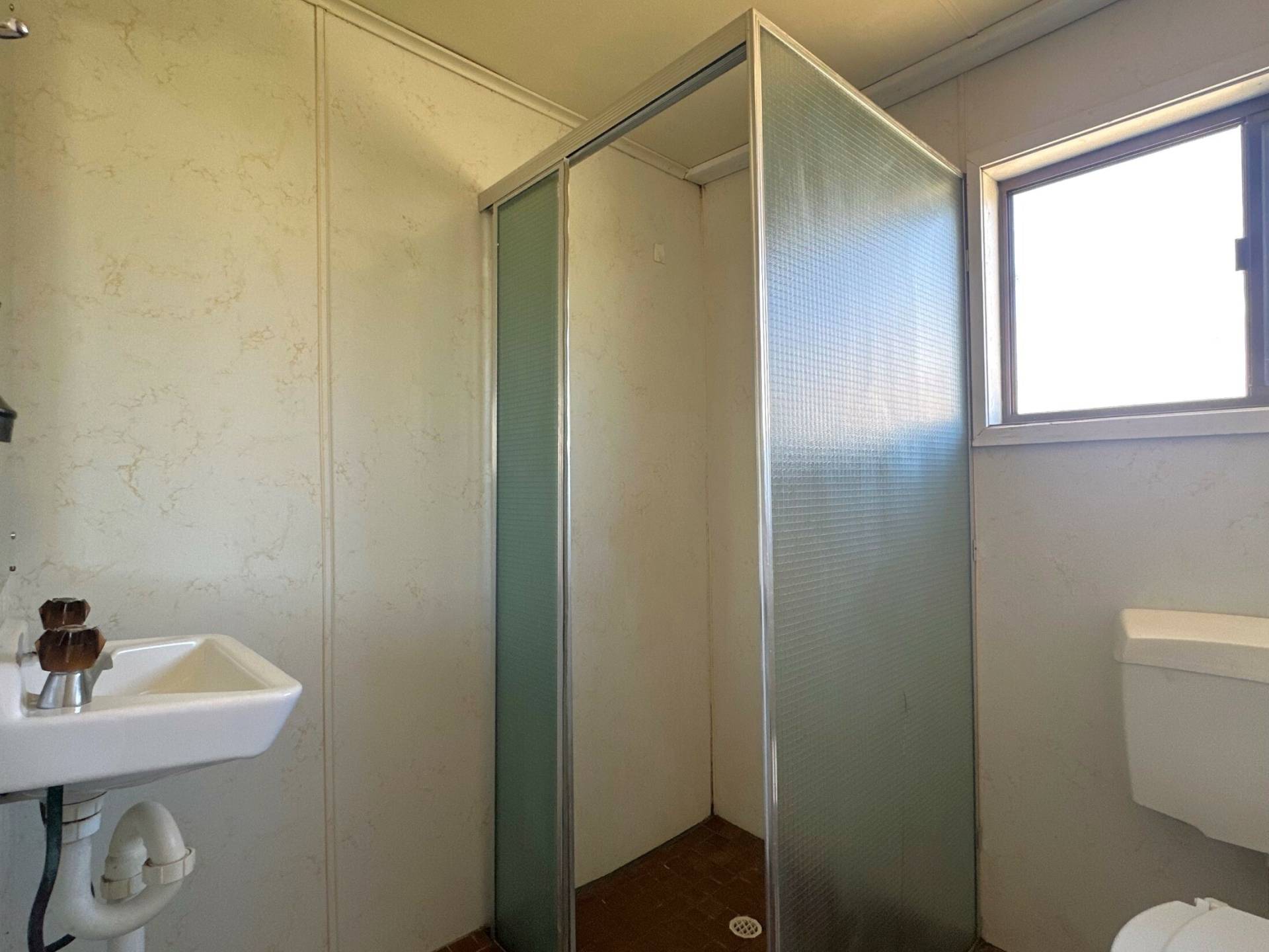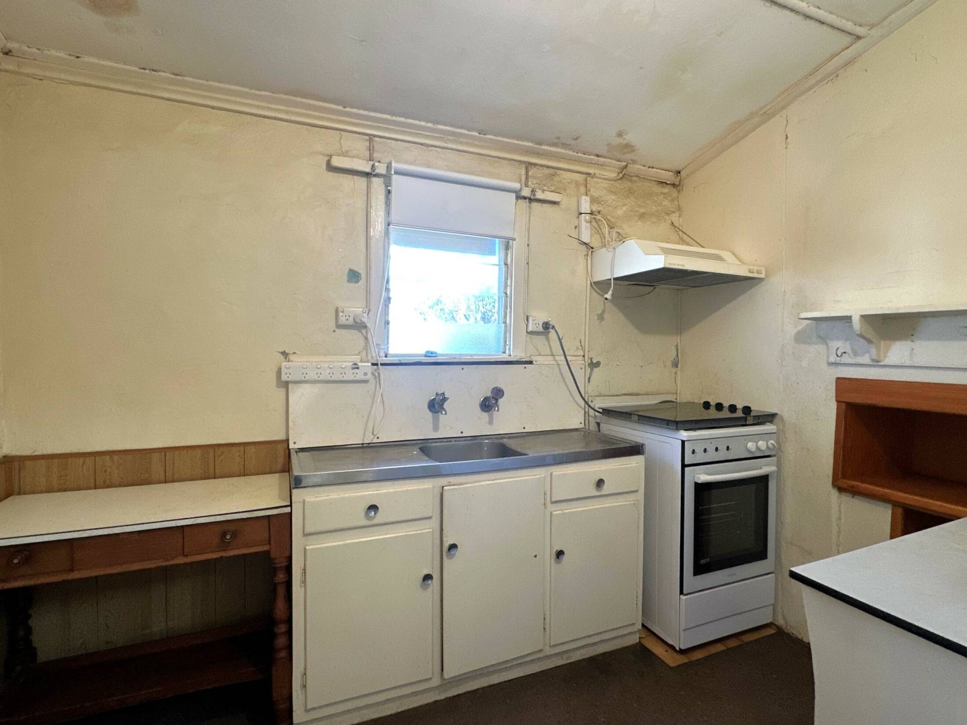 The home features three bedrooms, a compact kitchen, and a tidy bathroom with a shower, basin, and toilet. A small shopfront at the front adds extra flexibility for a home business, studio, or conversion into additional living space. The property includes electric hot water and a single garage.