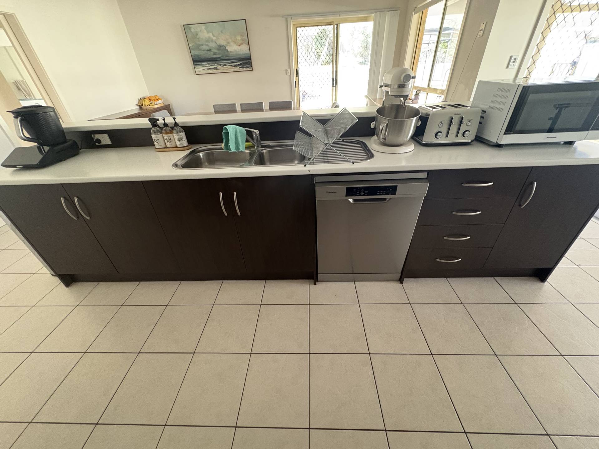 The stylish kitchen adjoins the open-plan dining and family area, flowing effortlessly to the outdoor living space.