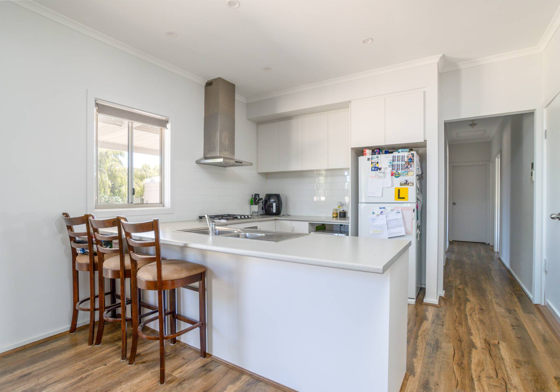 This modern 4 bedroom timber frame home presents beautifully throughout. The master bedroom includes an ensuite and walk-in robe, while bedrooms 2 and 3 feature built-in robes. The open plan kitchen, meals, and family area create a comfortable living space, complemented by a bathroom with bath, shower, vanity, and separate w/c, plus a functional laundry.