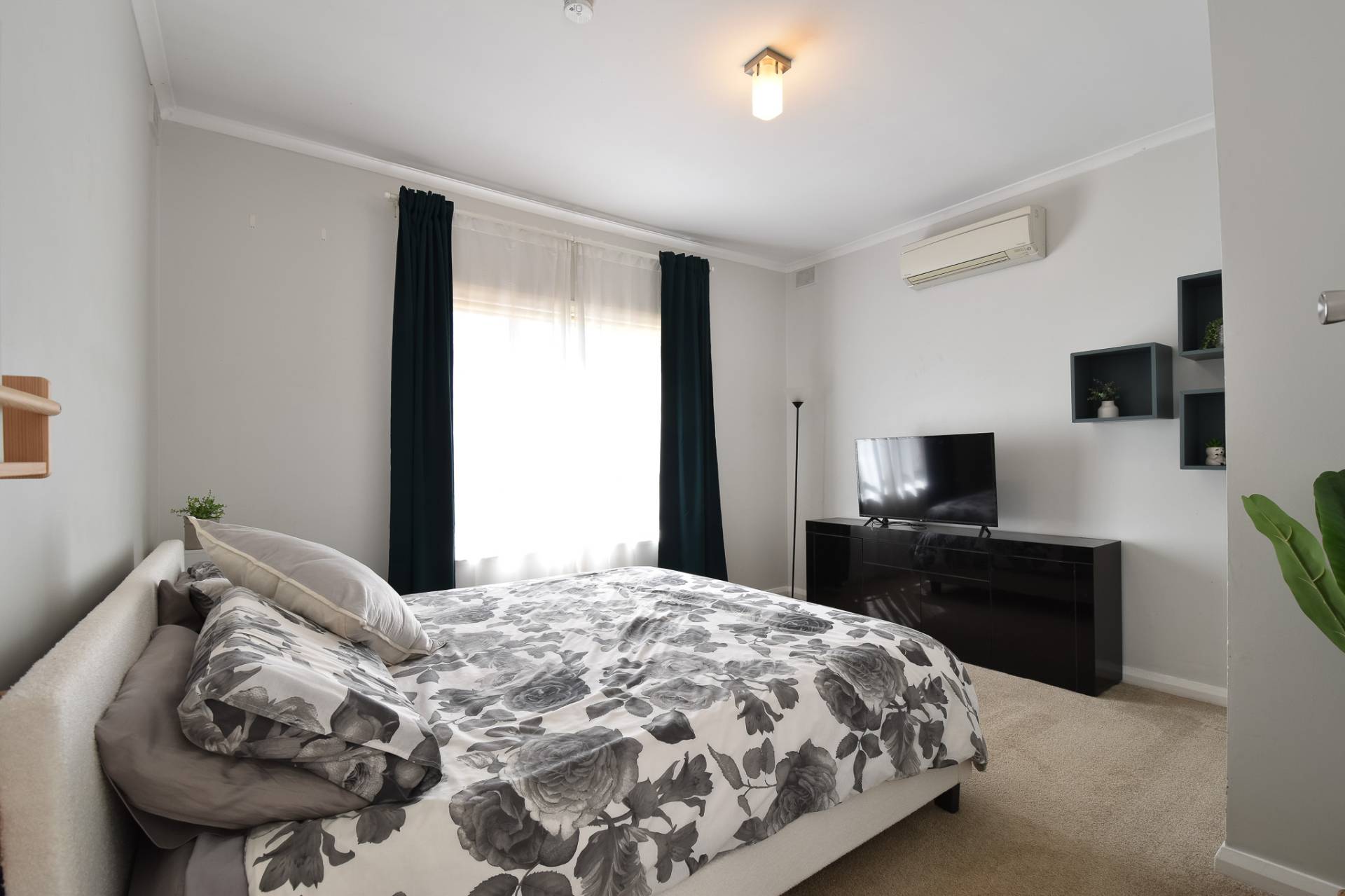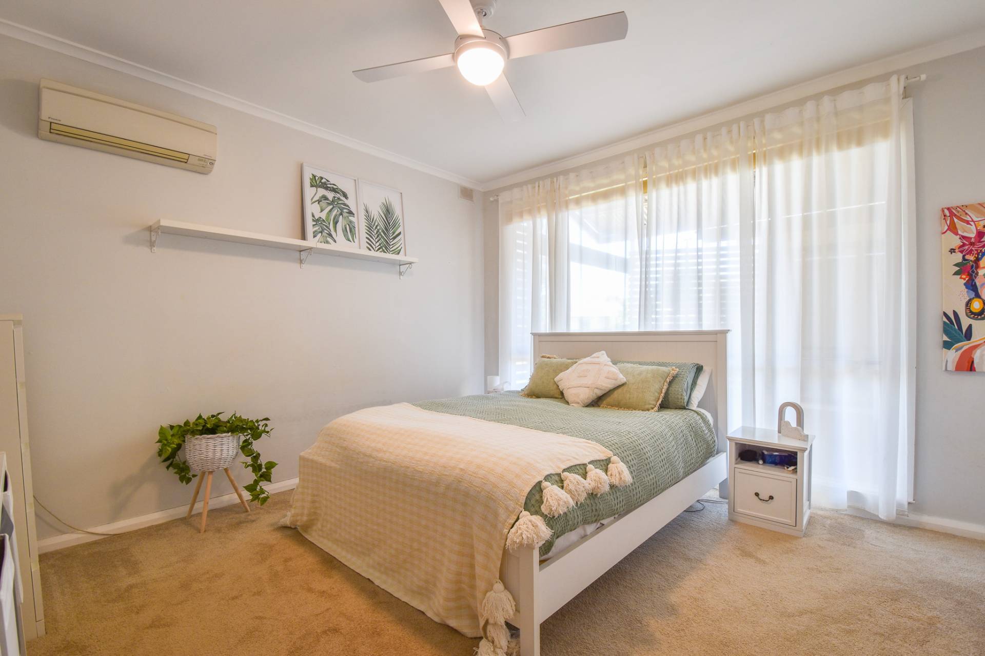 At the heart of the home is the light-filled kitchen/dining/lounge area, featuring a blend of carpet and tiled flooring and year-round comfort via split-system air conditioning. The kitchen is modern and functional, complete with laminate benchtops, quality cabinetry, electric cooktop, under-bench oven, rangehood, dishwasher, and double sink.