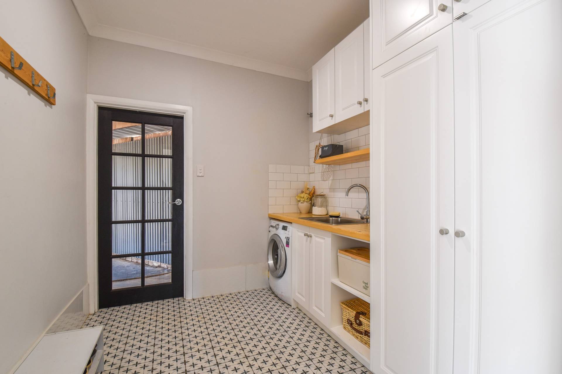 The laundry is well designed with a tiled floor, modern cabinetry and stainless steel trough.