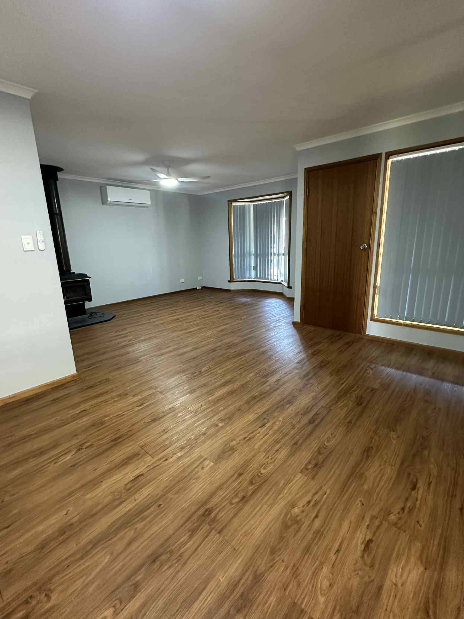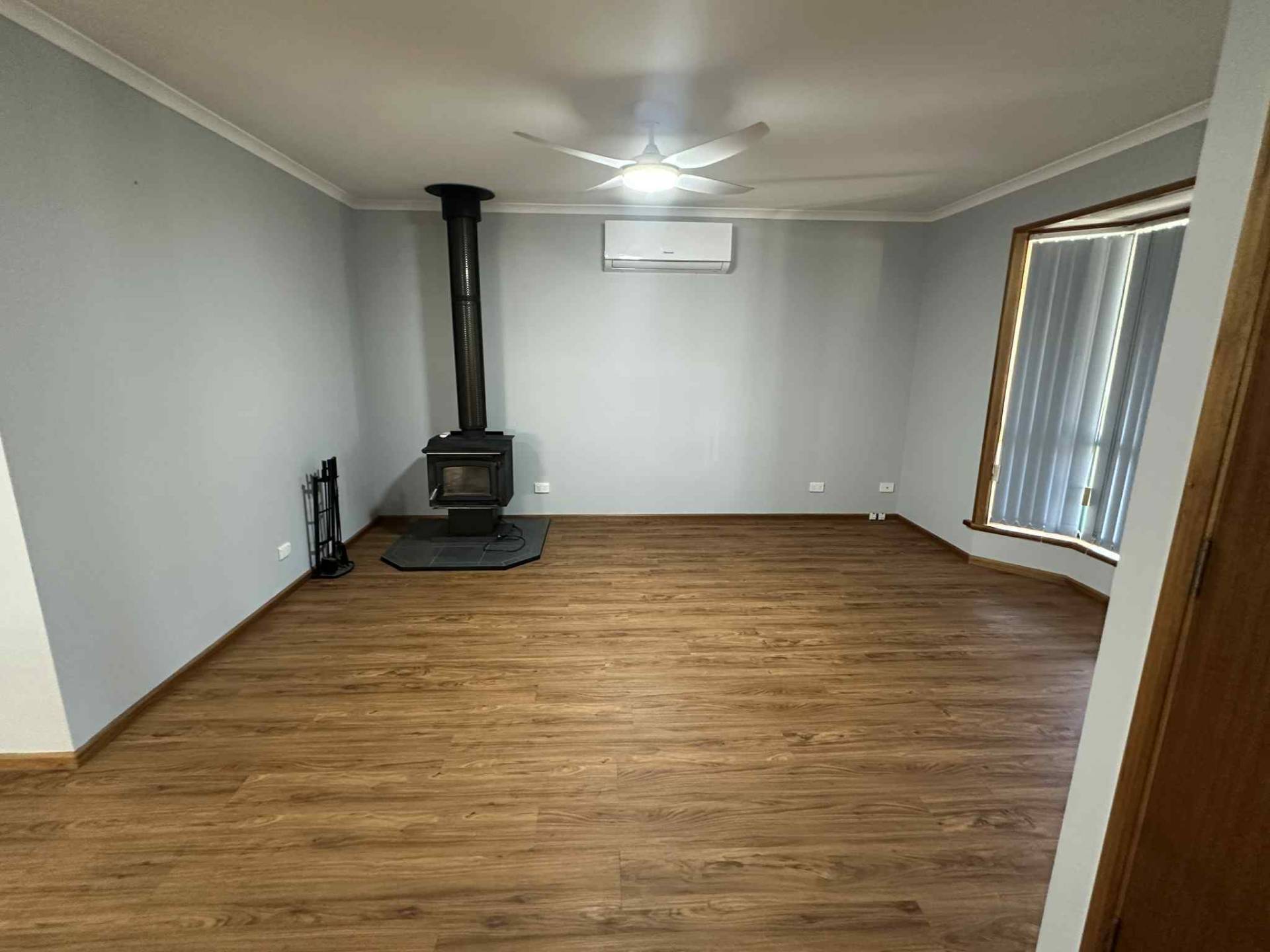 - Open-plan kitchen and living area featuring a cosy wood heater and efficient split-system air conditioning